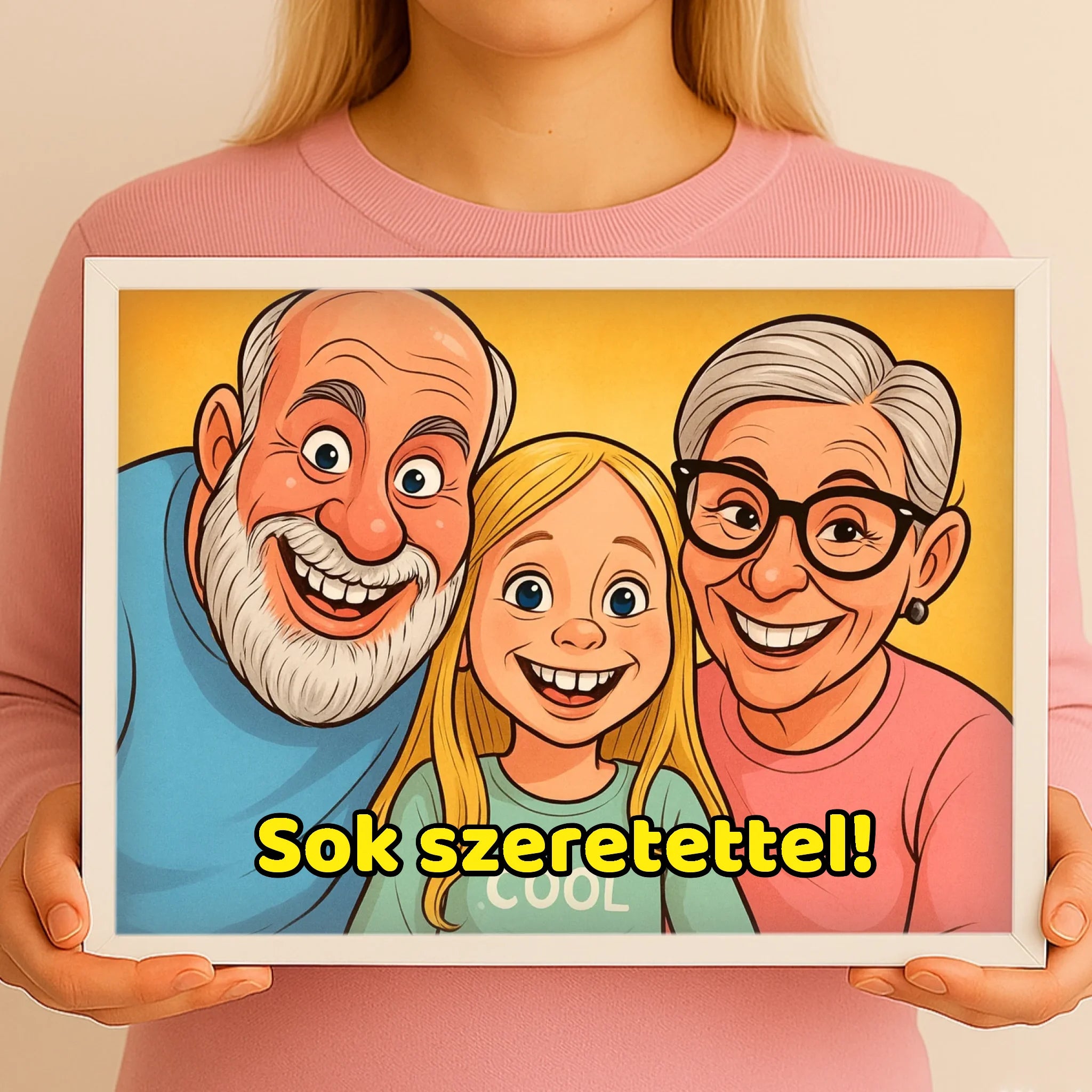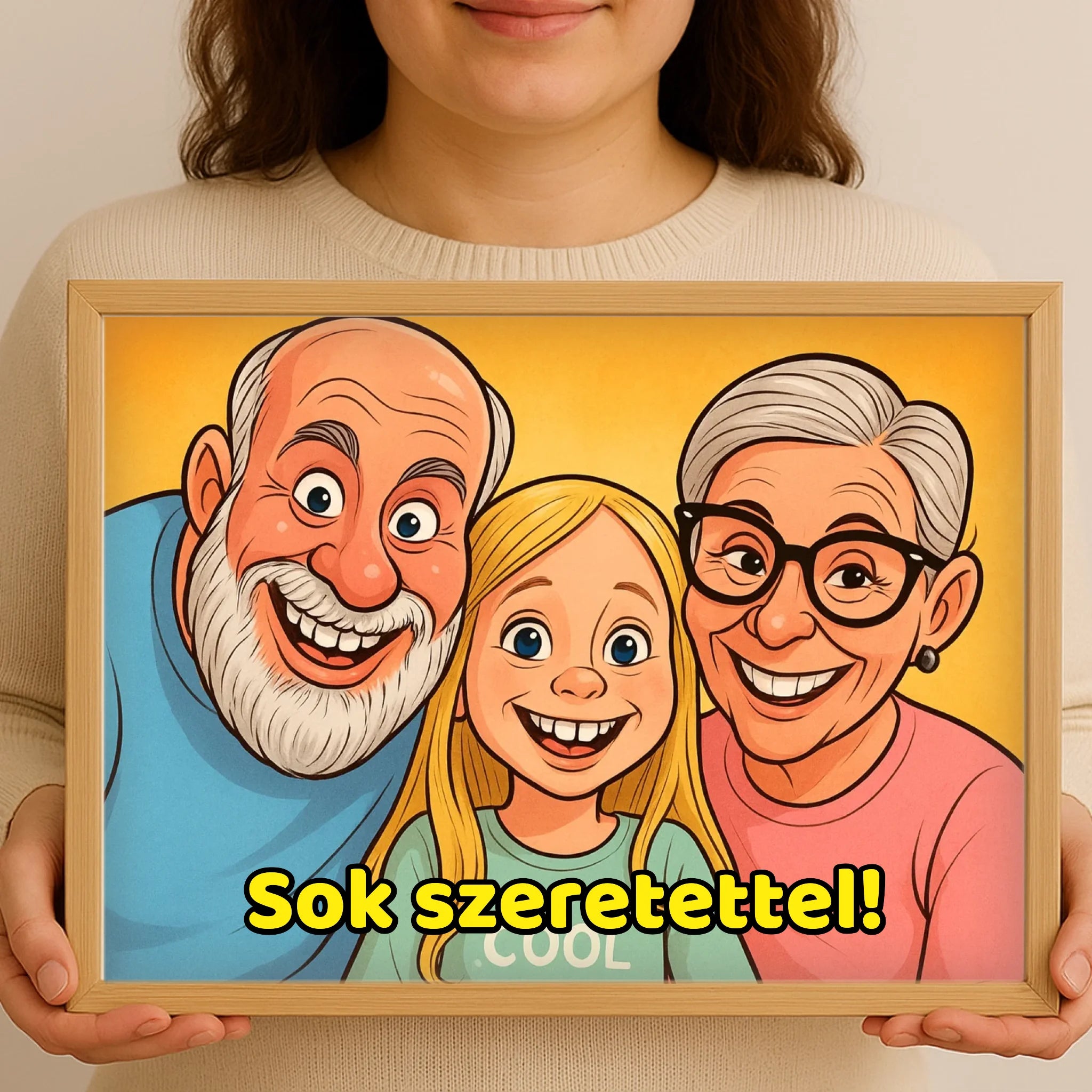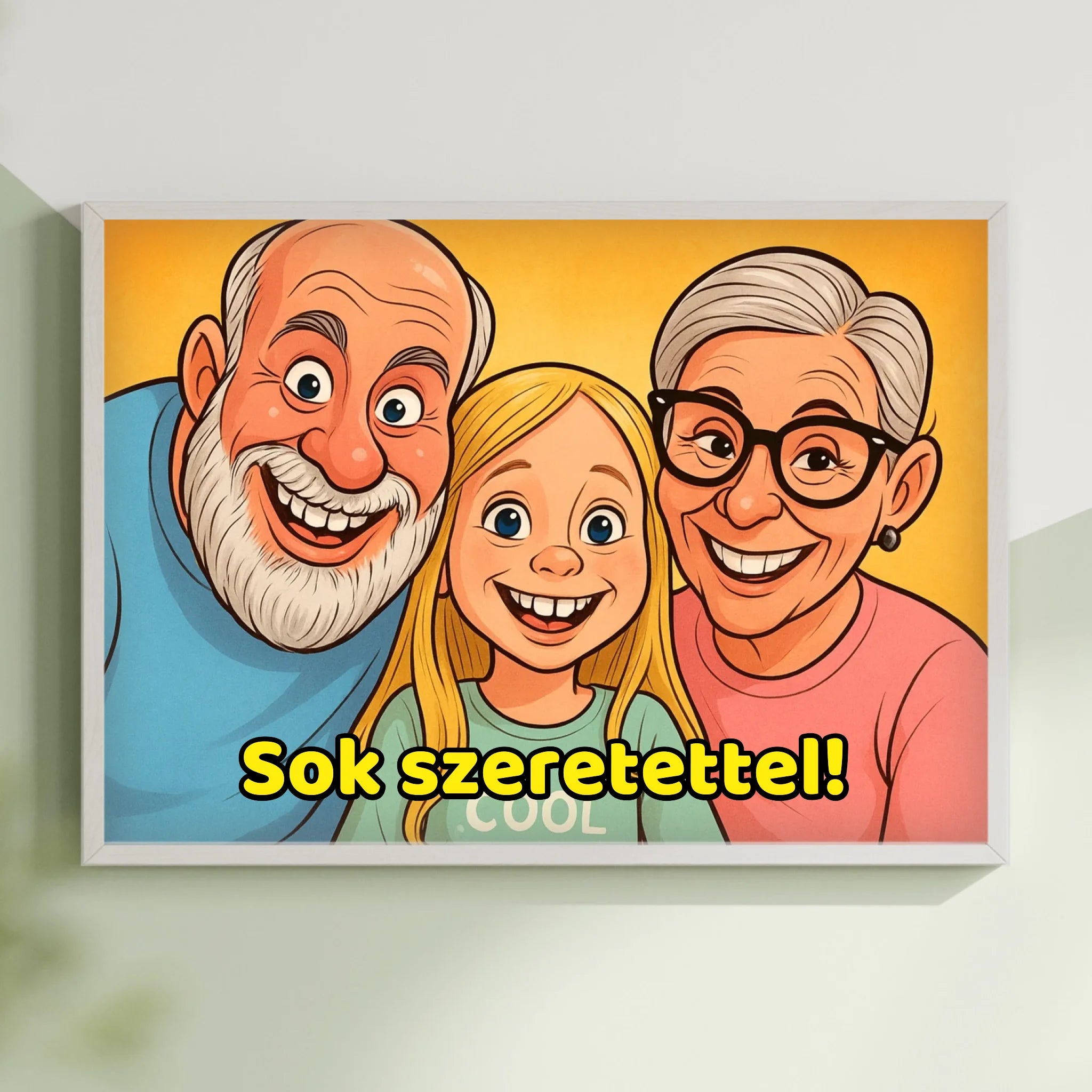 Stílusos, fekvő keretes falikép saját fotóból készült karikatúrával. Látványos, prémium dekoráció otthonra vagy ajándéknak.