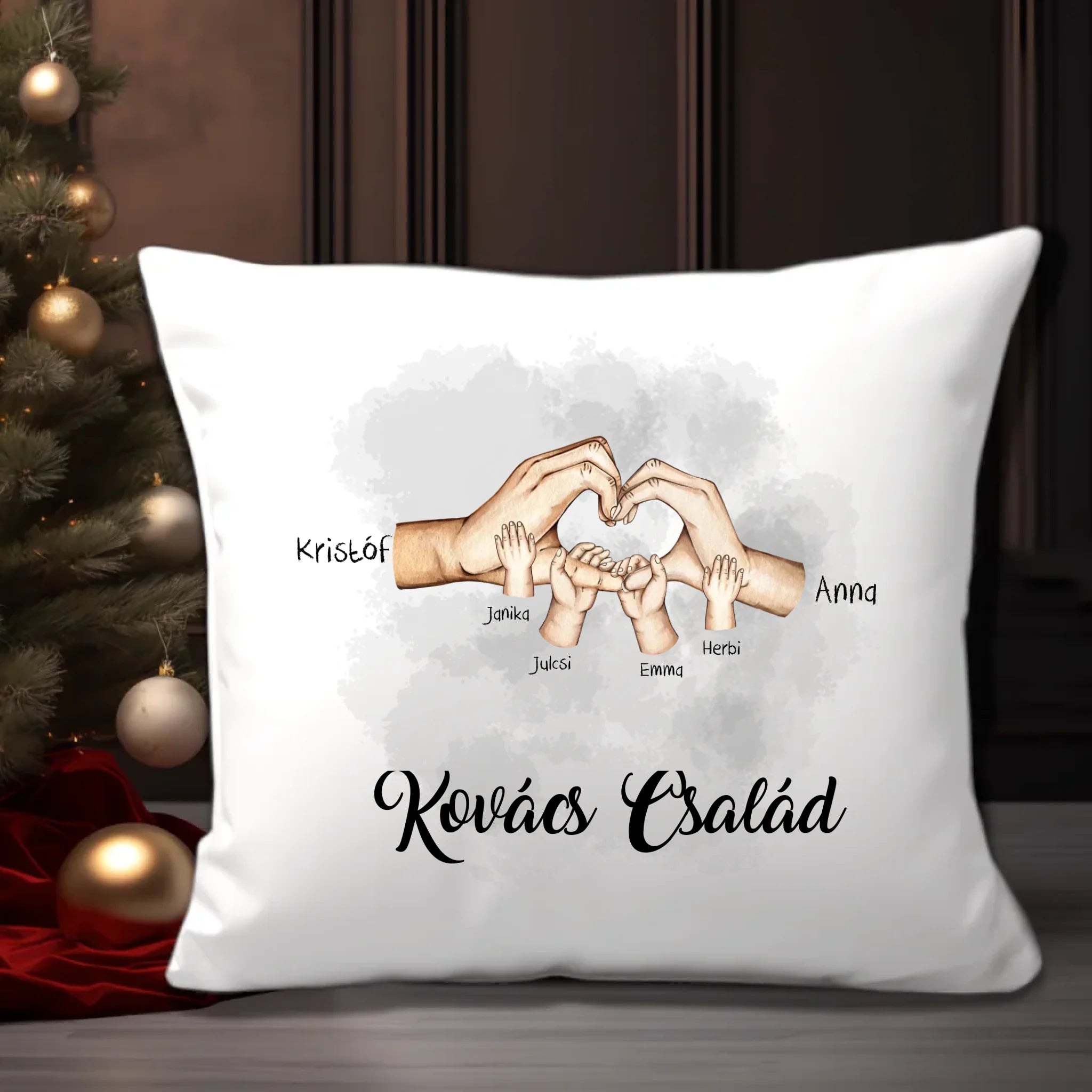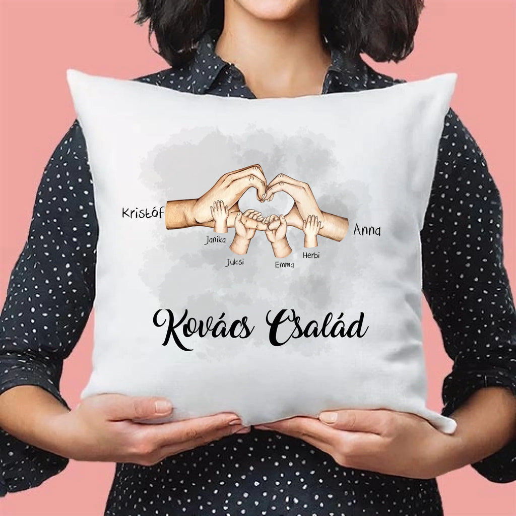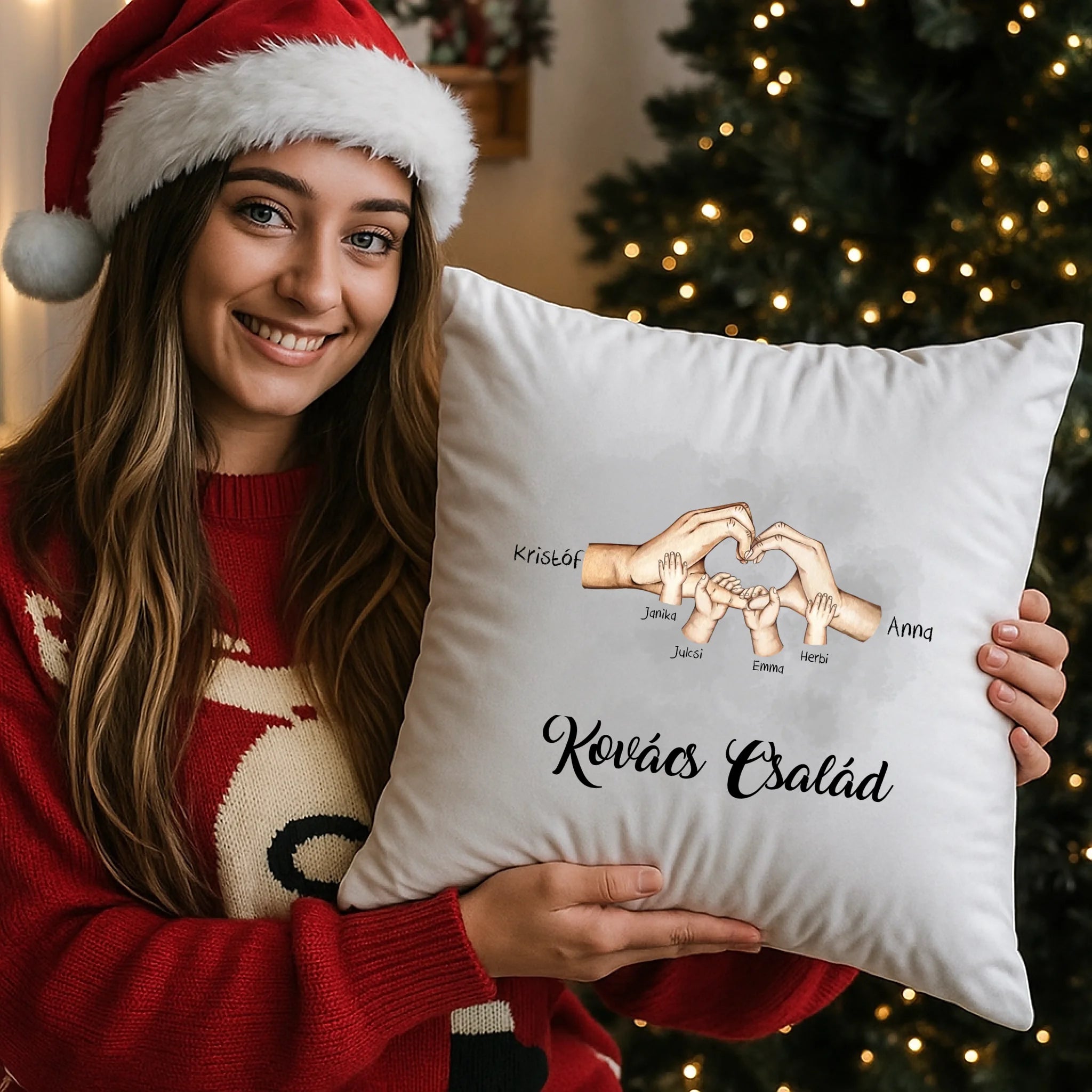 Személyre szabható családos párna kéz mintával és az általad megadott nevekkel. A személyek számát is Te adhatod meg!