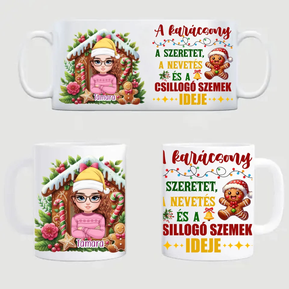 🎁 Tipp: Válaszd ki a karakter stílusát, és adj hozzá nevet vagy rövid, kedves feliratot! Egy személyre szabott, vidám és tartós ajándék, ami minden nőt örömmel tölt el az ünnepek alatt.