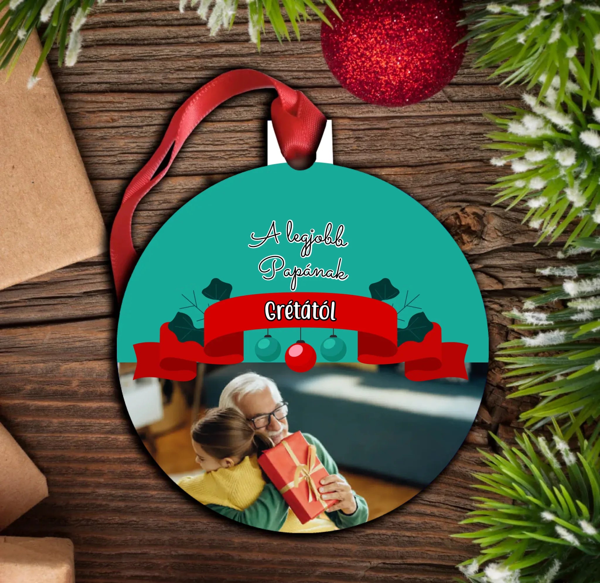 Ez a karácsonyfadísz préselt fa alapra készül, 7,5×8,5 cm-es, piros akasztóval, „A legjobb Papának” felirattal.