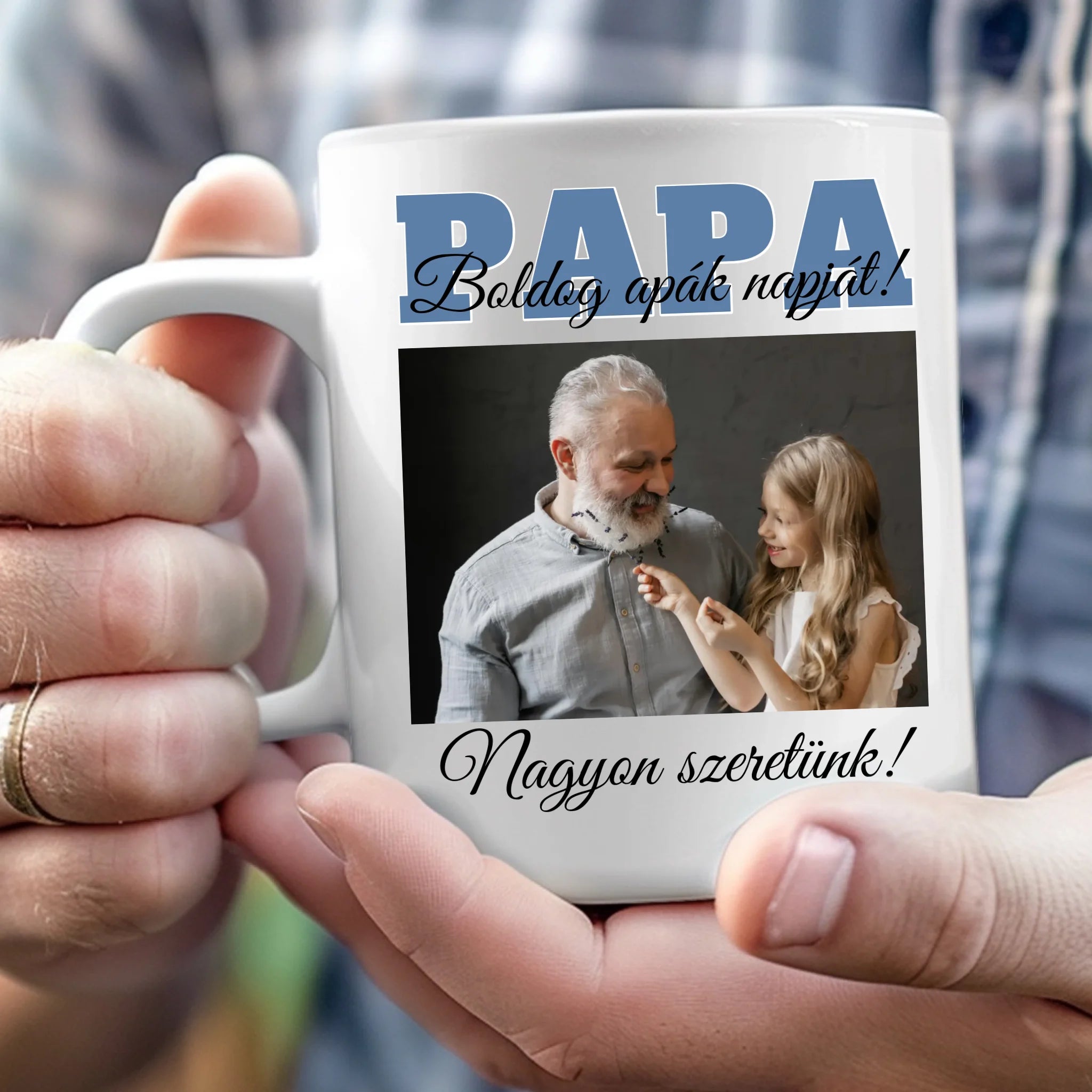Egyedi apák napi fényképes bögre a saját fotóddal. Az egyedi fényképes bögre remek ajándék Apák napjára és születésnapra is. Az egyedi bögre nyomtatása nagyon magas hőfokon történik, ezáltal az anyag szerkezetébe sütjük bele, így a nyomat rendkívül tartós lesz és nem kopik, nem fakul ki. A fényképes bögréhez bármilyen fotót választhatsz, illetve feliratot is adhatsz hozzá.