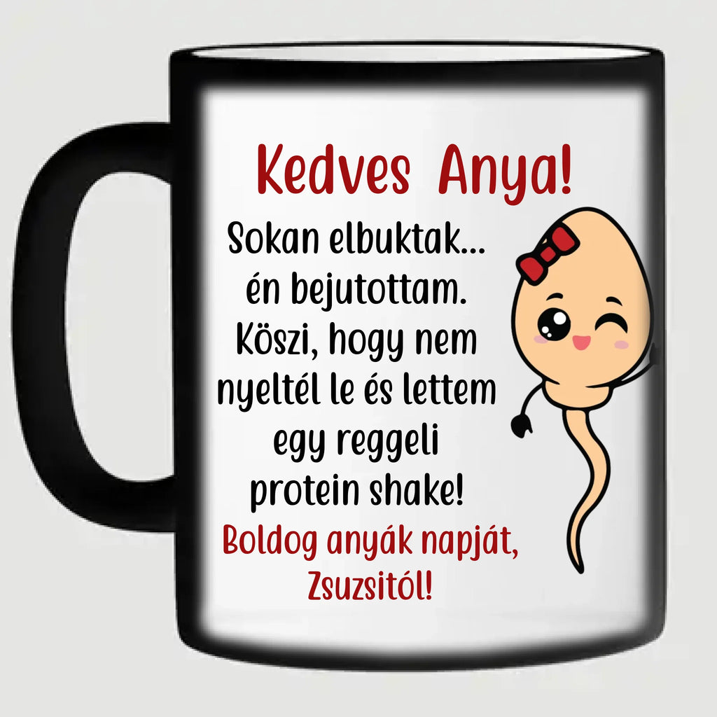 Egyedi anyák napi vicces bögre. Az egyedi vicces bögre remek ajándék Anyák napjára és születésnapra is. Az egyedi bögre nyomtatása nagyon magas hőfokon történik, ezáltal az anyag szerkezetébe sütjük bele, így a nyomat rendkívül tartós lesz és nem kopik, nem fakul ki. A fényképes bögréhez bármilyen fotót választhatsz, illetve feliratot is adhatsz hozzá.