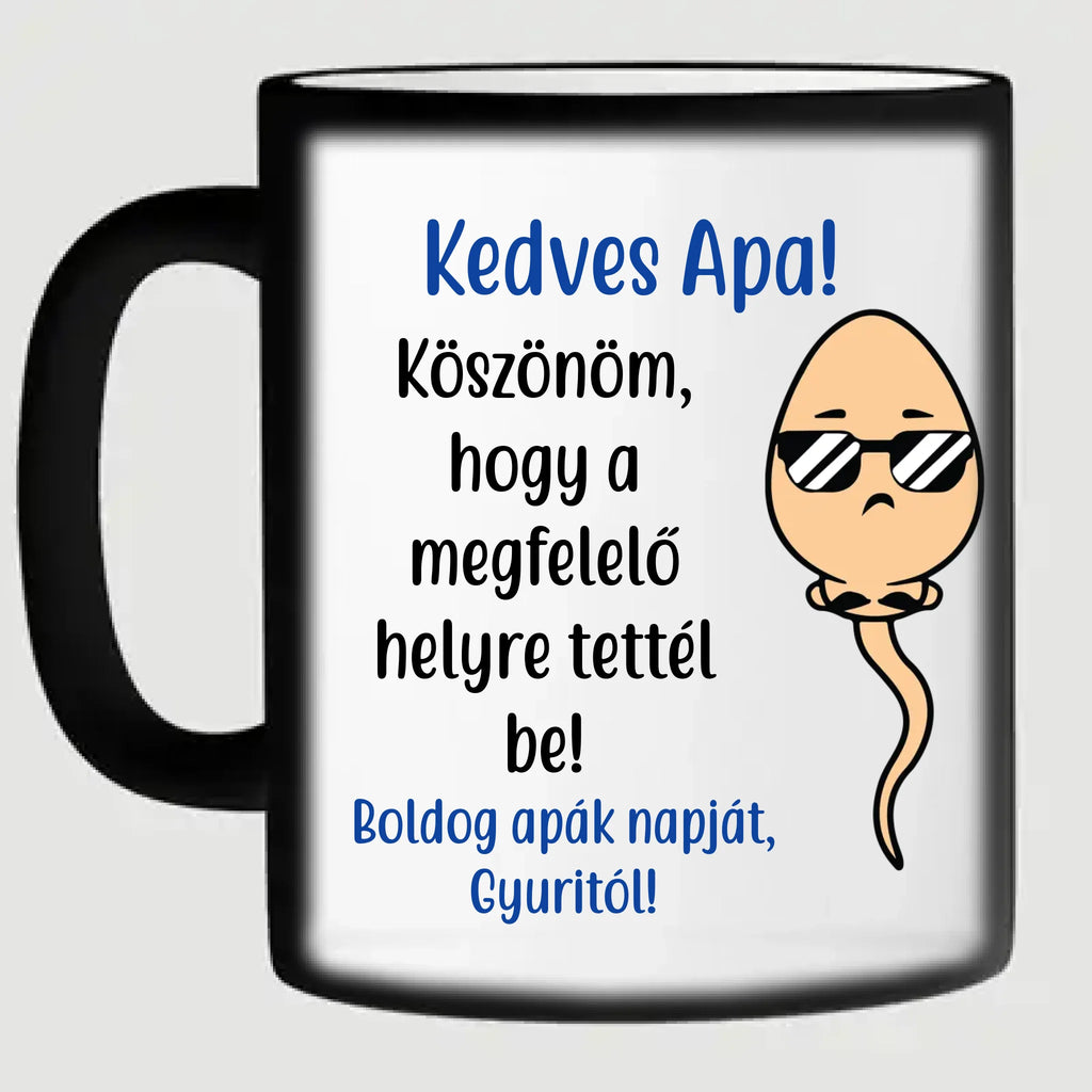 Egyedi apák napi vicces bögre a saját fotóddal. Az egyedi vicces bögre remek ajándék Apák napjára és születésnapra is. Az egyedi bögre nyomtatása nagyon magas hőfokon történik, ezáltal az anyag szerkezetébe sütjük bele, így a nyomat rendkívül tartós lesz és nem kopik, nem fakul ki. A fényképes bögréhez bármilyen fotót választhatsz, illetve feliratot is adhatsz hozzá.