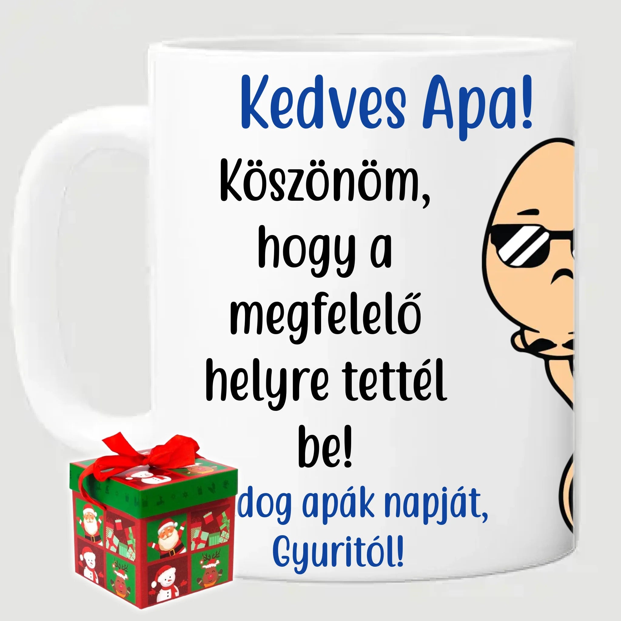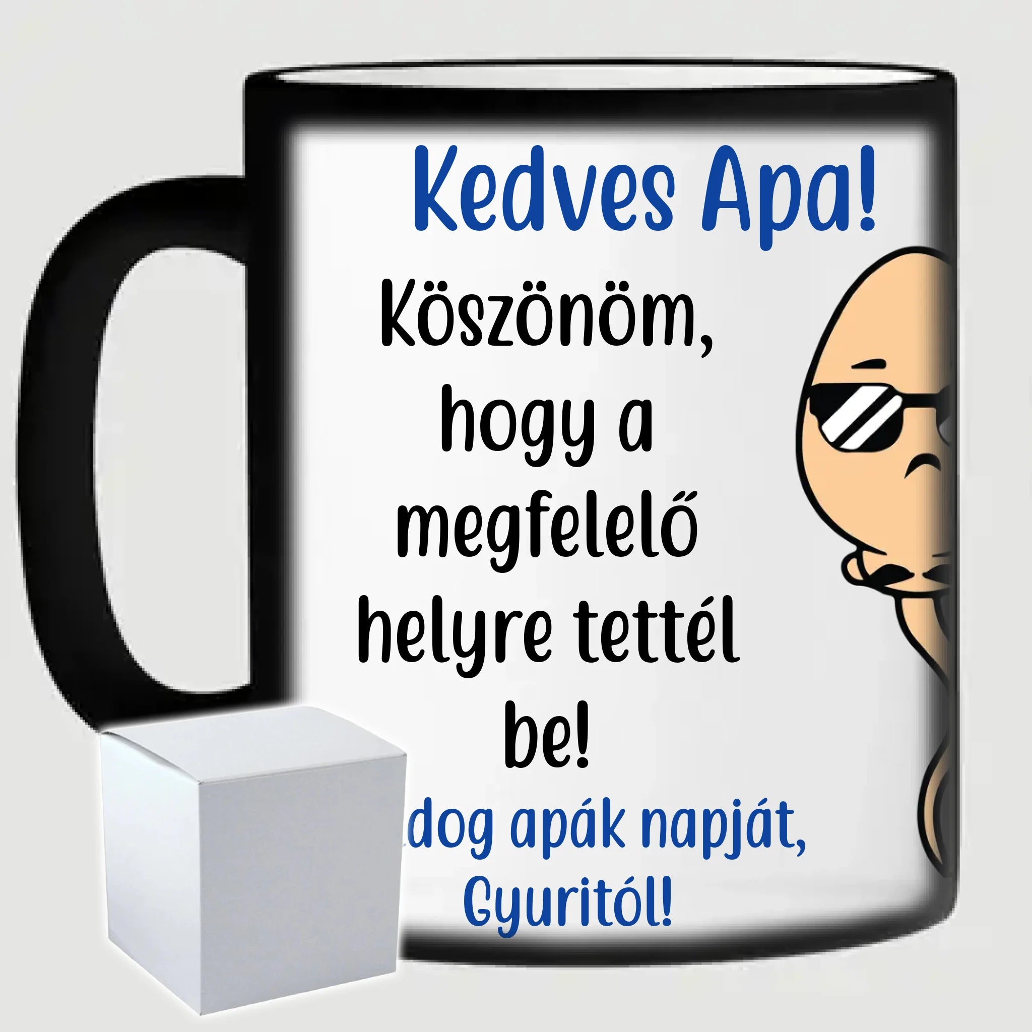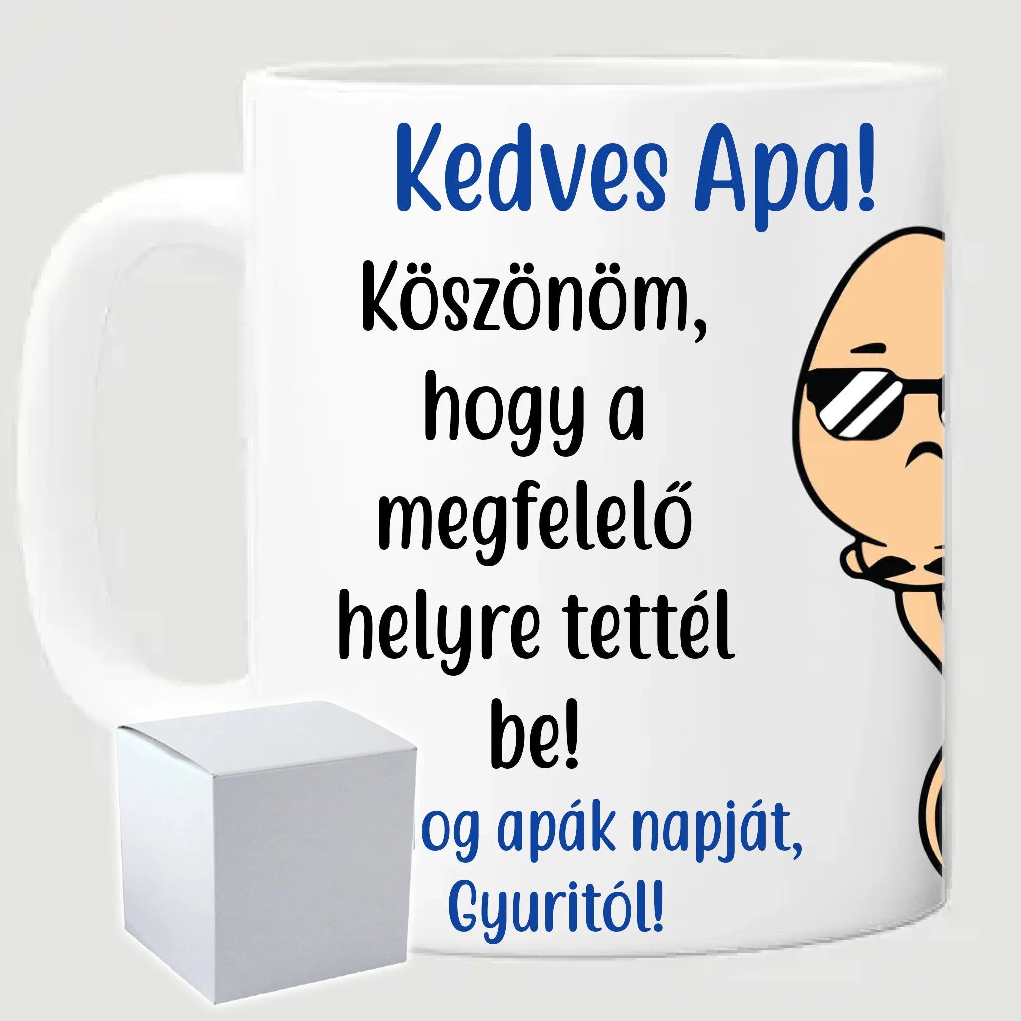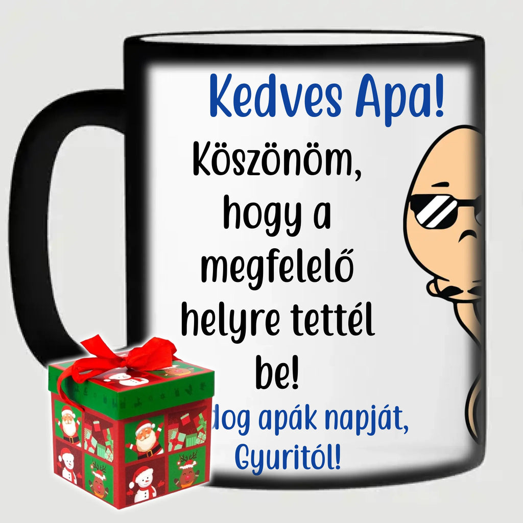 Egyedi apák napi vicces bögre a saját fotóddal. Az egyedi vicces bögre remek ajándék Apák napjára és születésnapra is. Az egyedi bögre nyomtatása nagyon magas hőfokon történik, ezáltal az anyag szerkezetébe sütjük bele, így a nyomat rendkívül tartós lesz és nem kopik, nem fakul ki. A fényképes bögréhez bármilyen fotót választhatsz, illetve feliratot is adhatsz hozzá.