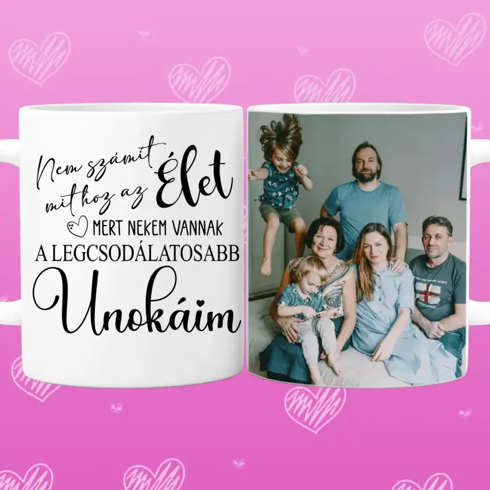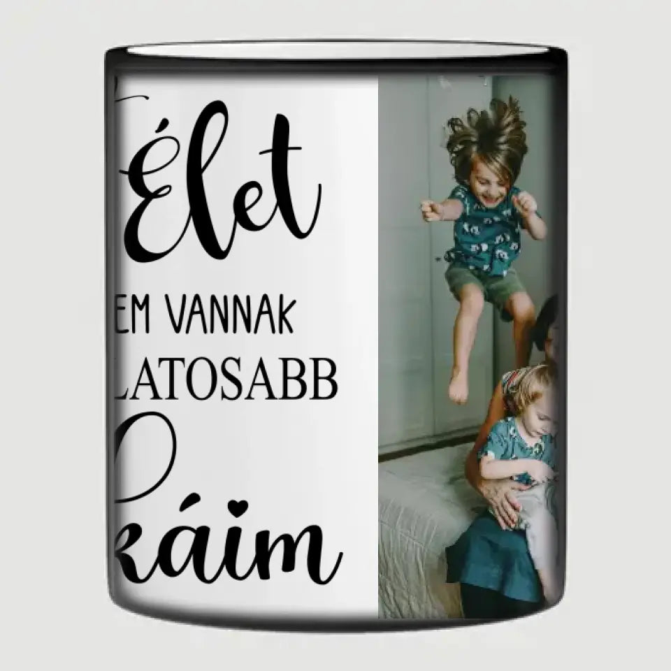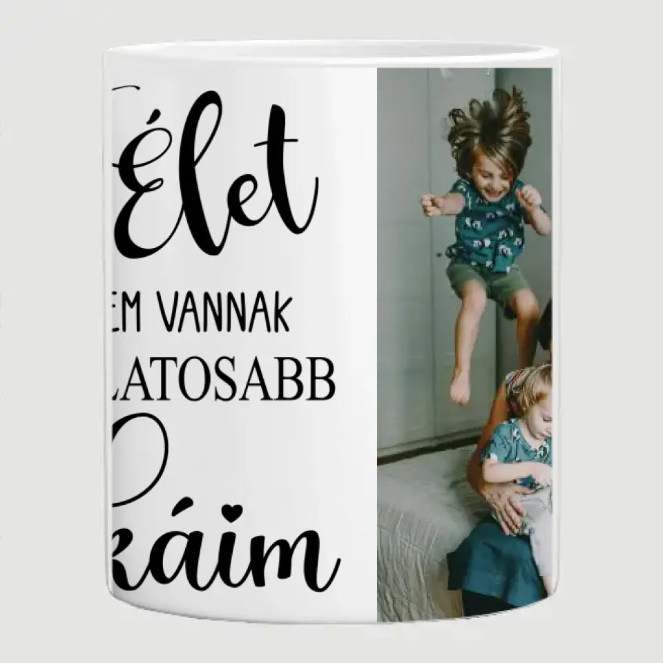 Egyedi fényképes bögre a saját fotóddal. Az egyedi fényképes bögre mamának remek meglepetés bármilyen alkalomra, legyen szó anyák napjáról vagy a mama születésnapi ajándékáról. Az egyedi bögre nyomtatása nagyon magas hőfokon történik, ezáltal az anyag szerkezetébe sütjük bele, így a nyomat rendkívül tartós lesz és nem kopik, nem fakul ki. A fényképes bögréhez bármilyen fotót választhatsz, illetve feliratot is adhatsz hozzá.