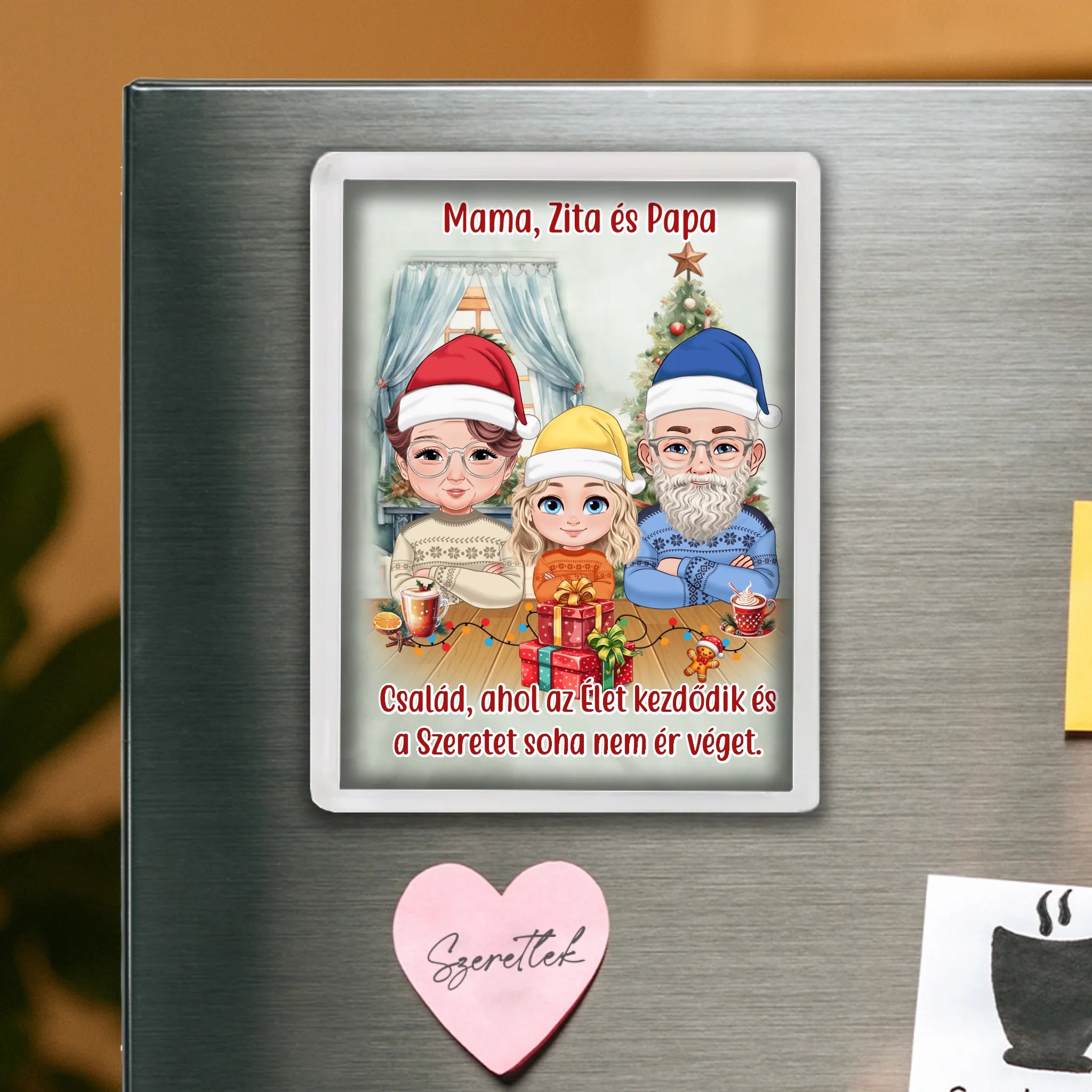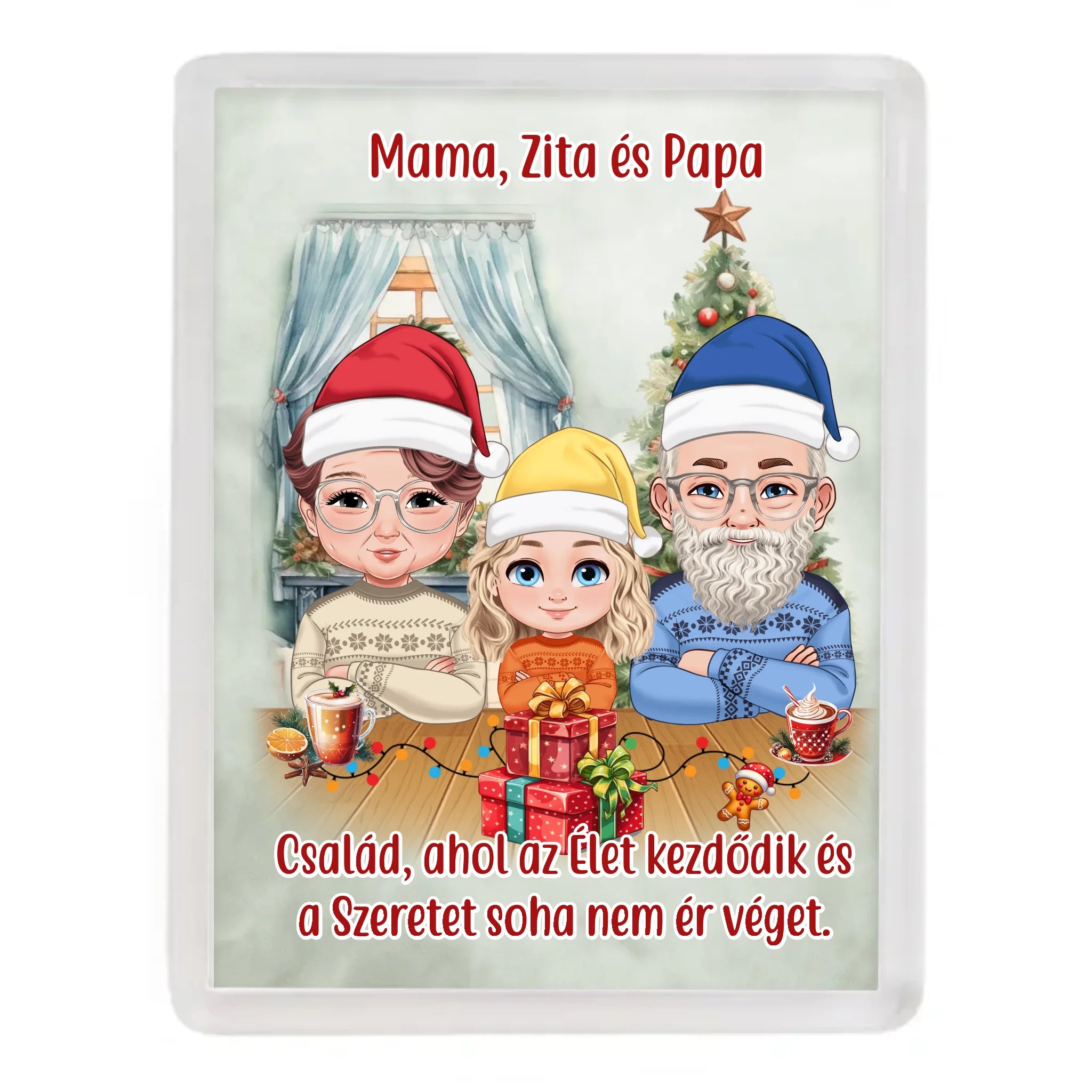 Egyedi karácsonyi hűtőmágnes nagyszülők és gyerekek minta