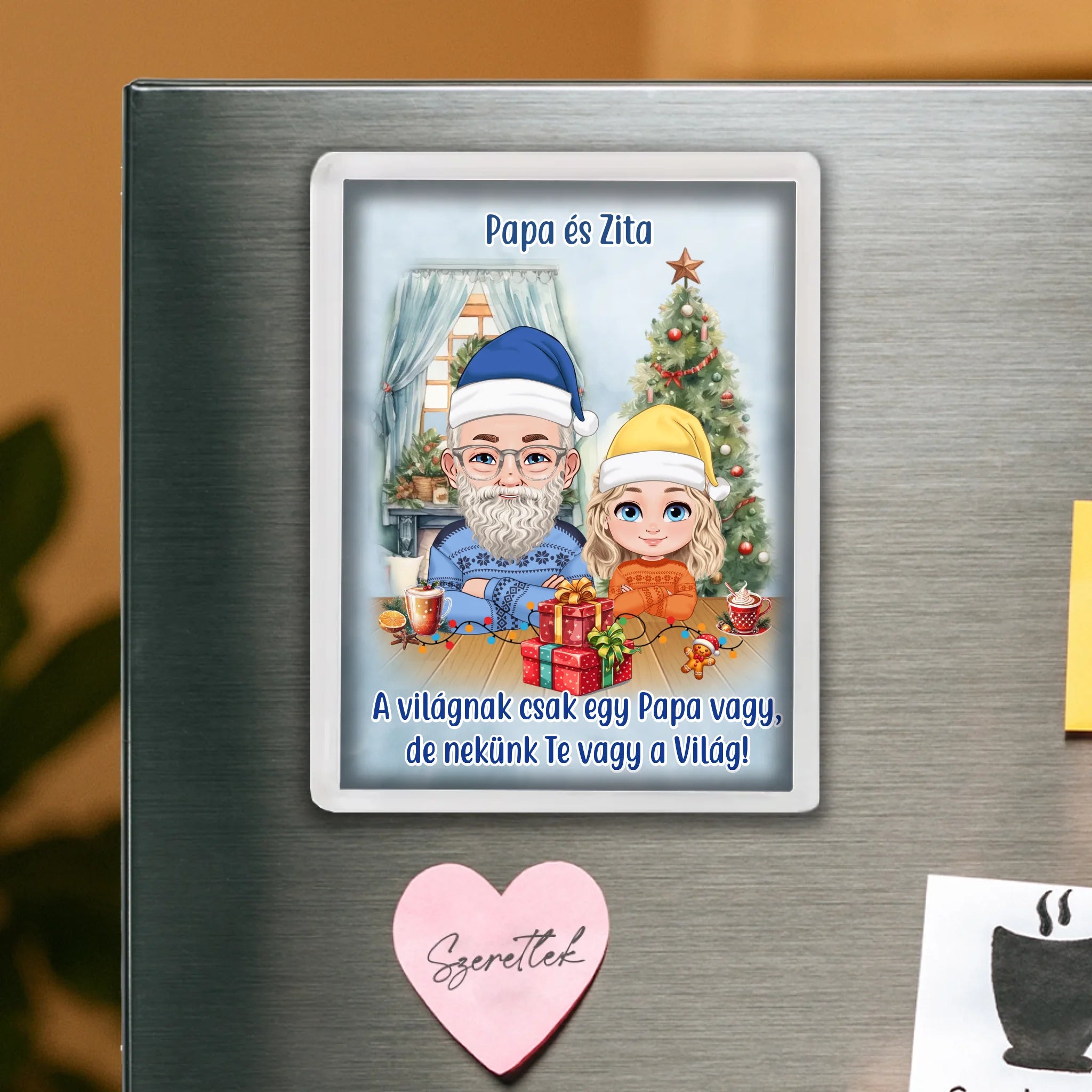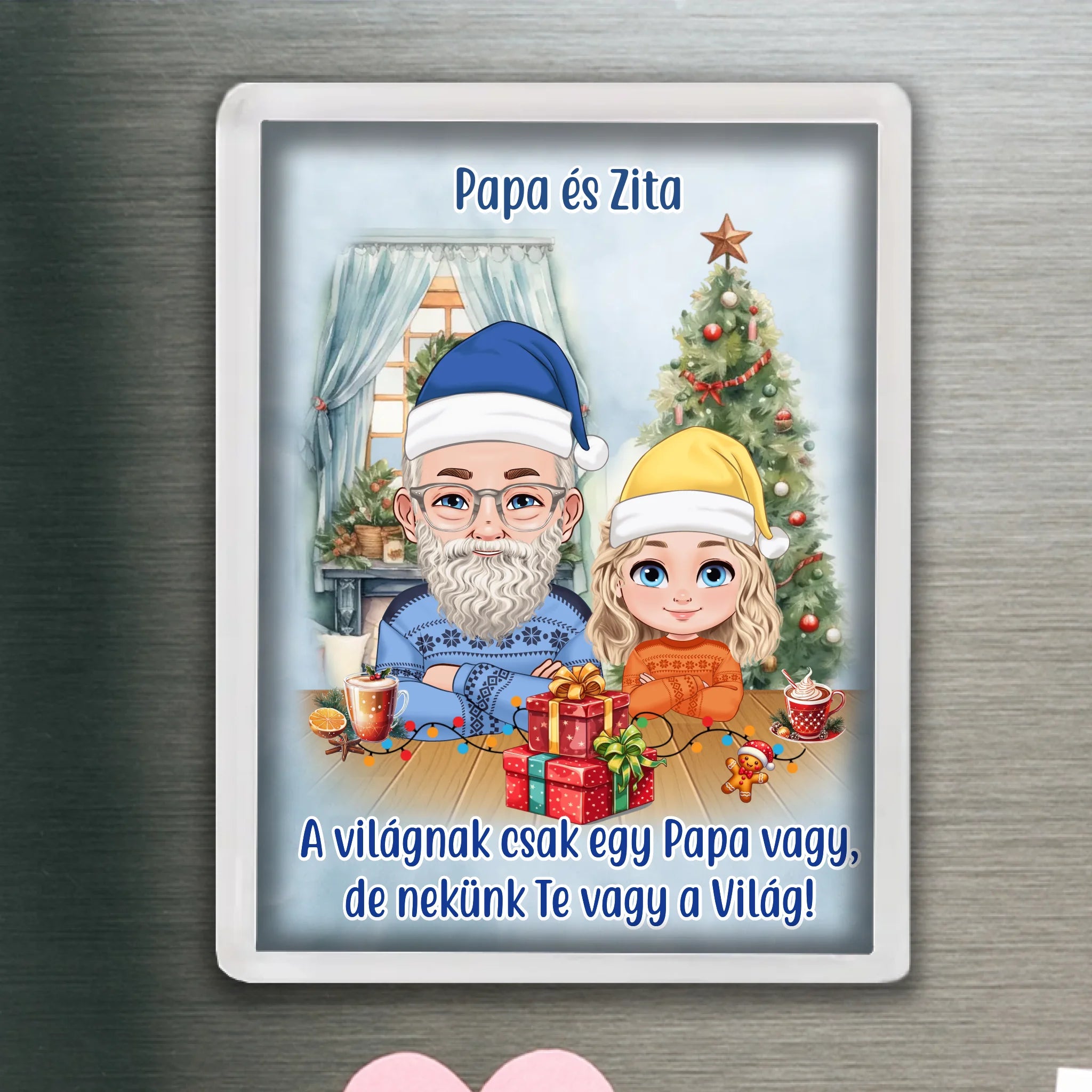 Egyedi karakteres hűtőmágnes a személyre szabható mintával. Az egyedi karácsonyi hűtőmágnes remek ajándék családtagoknak, barátoknak, kollégáknak.