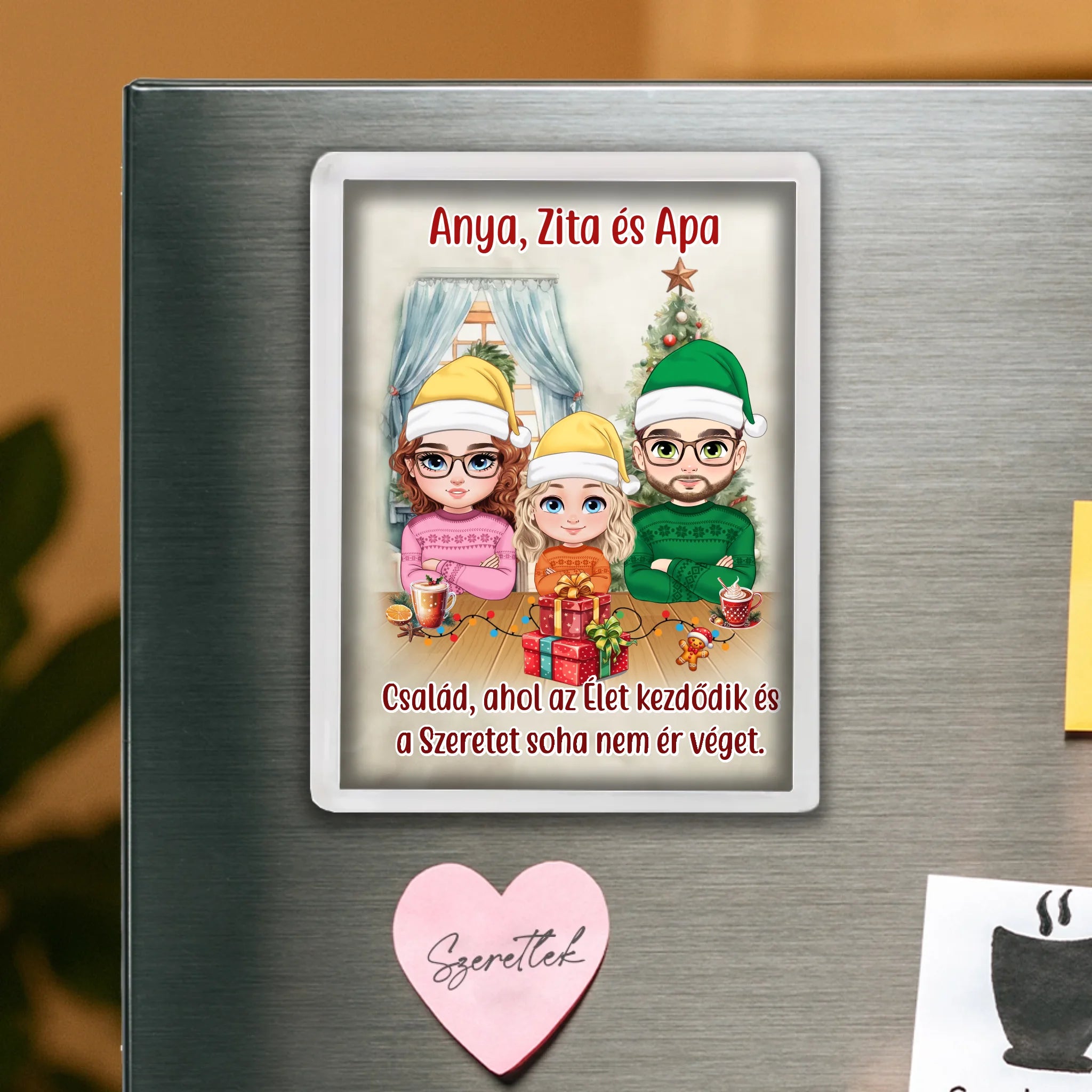 Egyedi karakteres hűtőmágnes a személyre szabható mintával. Az egyedi karácsonyi hűtőmágnes remek ajándék családtagoknak, barátoknak, kollégáknak.