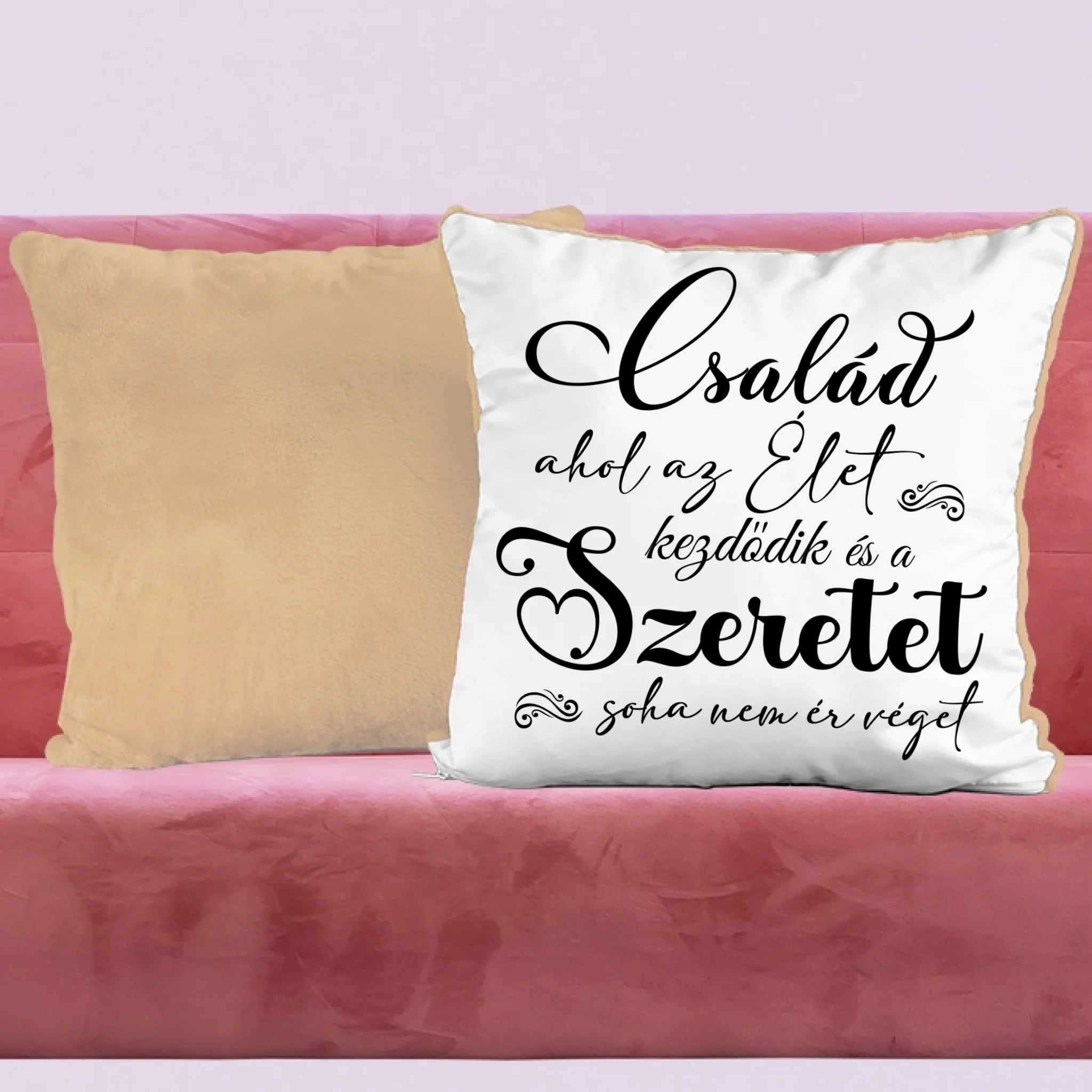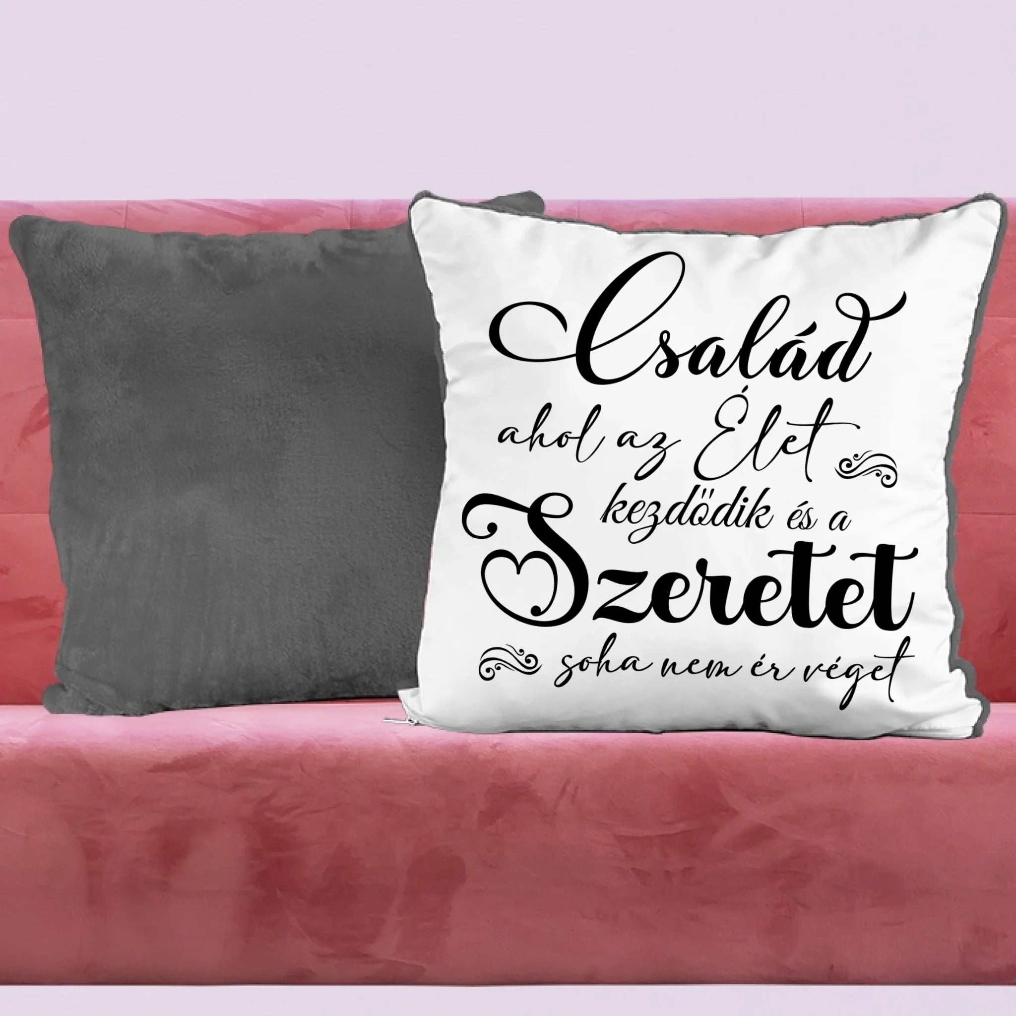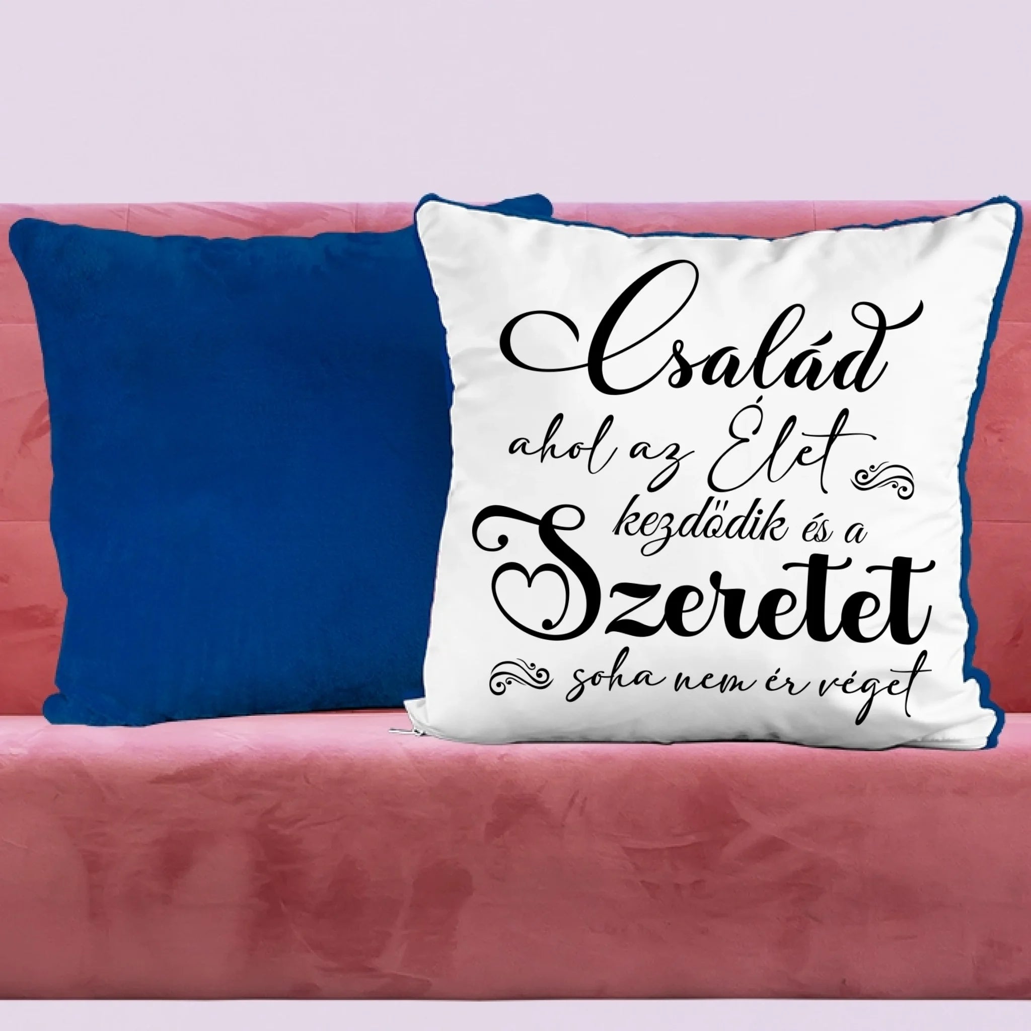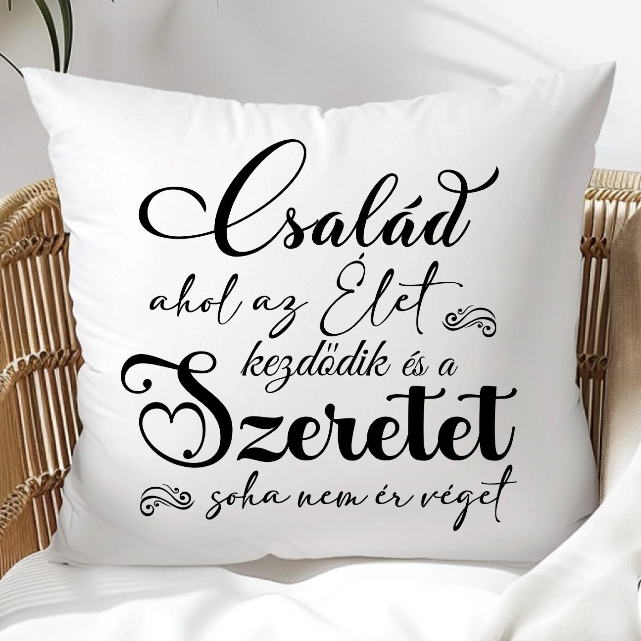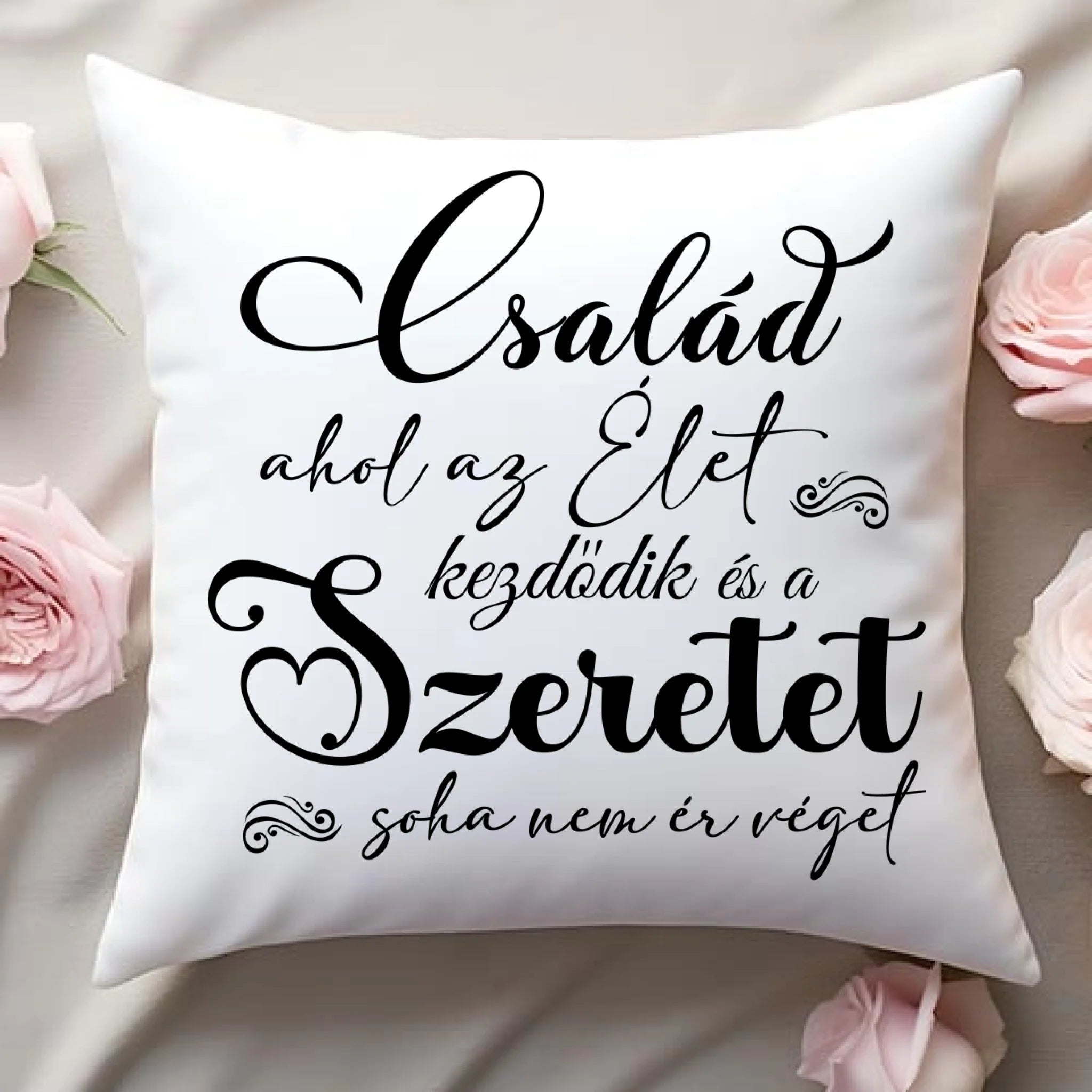 Család ahol az élet kezdődik és a szeretet soha nem ér véget párna személyre szabható mintával és képpel