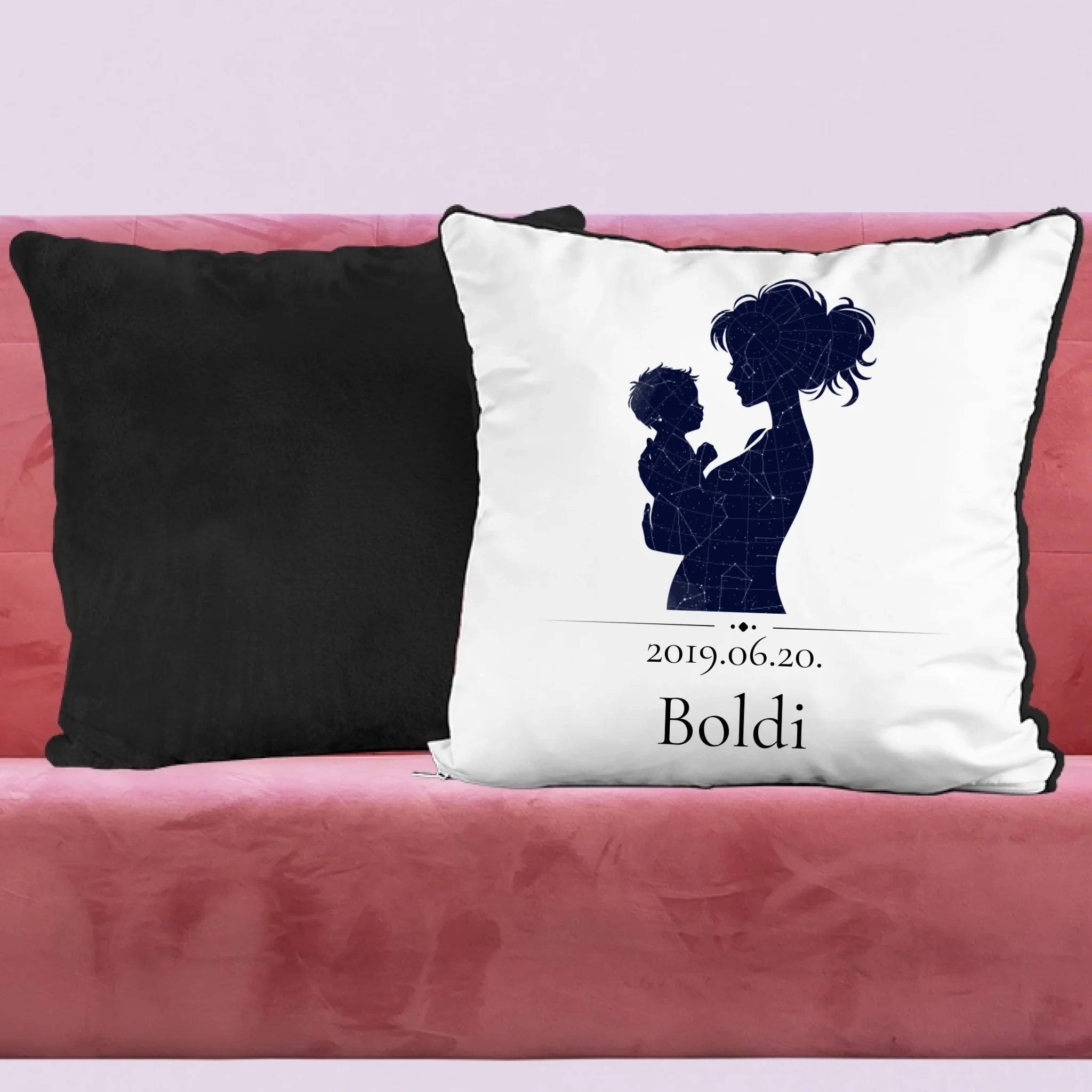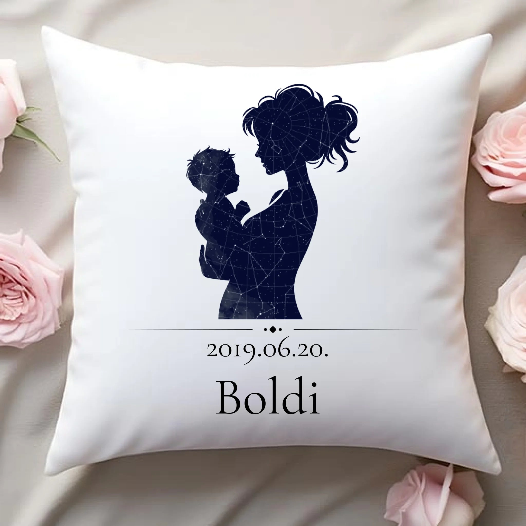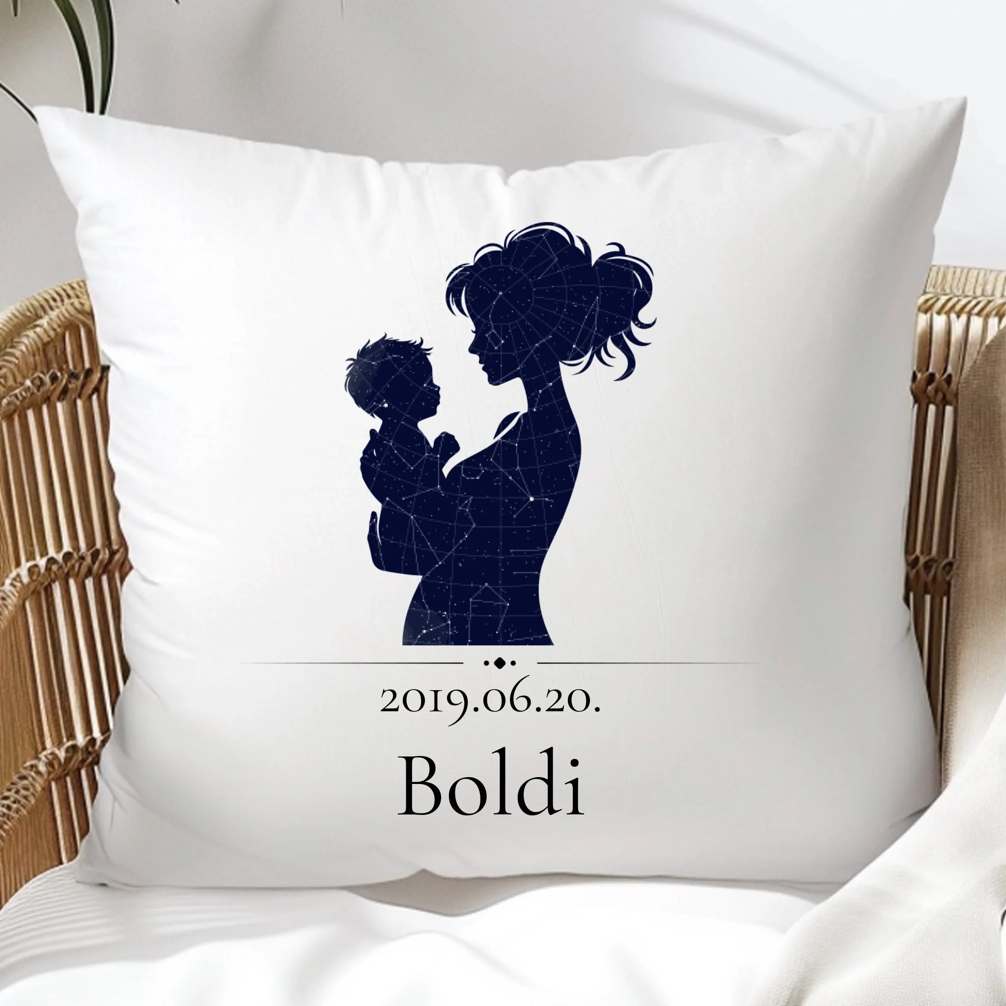 Egyedi csillagtréképes párna, mely az általad megadott adatok alapján mutatja be a fontos dátumkor látható égboltot egy anya és gyermeke sziluettjében.