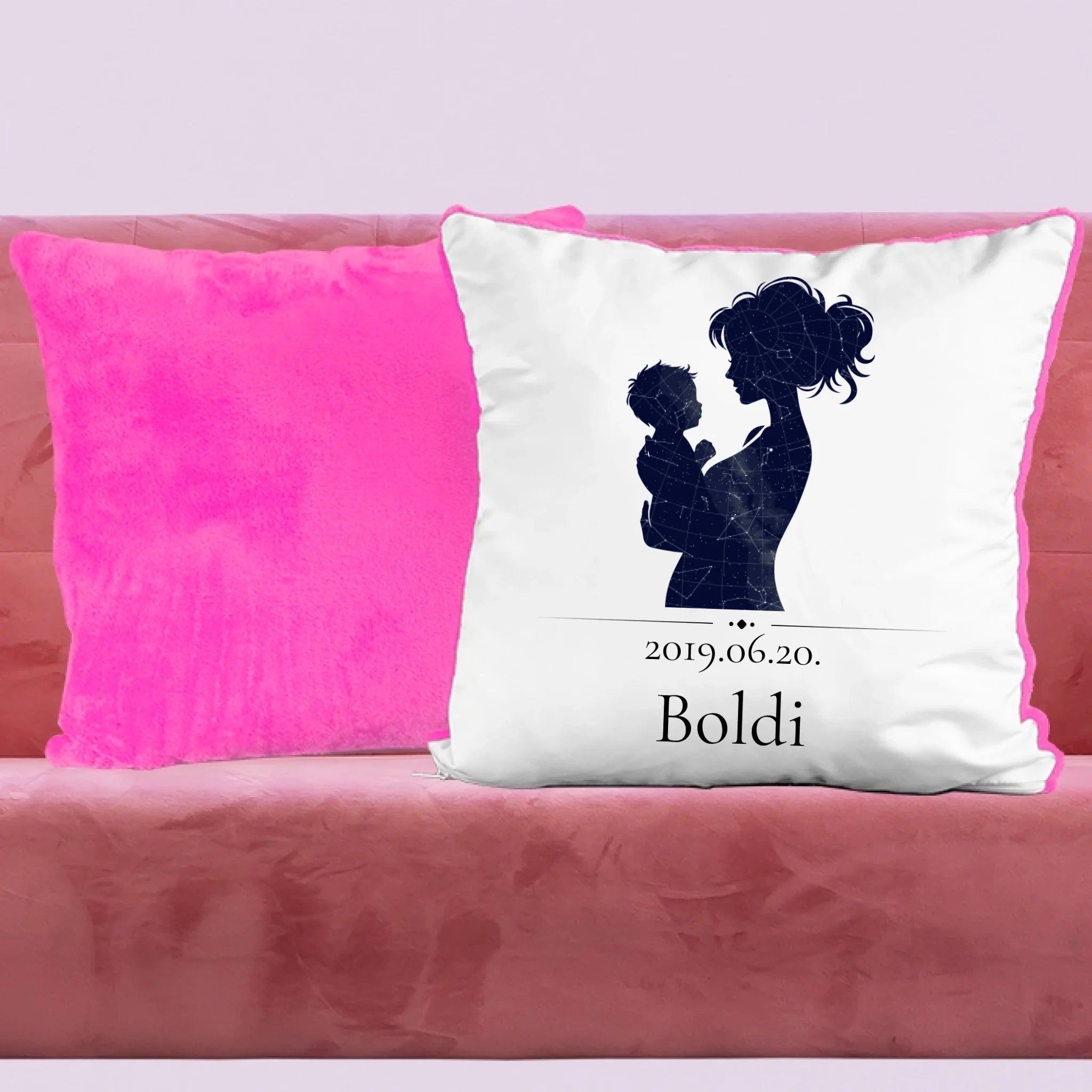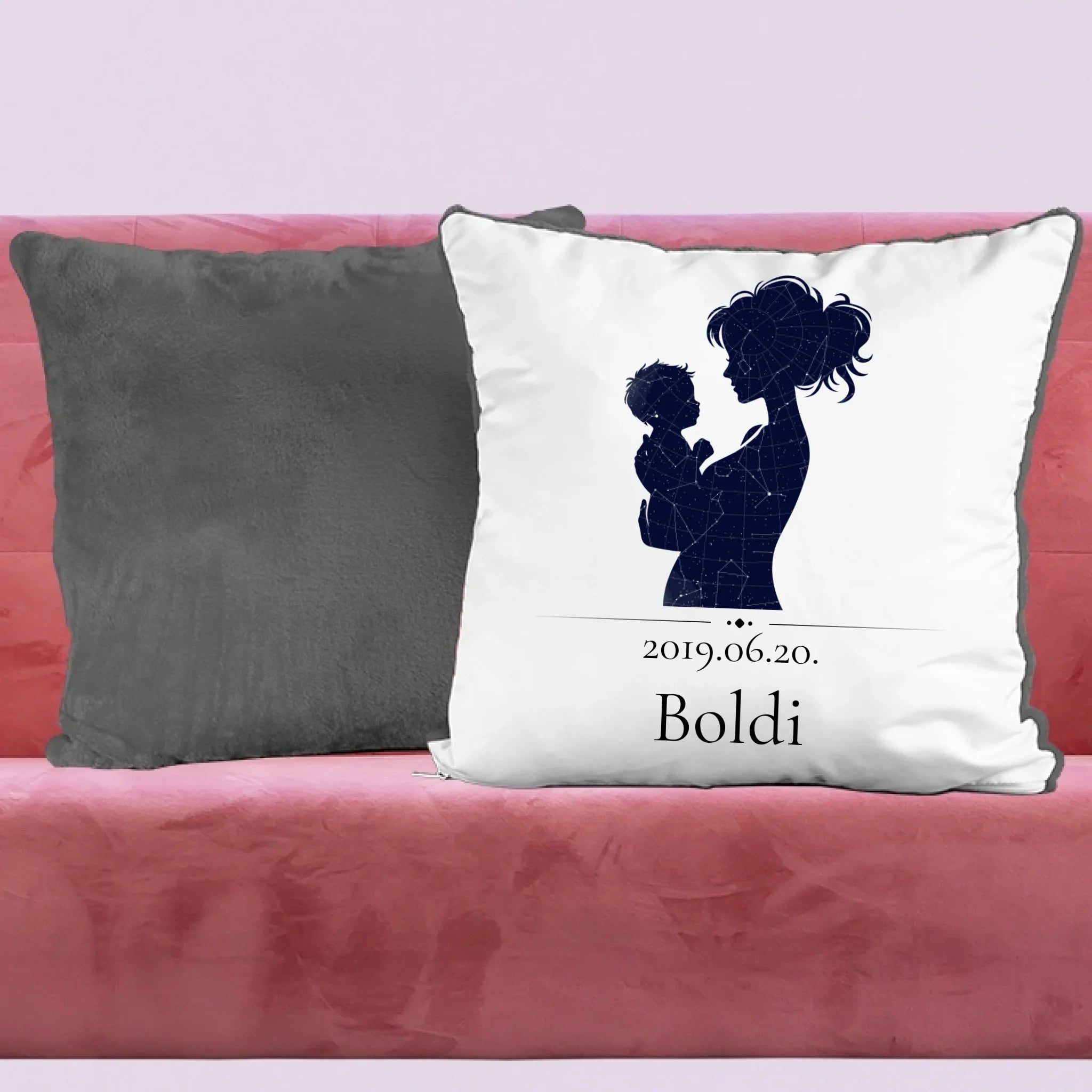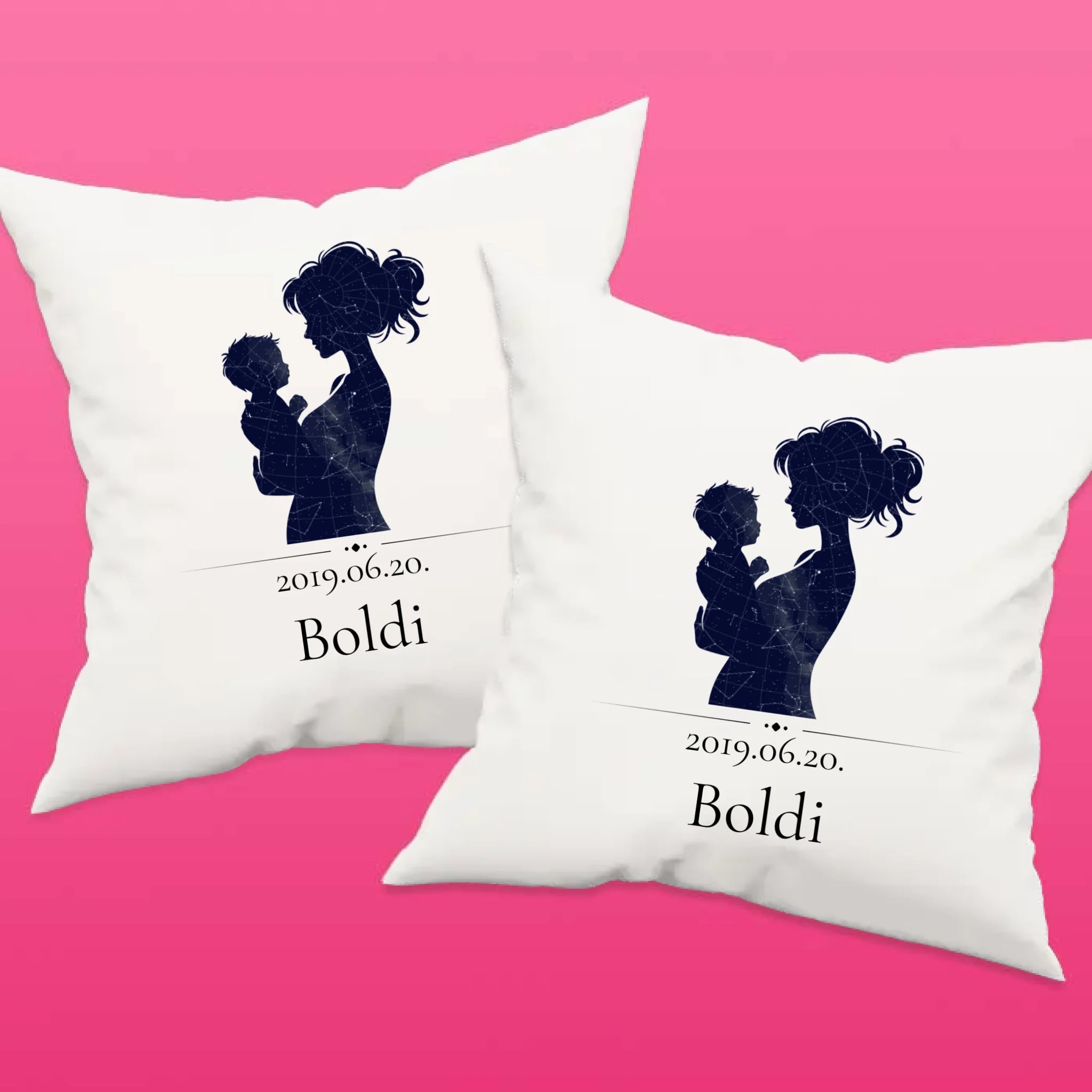 Egyedi csillagtréképes párna, mely az általad megadott adatok alapján mutatja be a fontos dátumkor látható égboltot egy anya és gyermeke sziluettjében.