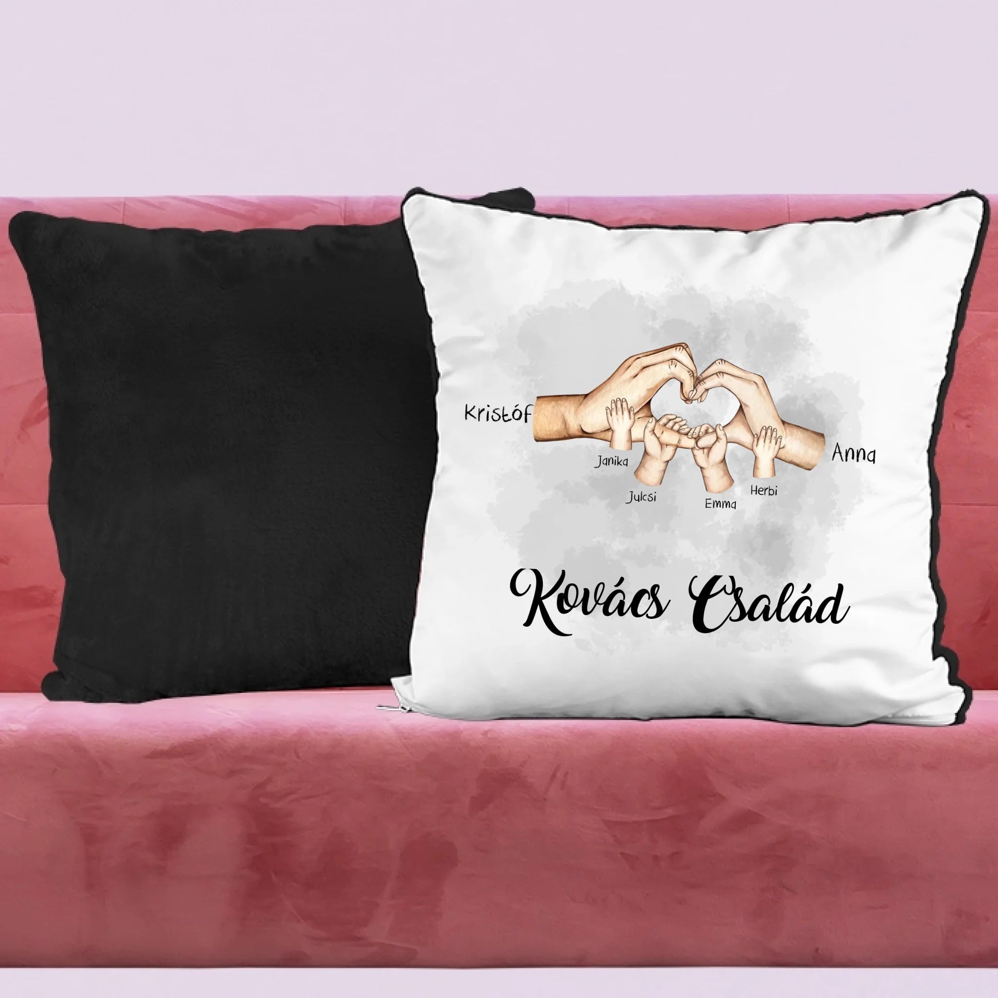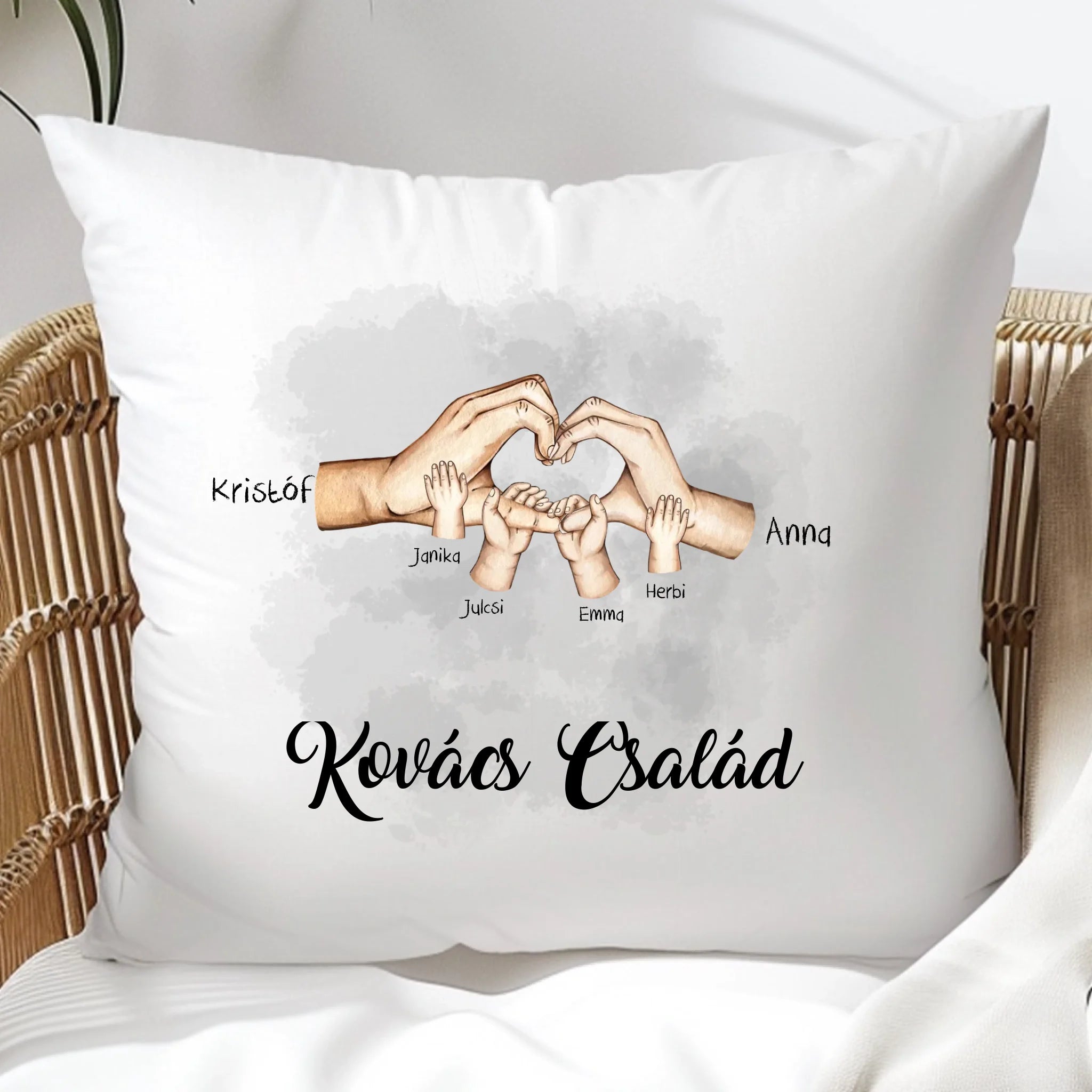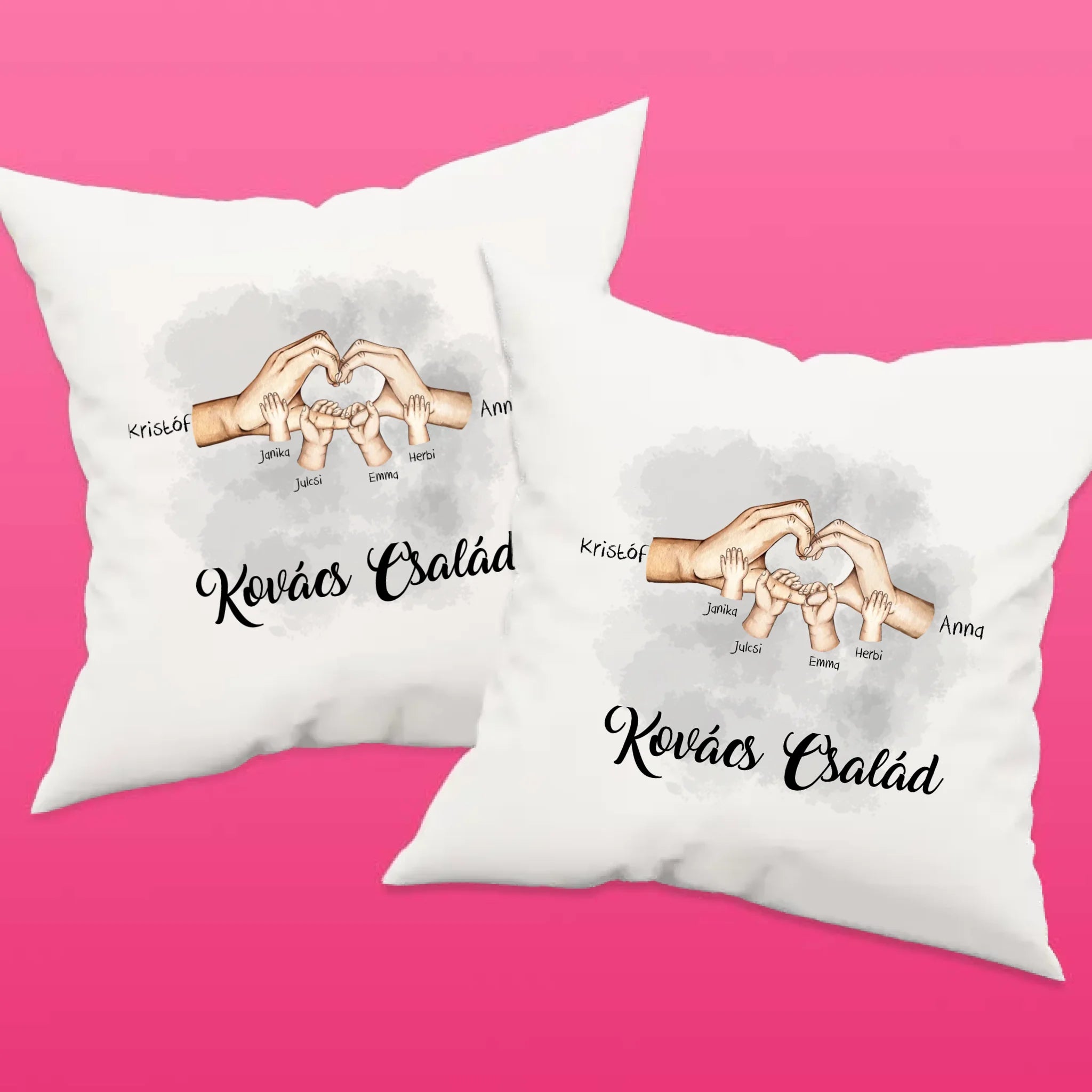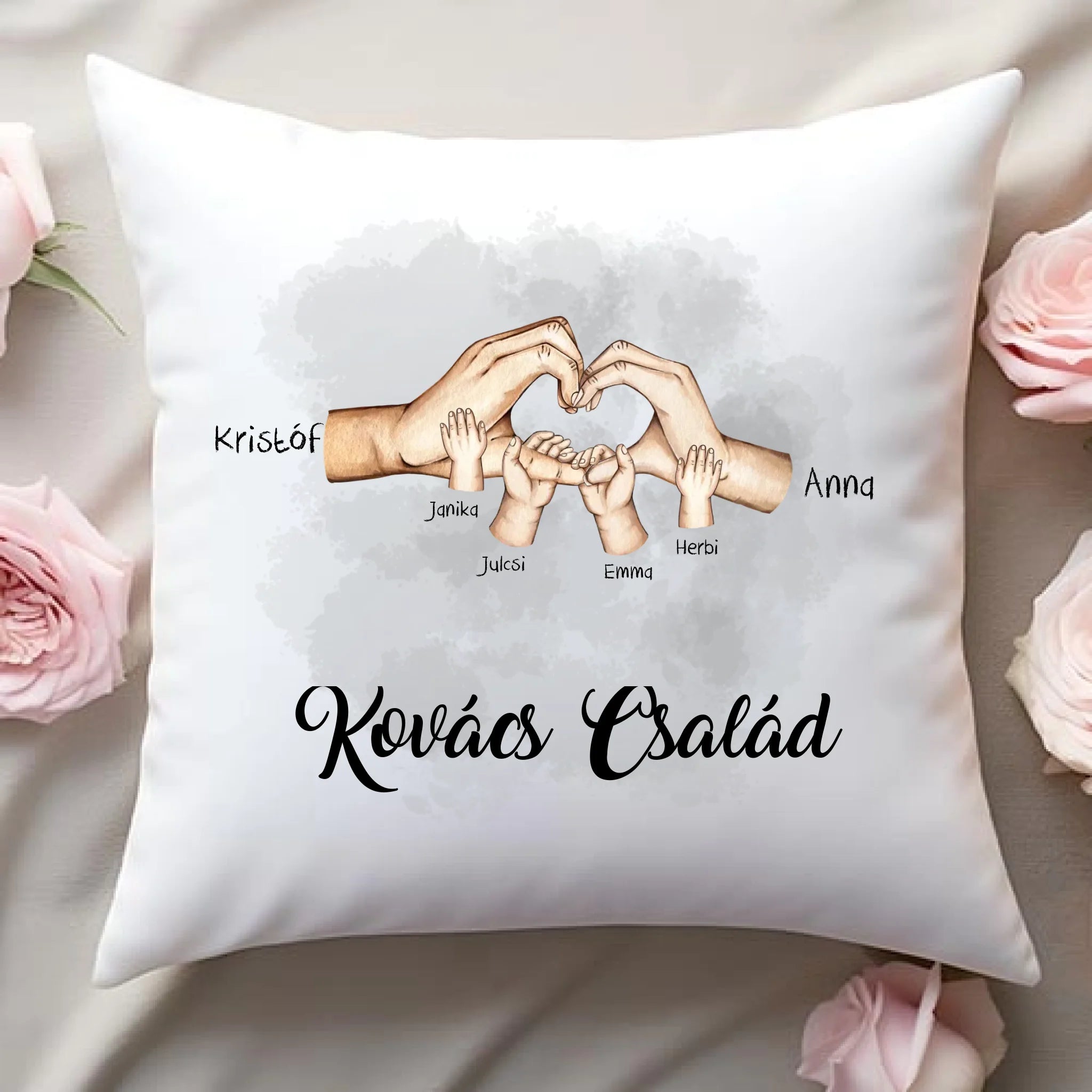 Személyre szabható családos párna kéz mintával és az általad megadott nevekkel. A személyek számát is Te adhatod meg!