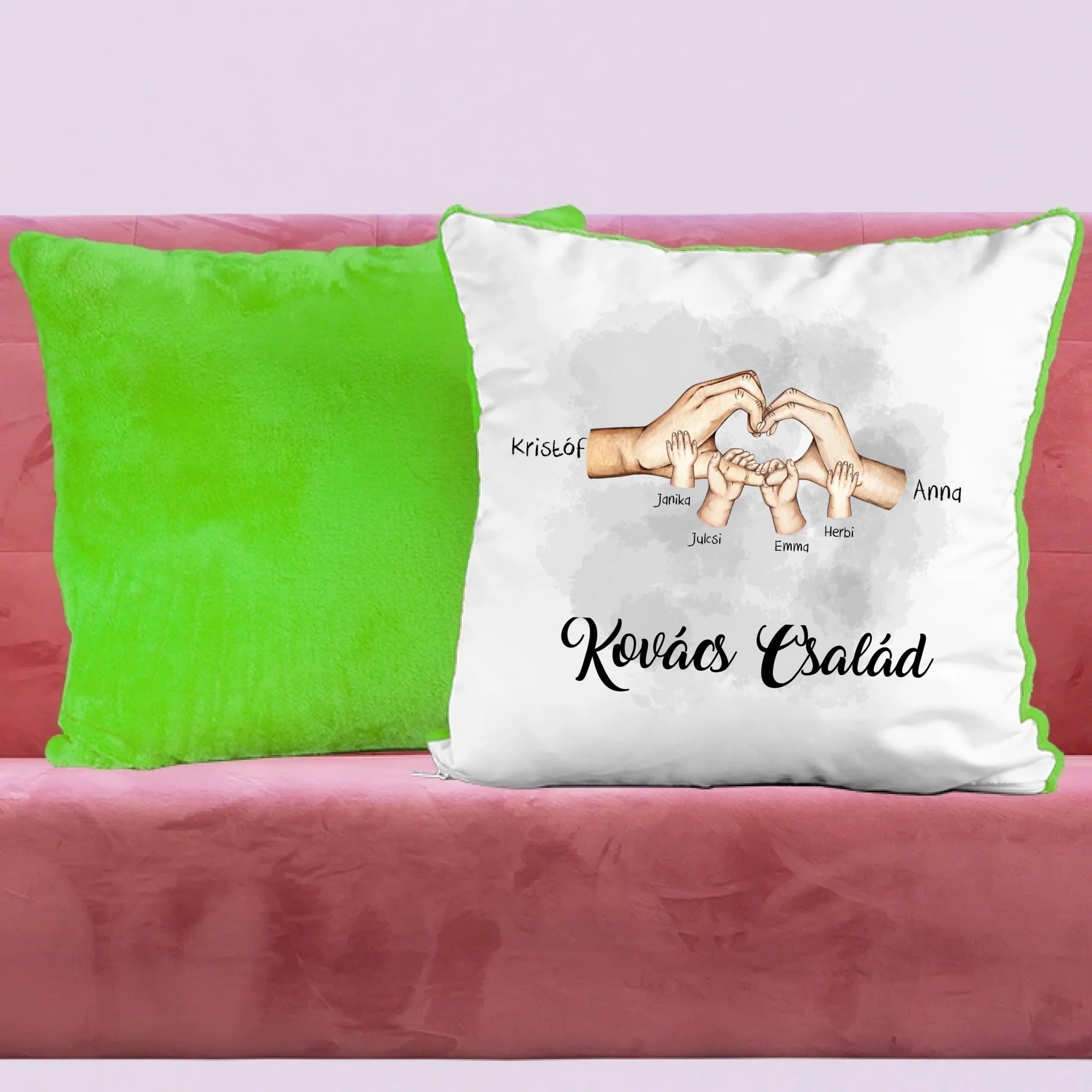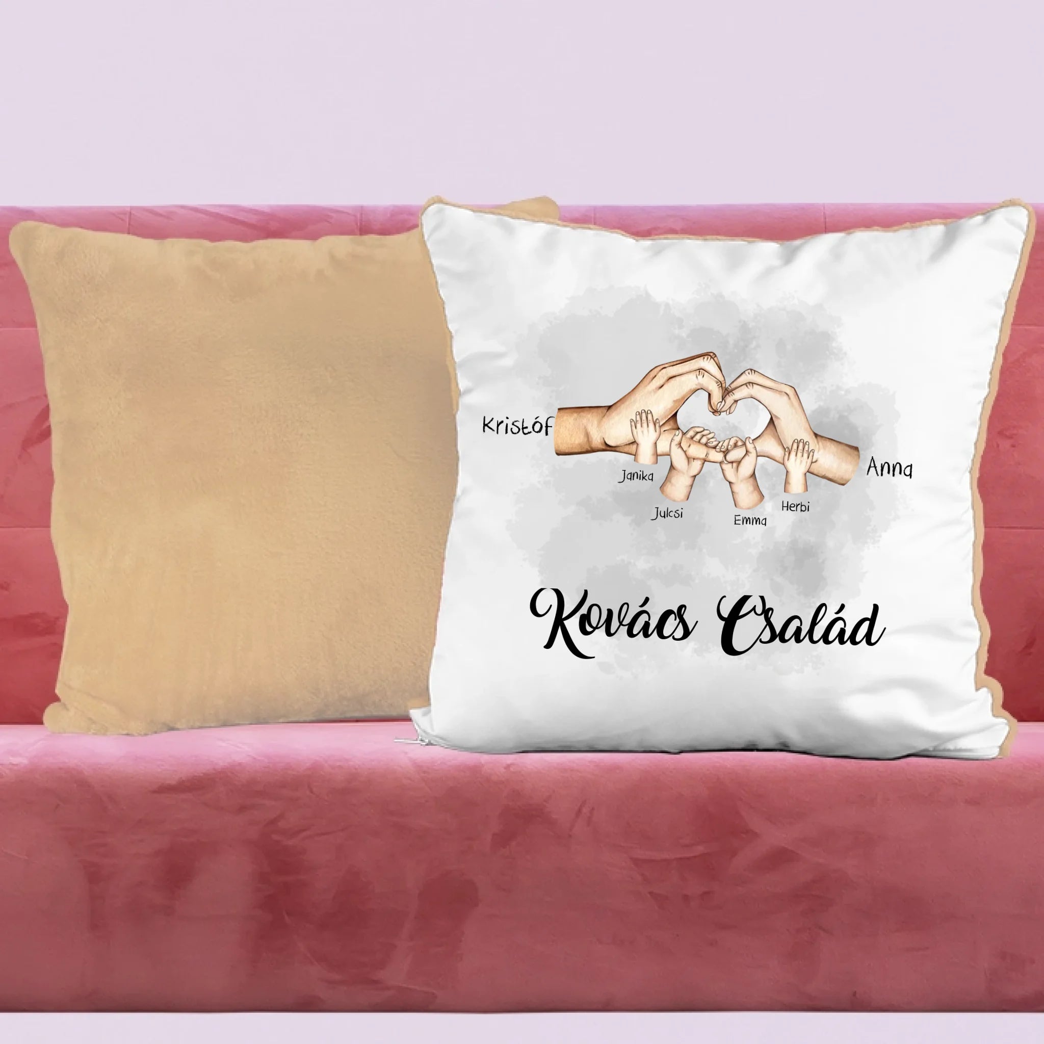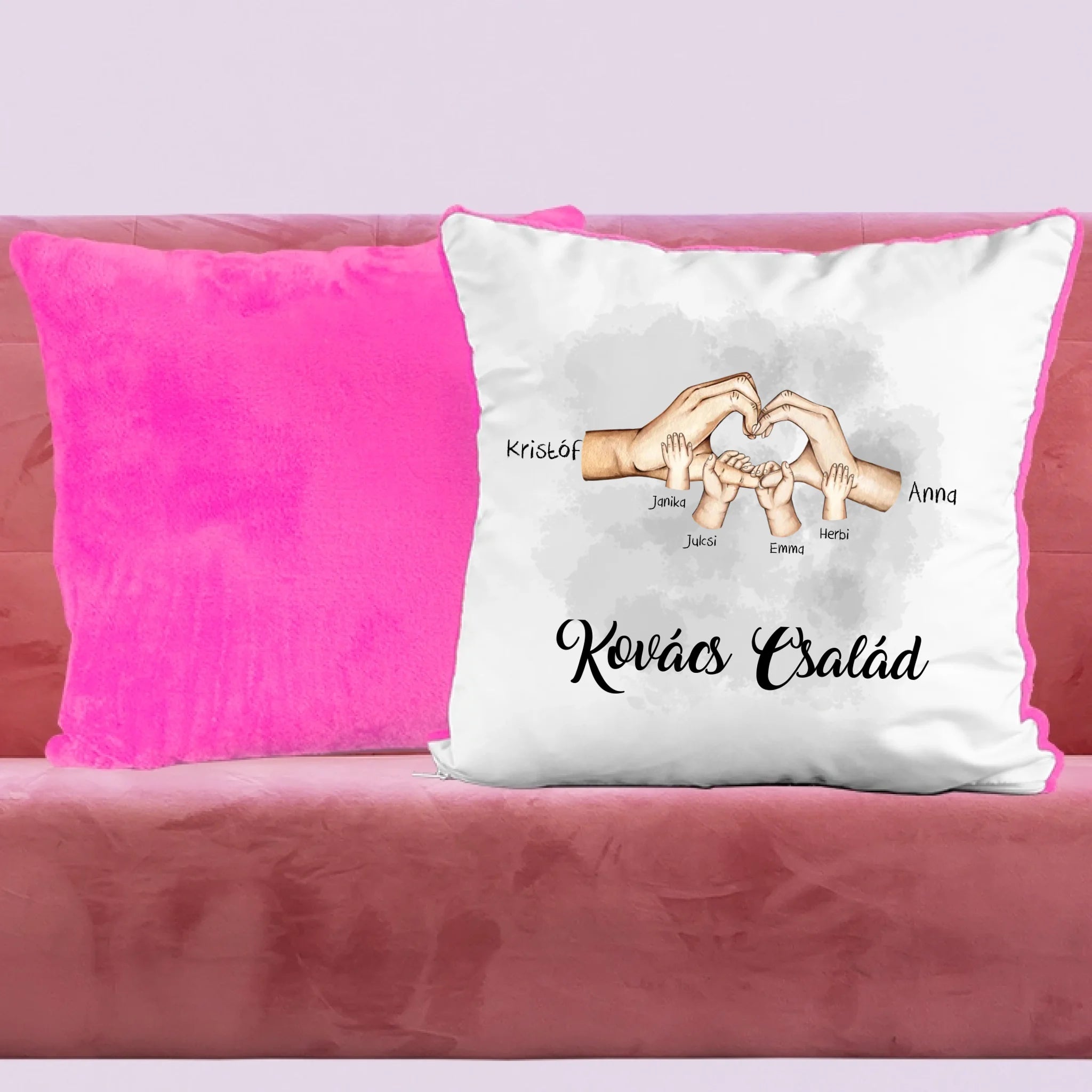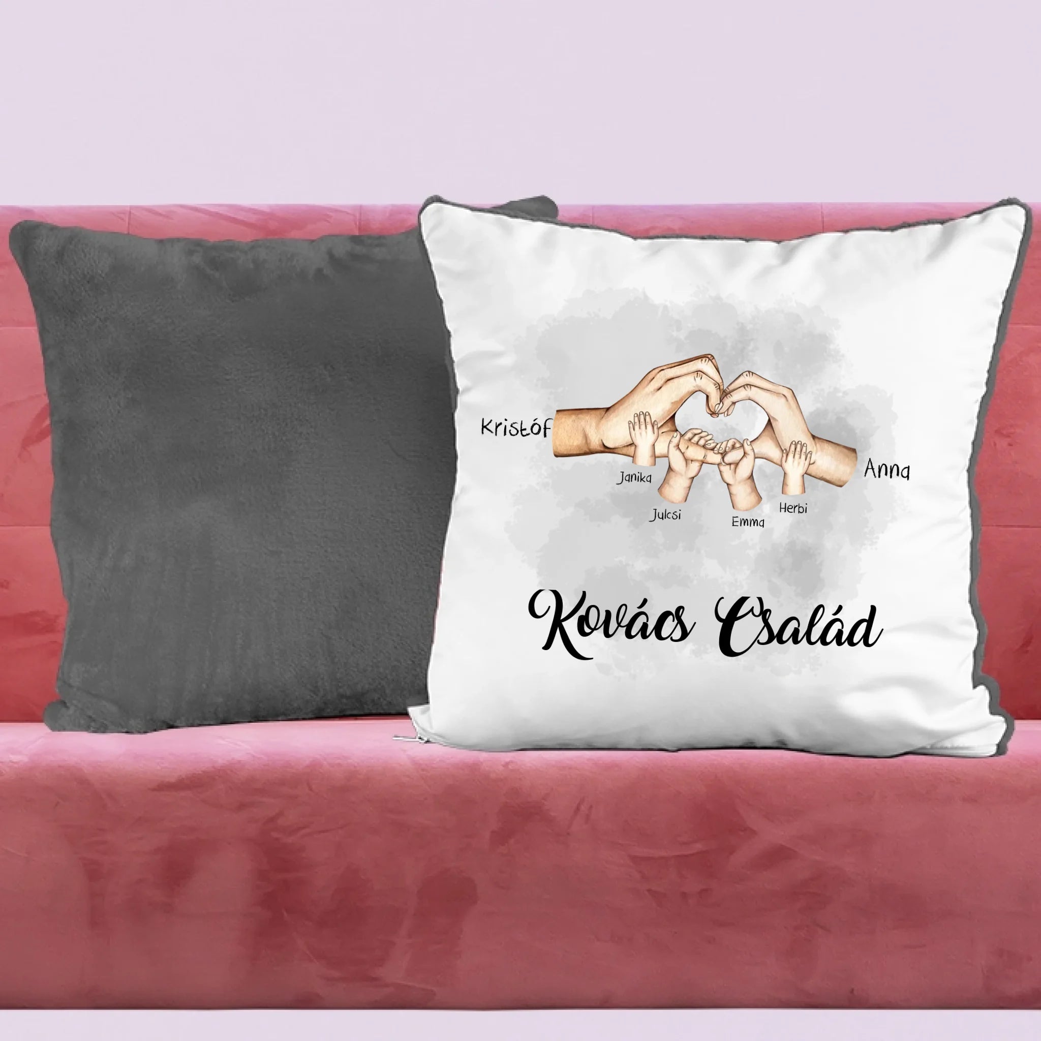 Személyre szabható családos párna kéz mintával és az általad megadott nevekkel. A személyek számát is Te adhatod meg!