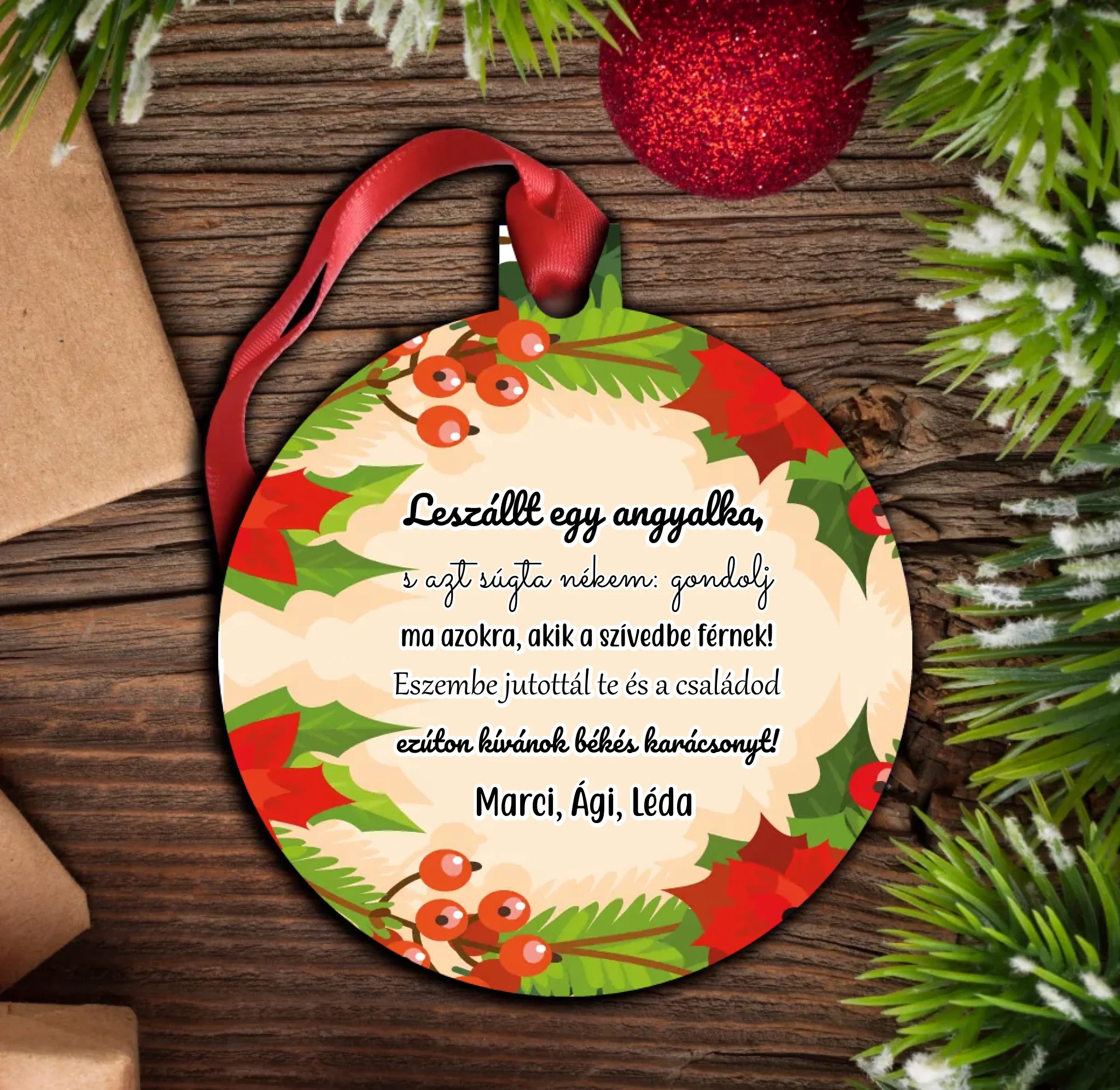 Ez az egyedi feliratos karácsonyfadísz kedves idézettel vagy személyes üzenettel készül préselt fa alapra, piros akasztóval.