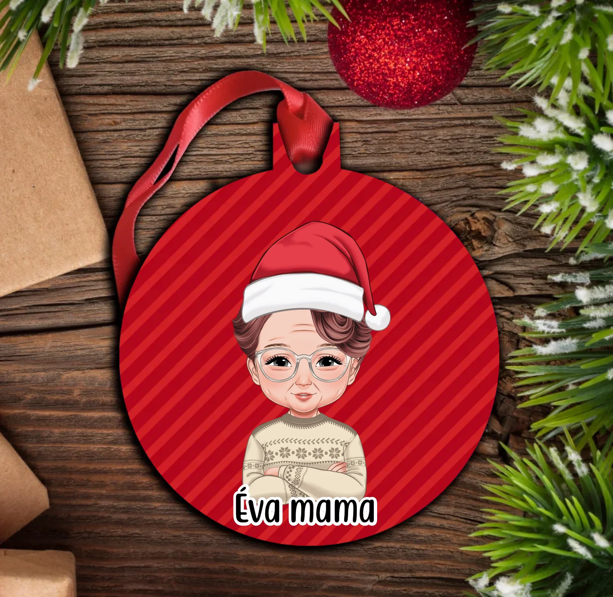 Ez a karakteres karácsonyfadísz kedves karakterrel, névvel és egyedi felirattal készül préselt fa alapra, piros akasztóval.