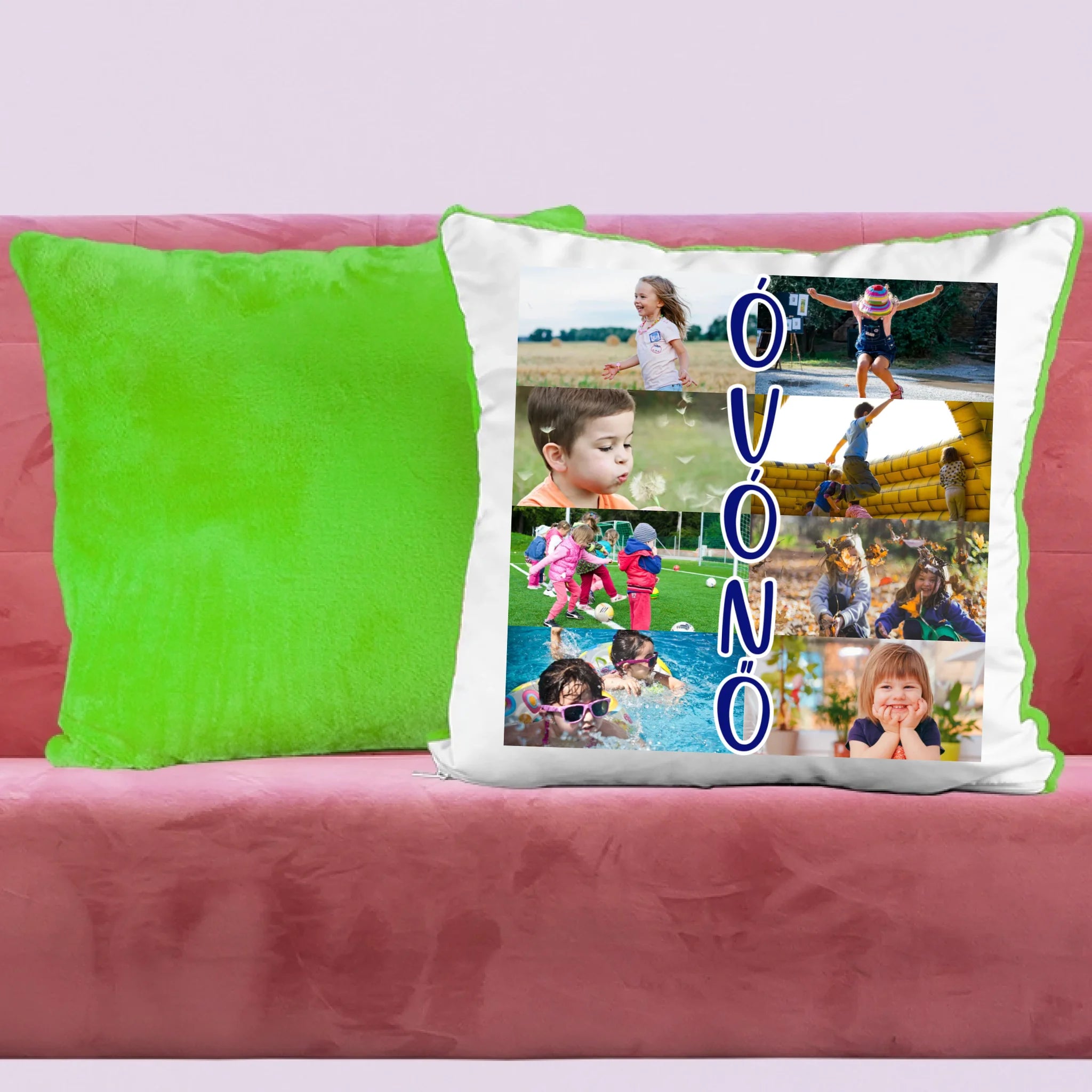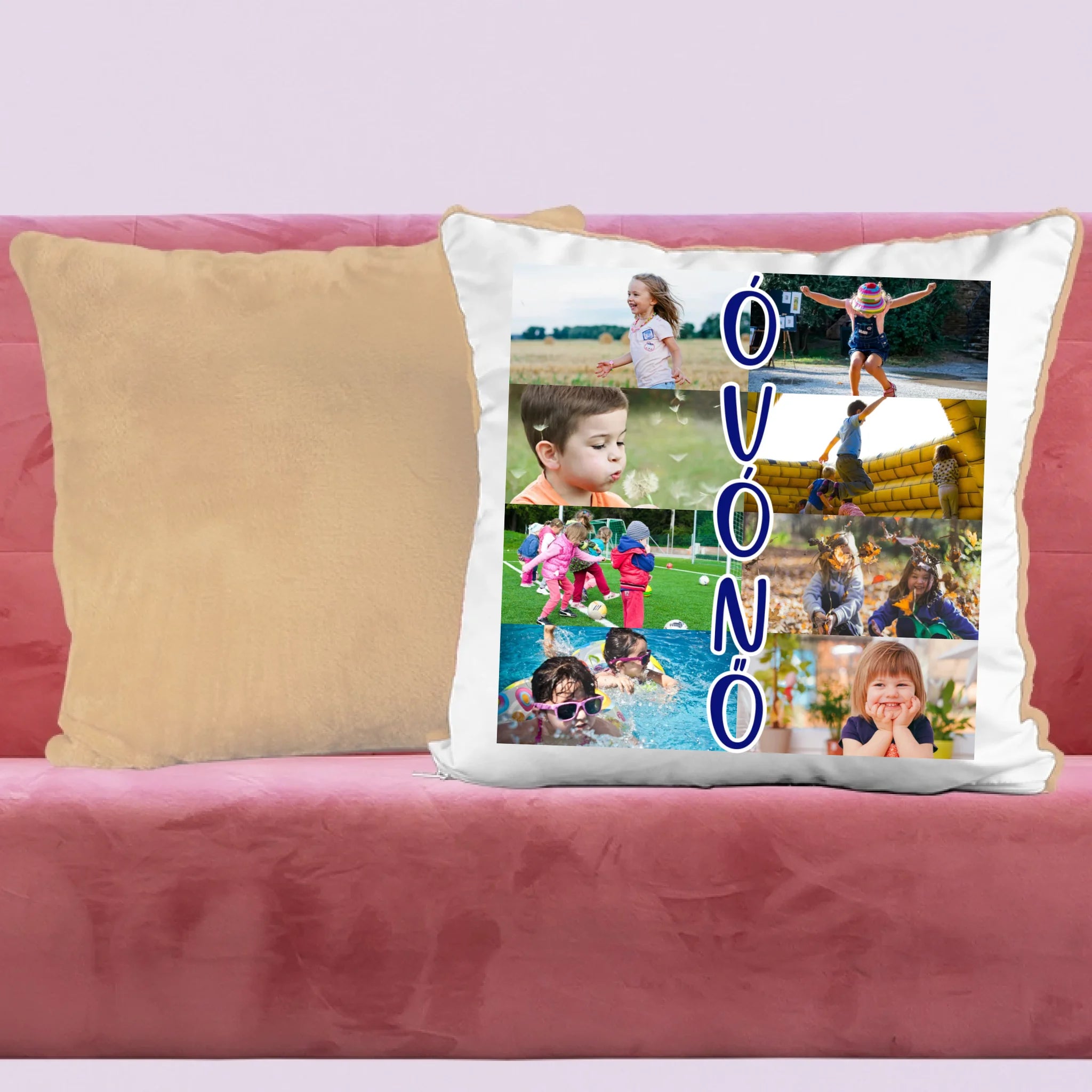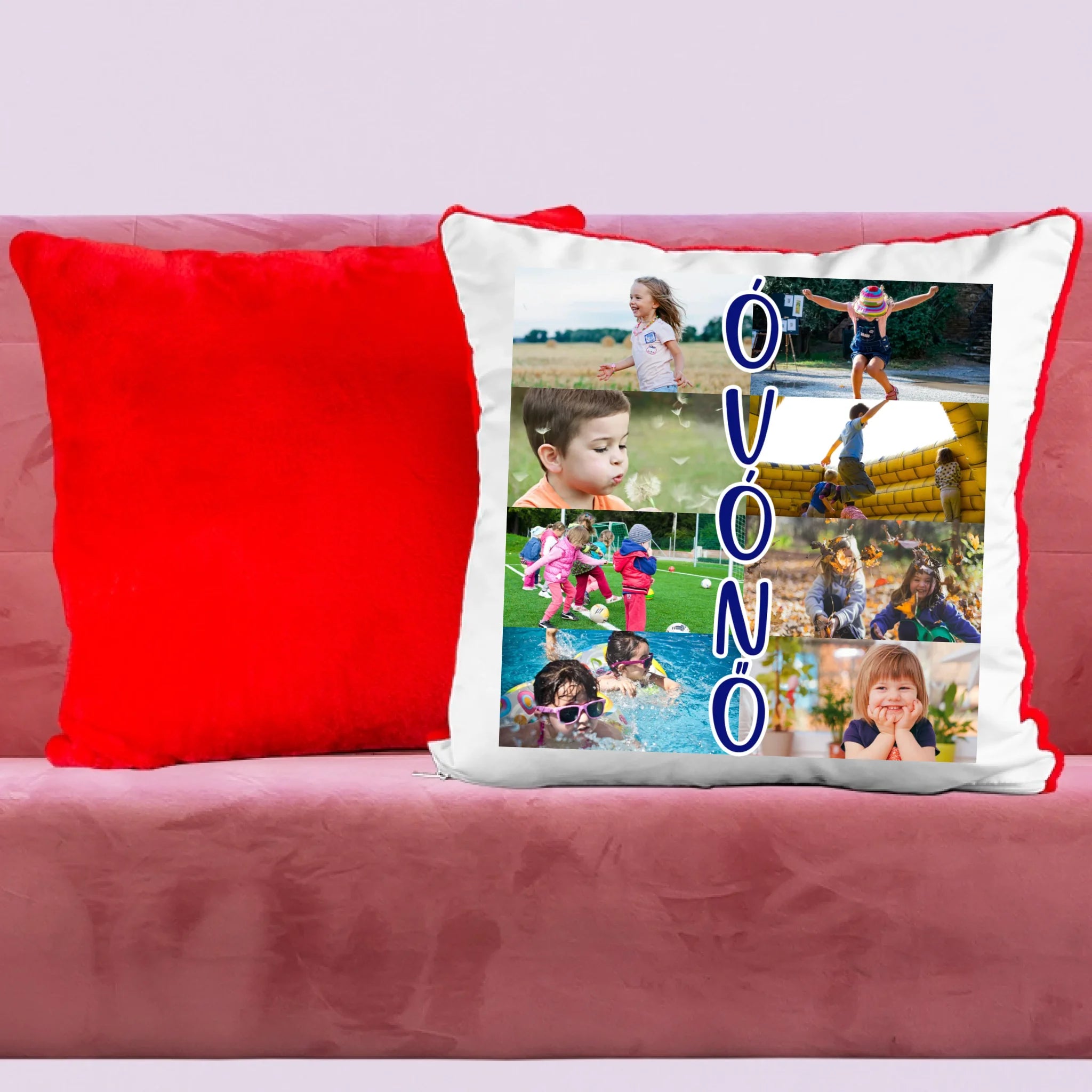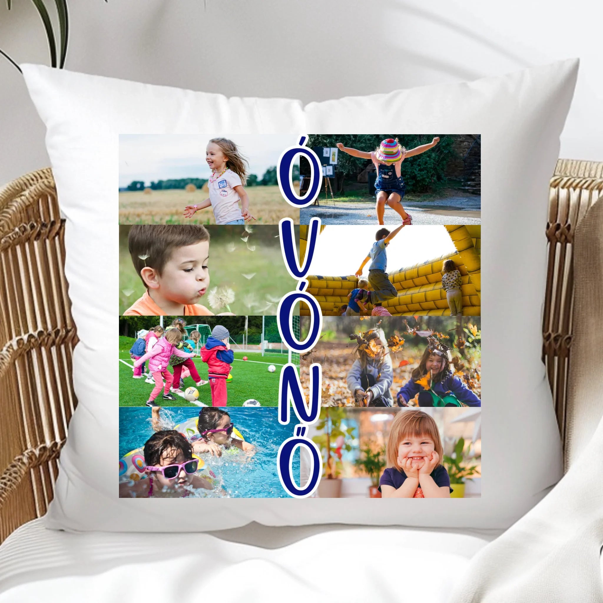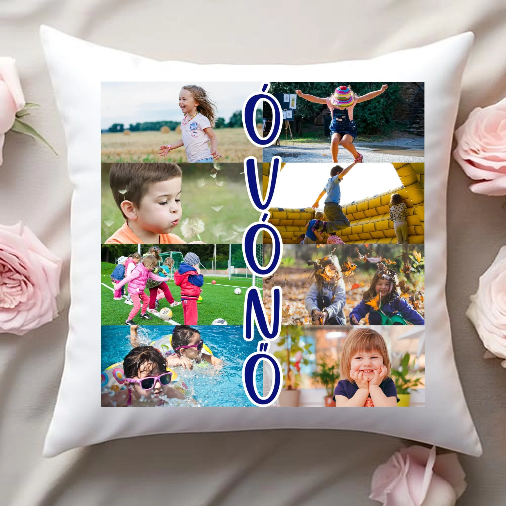 Egyedi fényképes párna 8 képpel óvónőnek, amire a kedvenc közös képeitek töltheted fel, így egy igazán szívhez szóló ajándékot készíthetsz a kedvenc óvónéninek.