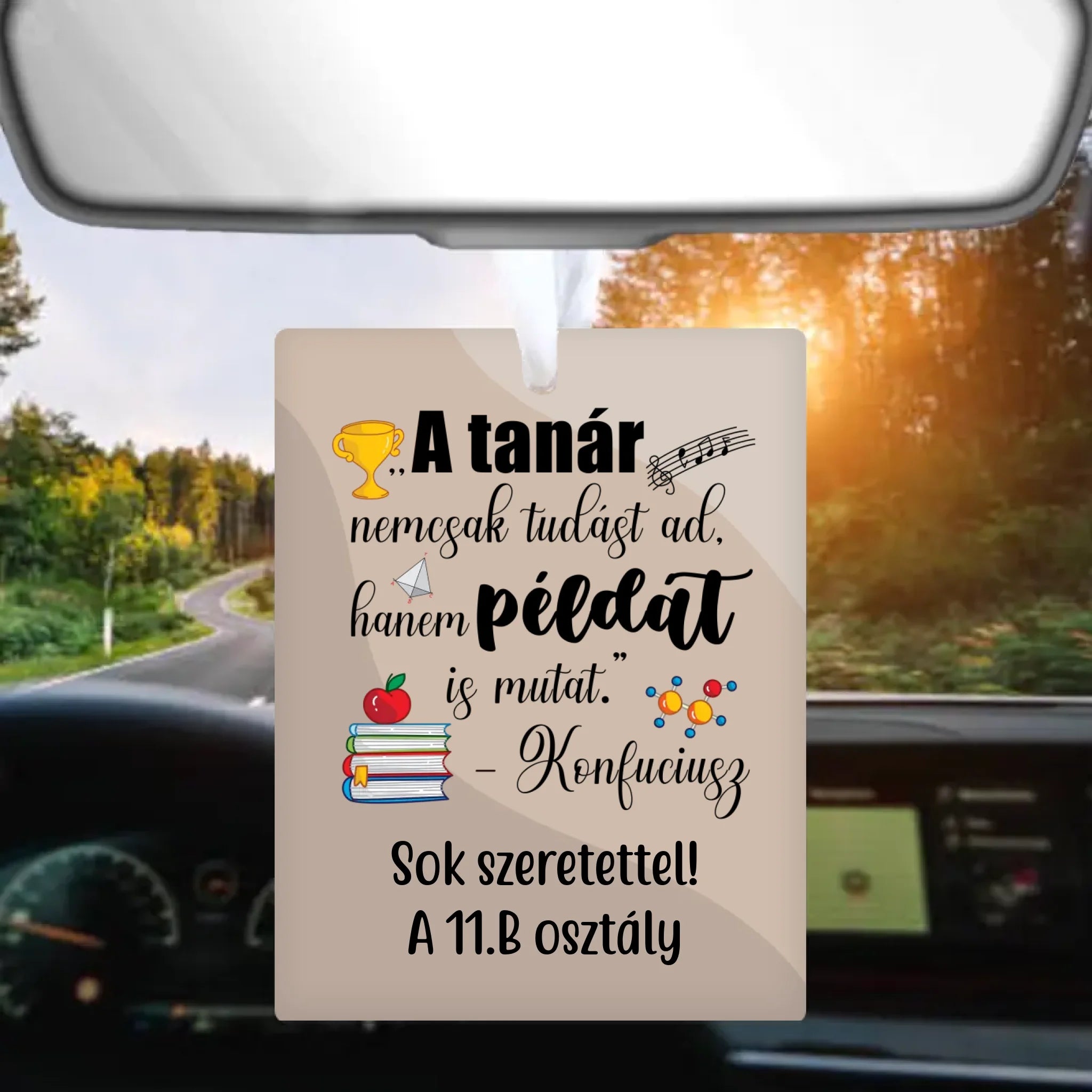 Az egyedi autóillatosító tanároknak egy személyre szabható meglepetés, ahova felkerülhet az osztály neve és egyedi felirat is. Tökéletes ajándék tanároknak pedagógusnapra, karácsonyra vagy születésnapra.