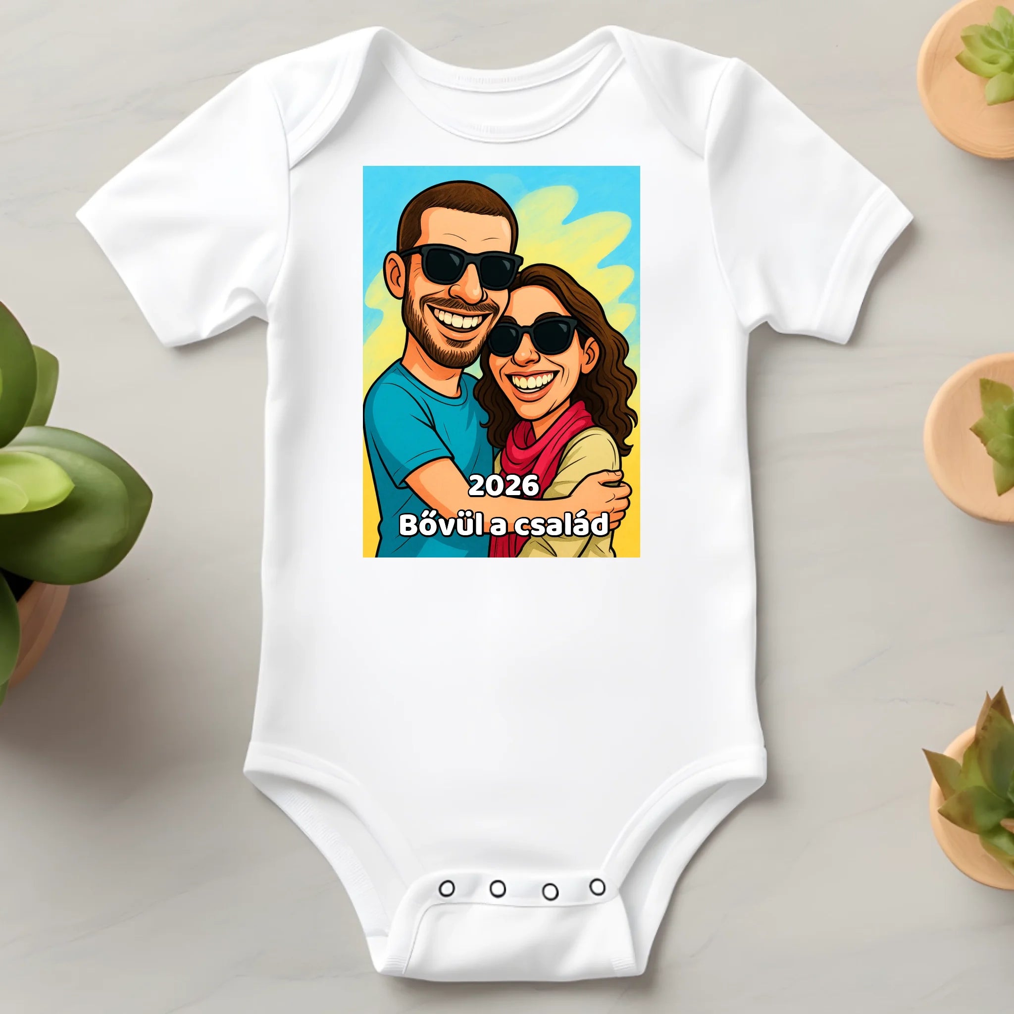 Aranyos, puha baba body saját fotóból készített karikatúrával. Egyedi, vicces és emlékezetes ruhadarab kisbabáknak.