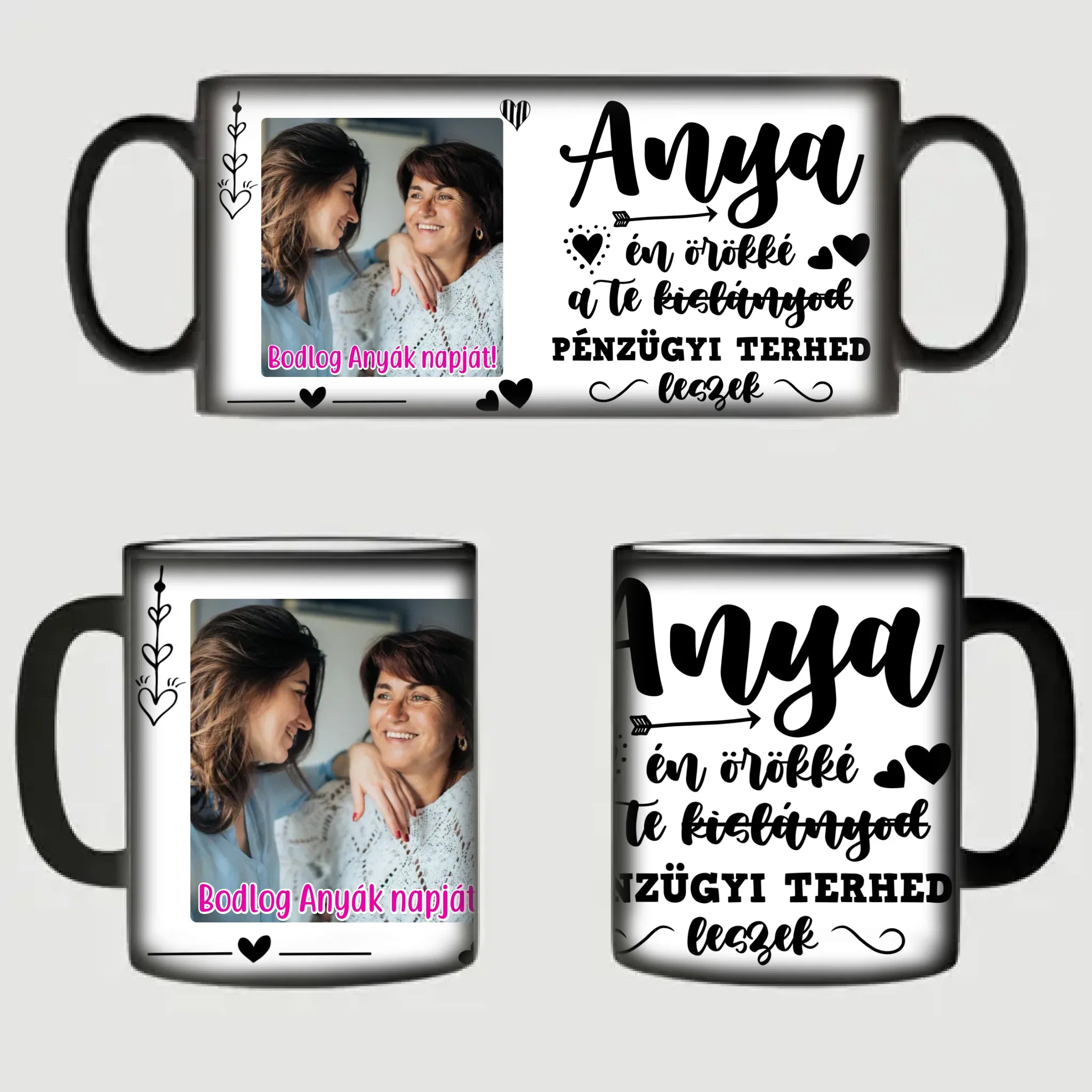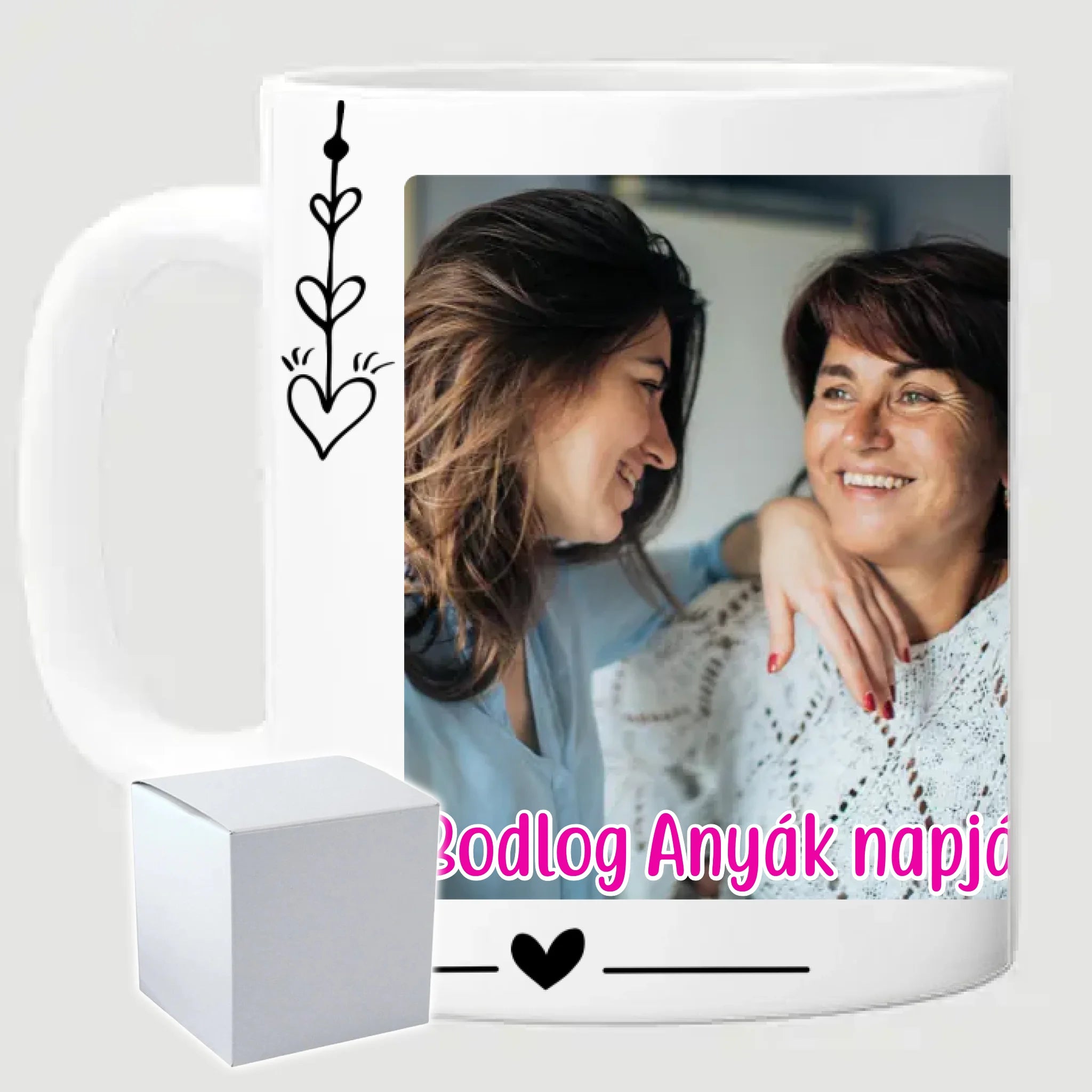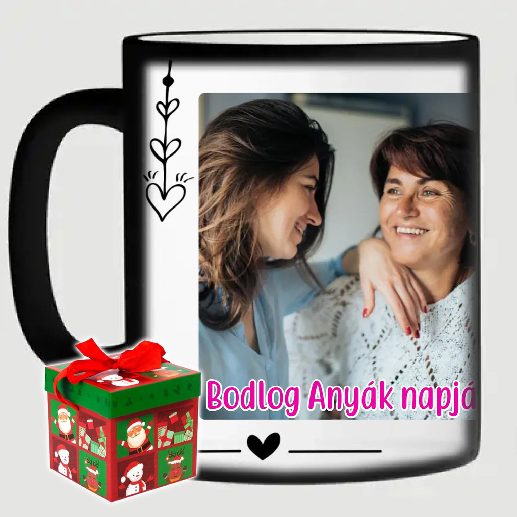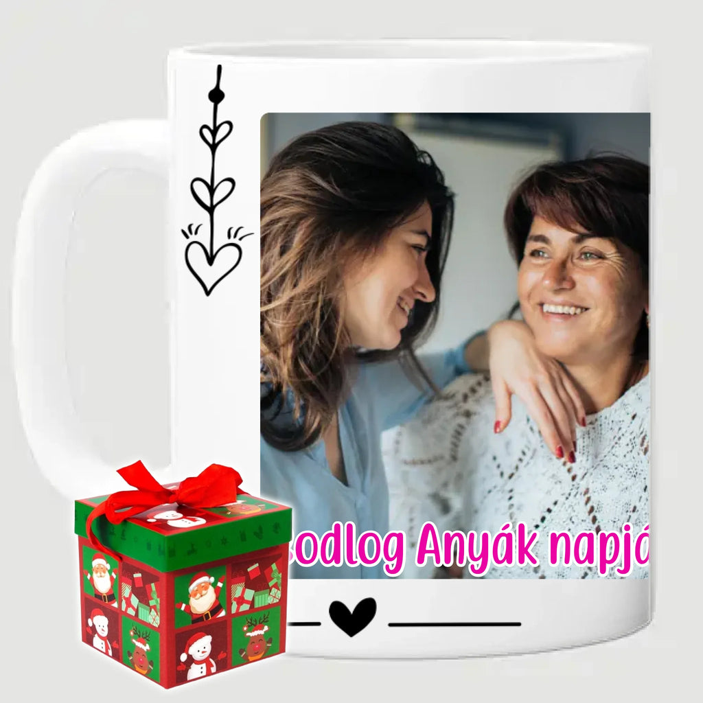 Egyedi anyák napi fényképes bögre a saját fotóddal. Az egyedi fényképes bögre remek ajándék Anyák napjára és születésnapra is. Az egyedi bögre nyomtatása nagyon magas hőfokon történik, ezáltal az anyag szerkezetébe sütjük bele, így a nyomat rendkívül tartós lesz és nem kopik, nem fakul ki. A fényképes bögréhez bármilyen fotót választhatsz, illetve feliratot is adhatsz hozzá.