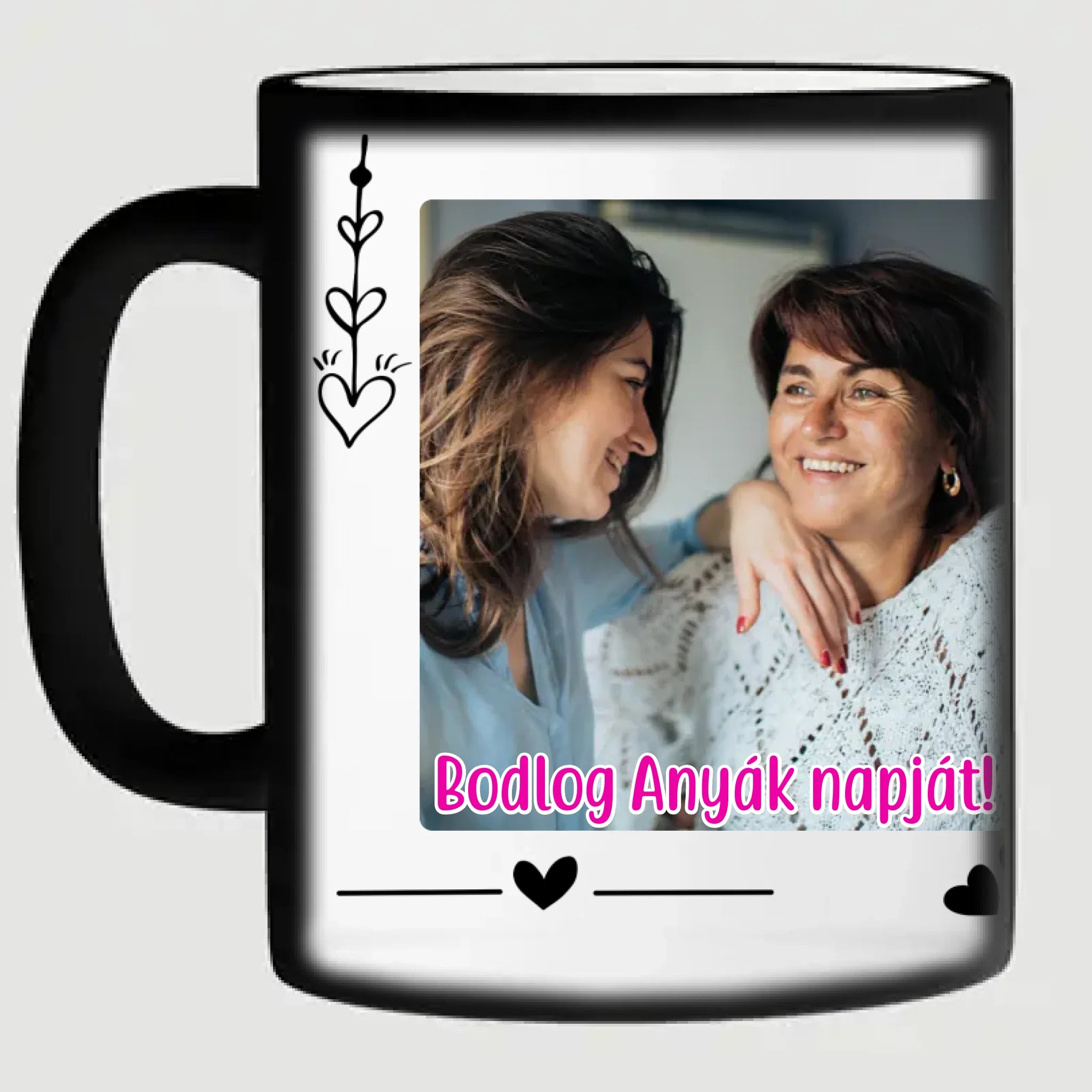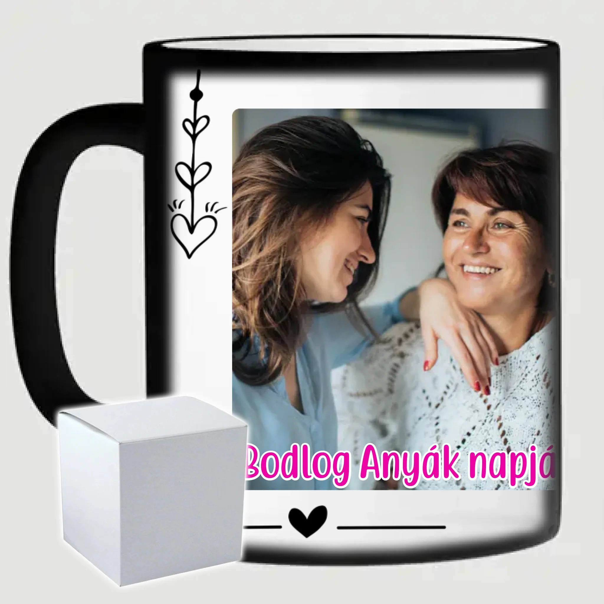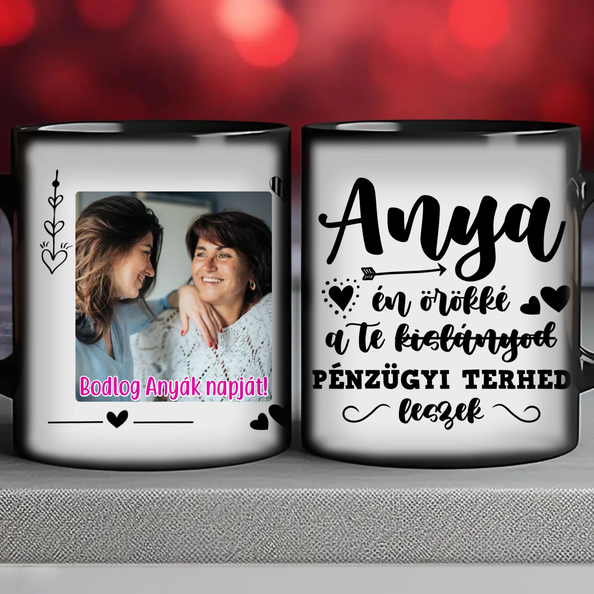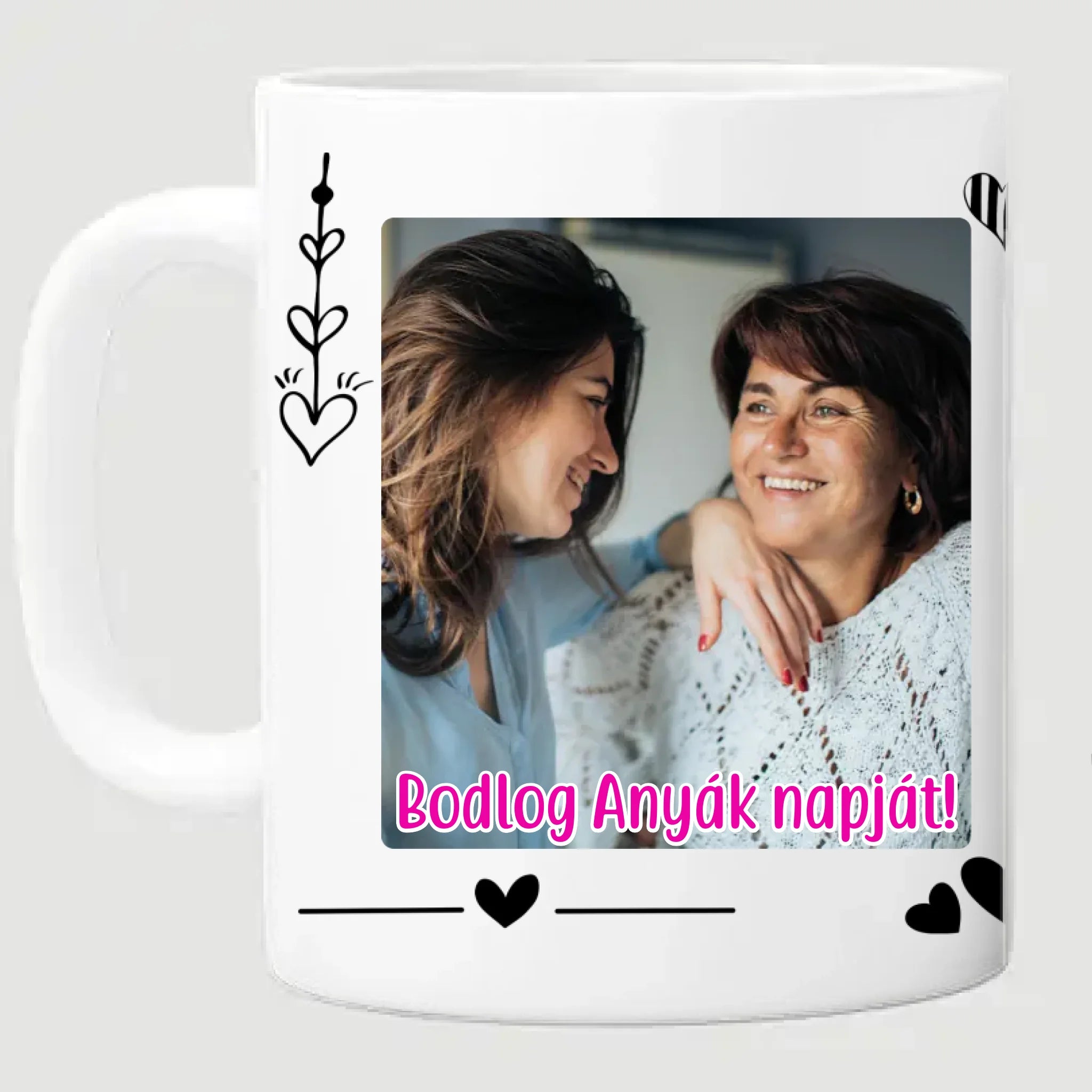 Egyedi anyák napi fényképes bögre a saját fotóddal. Az egyedi fényképes bögre remek ajándék Anyák napjára és születésnapra is. Az egyedi bögre nyomtatása nagyon magas hőfokon történik, ezáltal az anyag szerkezetébe sütjük bele, így a nyomat rendkívül tartós lesz és nem kopik, nem fakul ki. A fényképes bögréhez bármilyen fotót választhatsz, illetve feliratot is adhatsz hozzá.