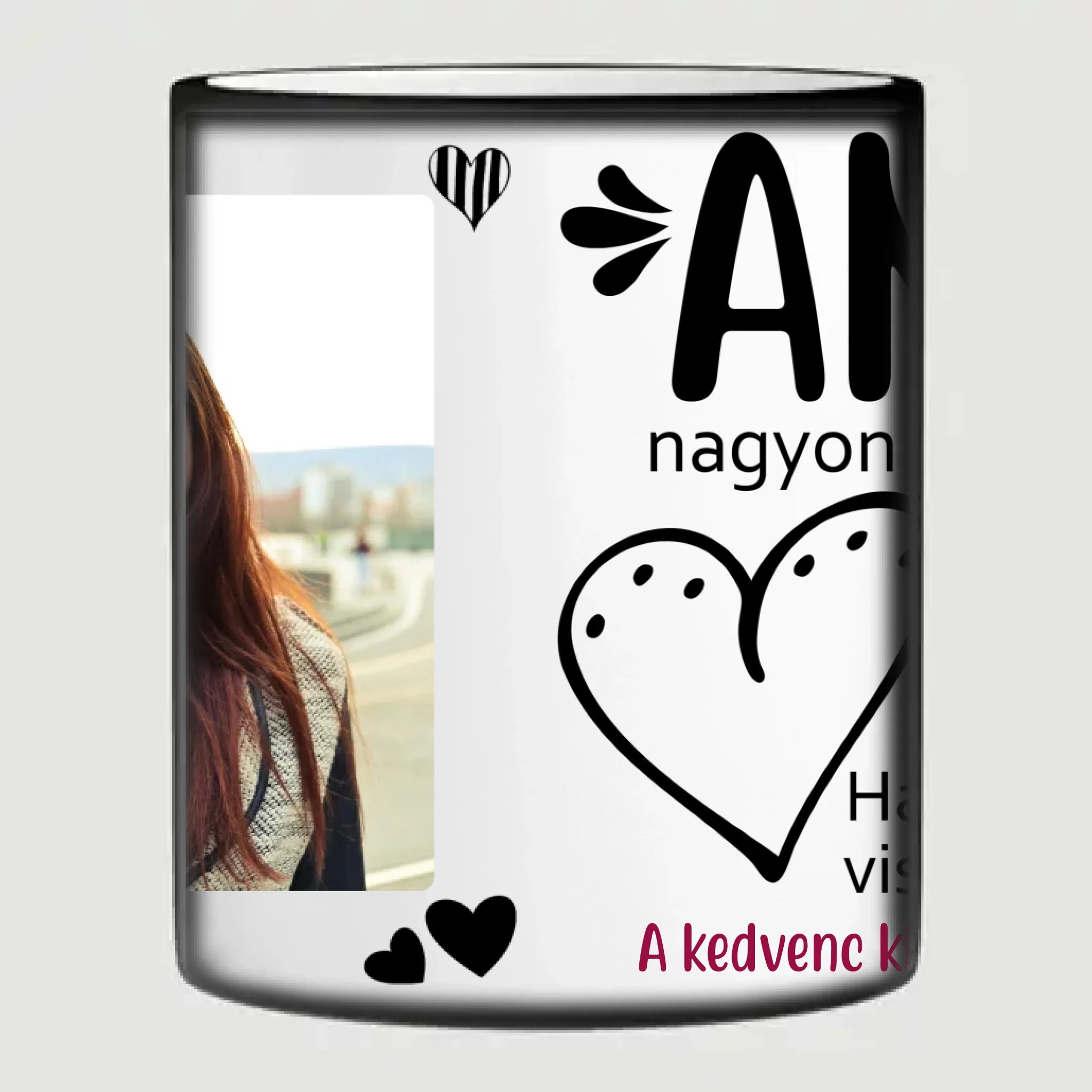Egyedi anyák napi fényképes bögre a saját fotóddal. Az egyedi fényképes bögre remek ajándék Anyák napjára és születésnapra is. Az egyedi bögre nyomtatása nagyon magas hőfokon történik, ezáltal az anyag szerkezetébe sütjük bele, így a nyomat rendkívül tartós lesz és nem kopik, nem fakul ki. A fényképes bögréhez bármilyen fotót választhatsz, illetve feliratot is adhatsz hozzá.