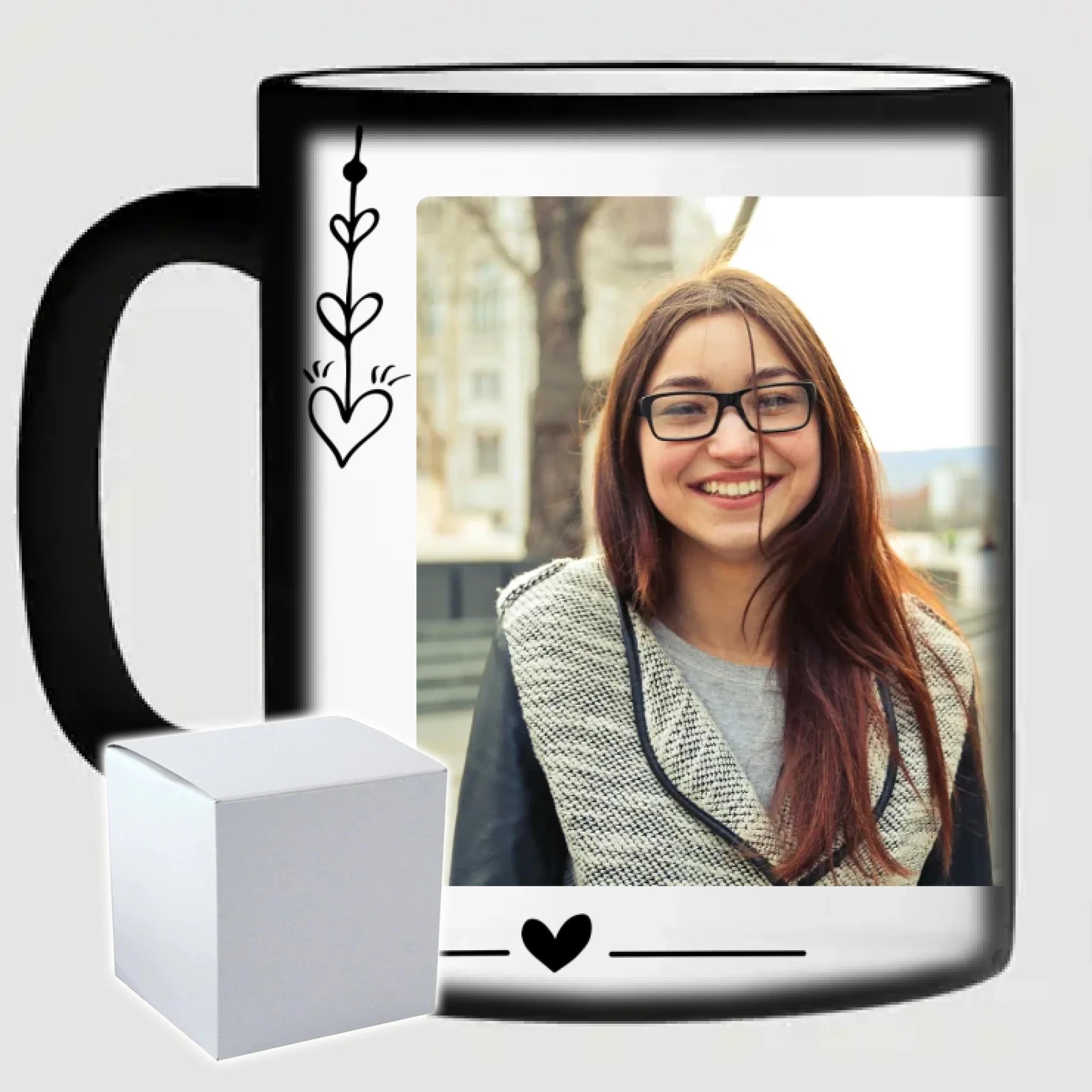 A bögre szoba hőmérsékleten fekete színű, forró folyadékkal való feltöltés hatására tűnik elő a nyomtatott minta