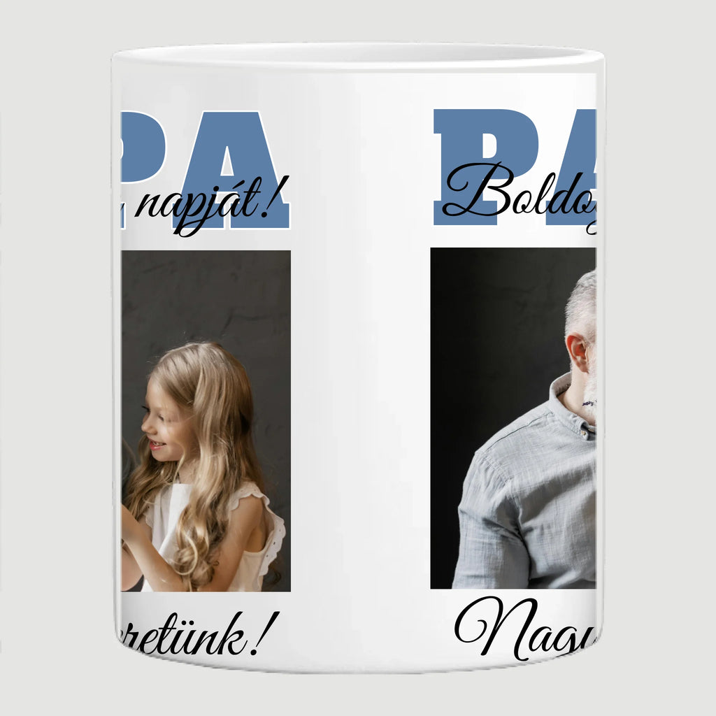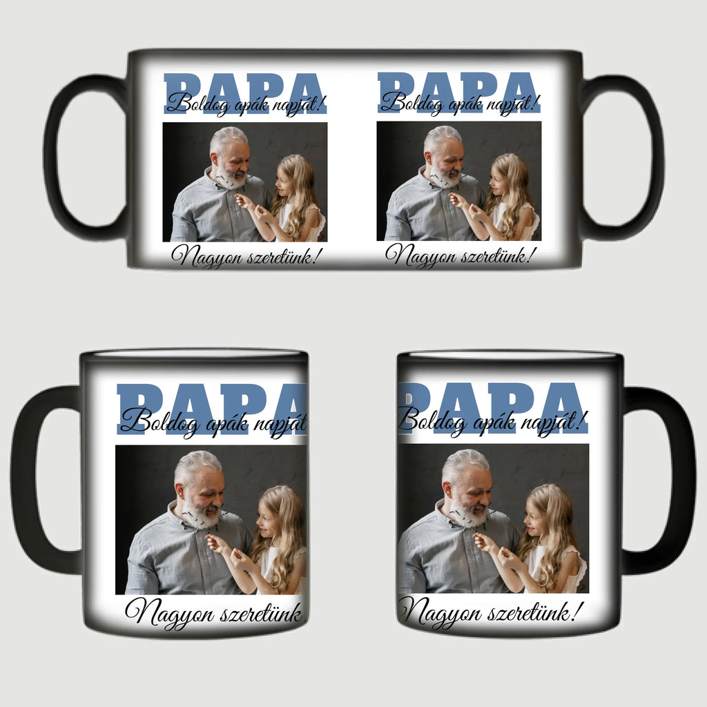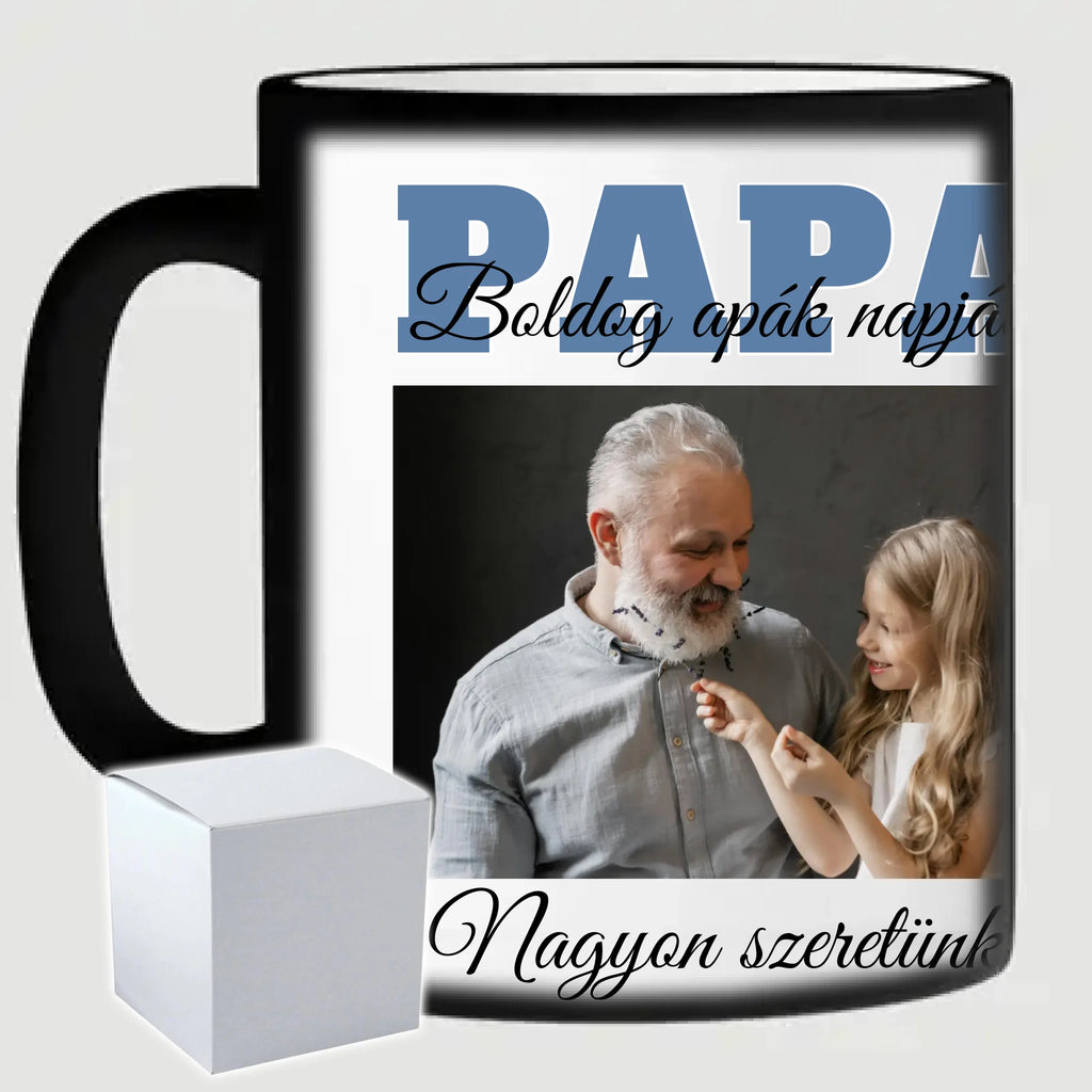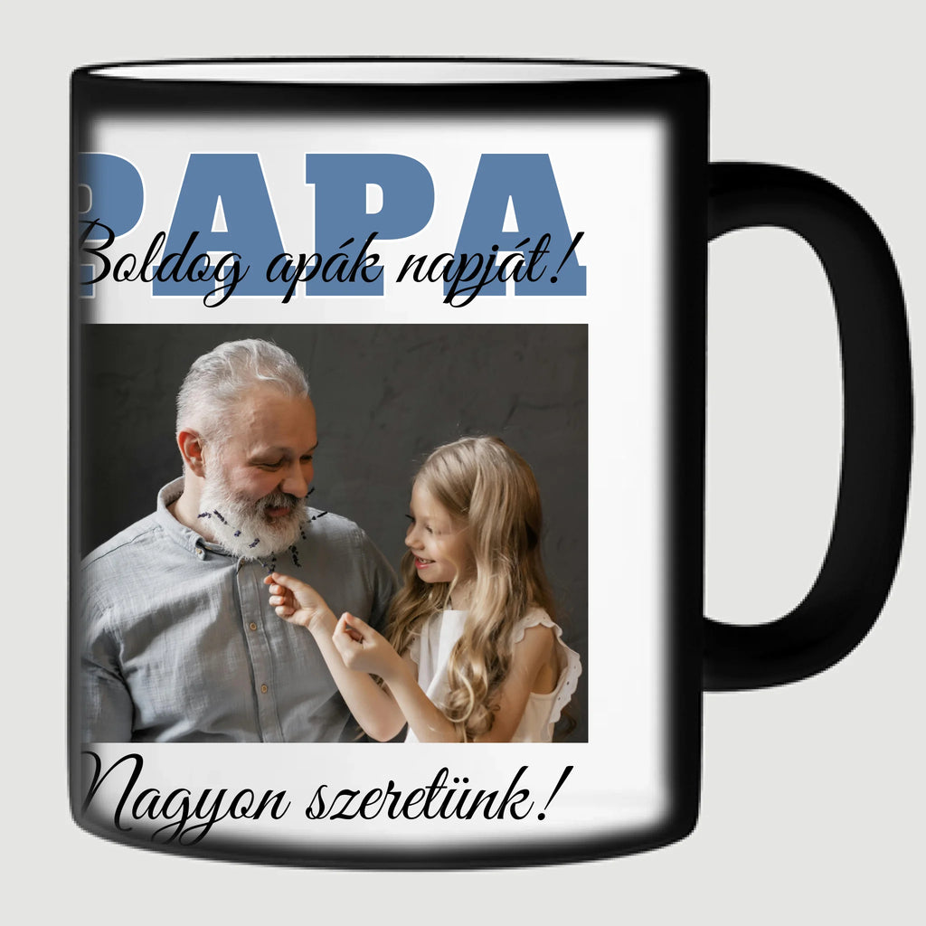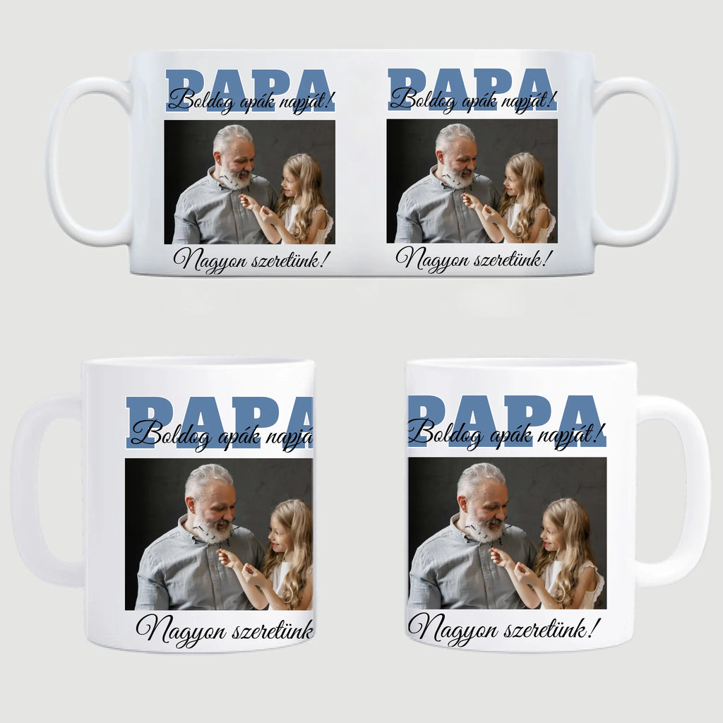 Egyedi apák napi fényképes bögre a saját fotóddal. Az egyedi fényképes bögre remek ajándék Apák napjára és születésnapra is. Az egyedi bögre nyomtatása nagyon magas hőfokon történik, ezáltal az anyag szerkezetébe sütjük bele, így a nyomat rendkívül tartós lesz és nem kopik, nem fakul ki. A fényképes bögréhez bármilyen fotót választhatsz, illetve feliratot is adhatsz hozzá.