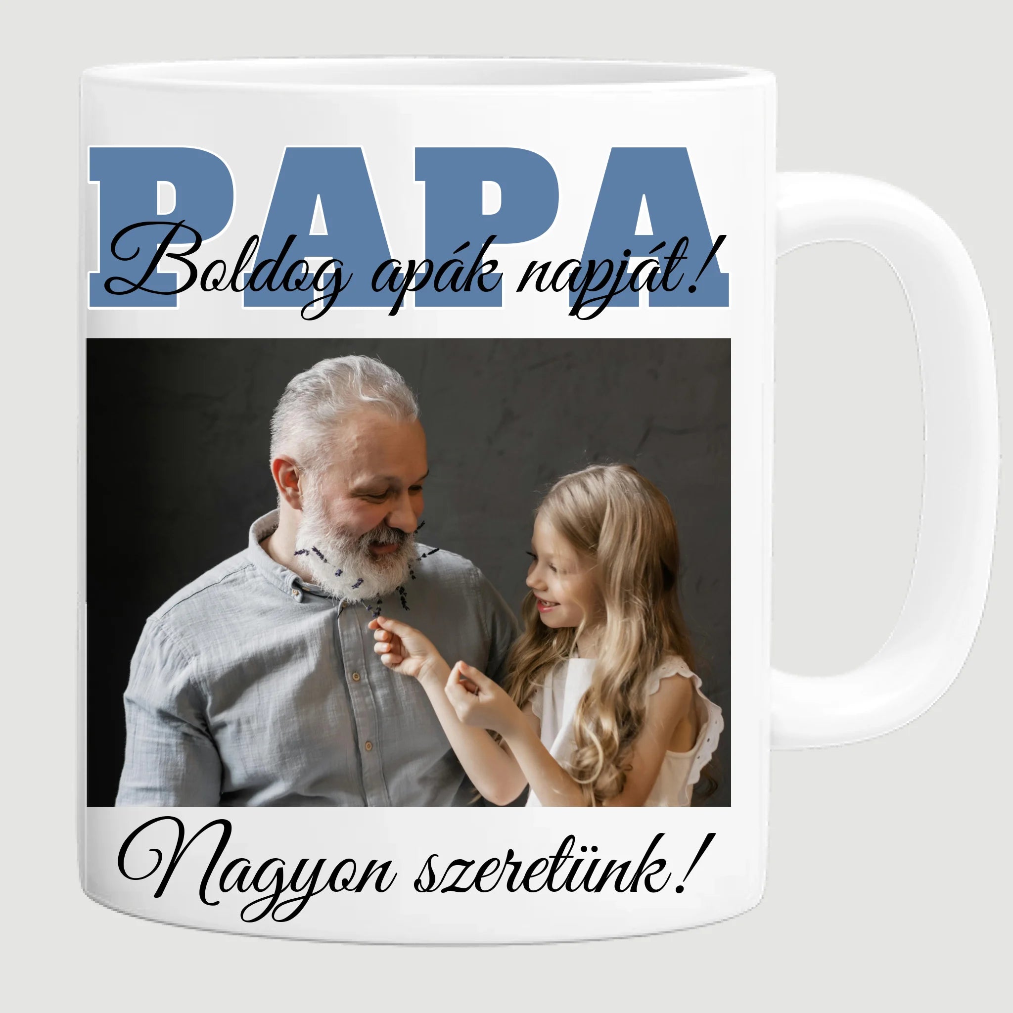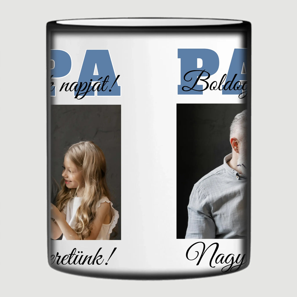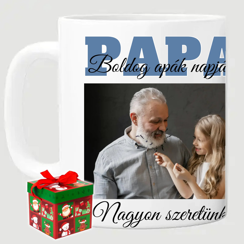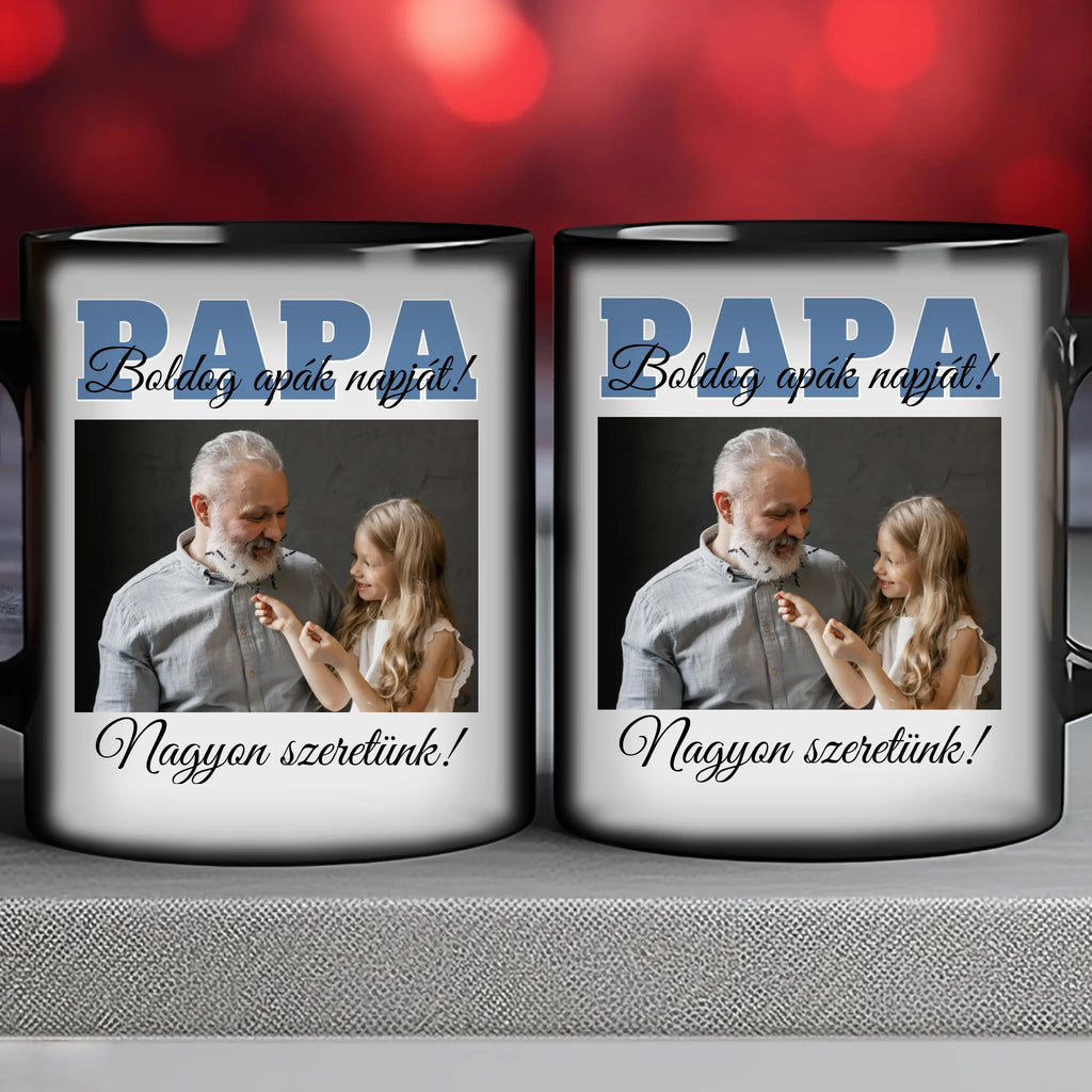 Egyedi apák napi fényképes bögre a saját fotóddal. Az egyedi fényképes bögre remek ajándék Apák napjára és születésnapra is. Az egyedi bögre nyomtatása nagyon magas hőfokon történik, ezáltal az anyag szerkezetébe sütjük bele, így a nyomat rendkívül tartós lesz és nem kopik, nem fakul ki. A fényképes bögréhez bármilyen fotót választhatsz, illetve feliratot is adhatsz hozzá.
