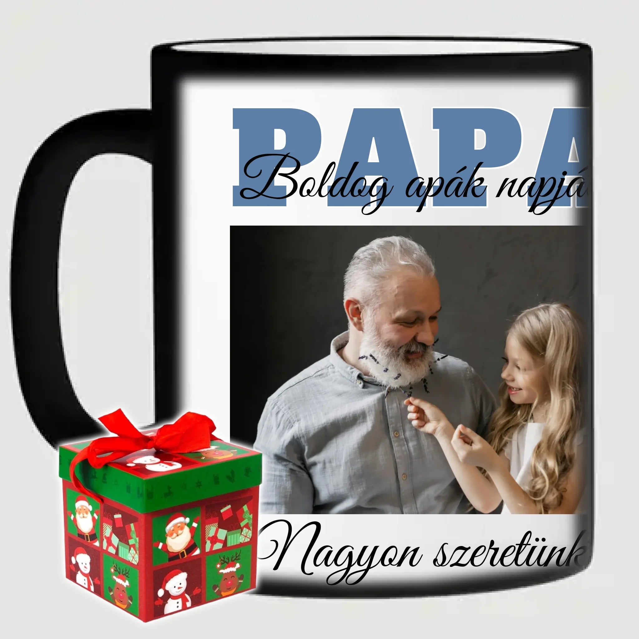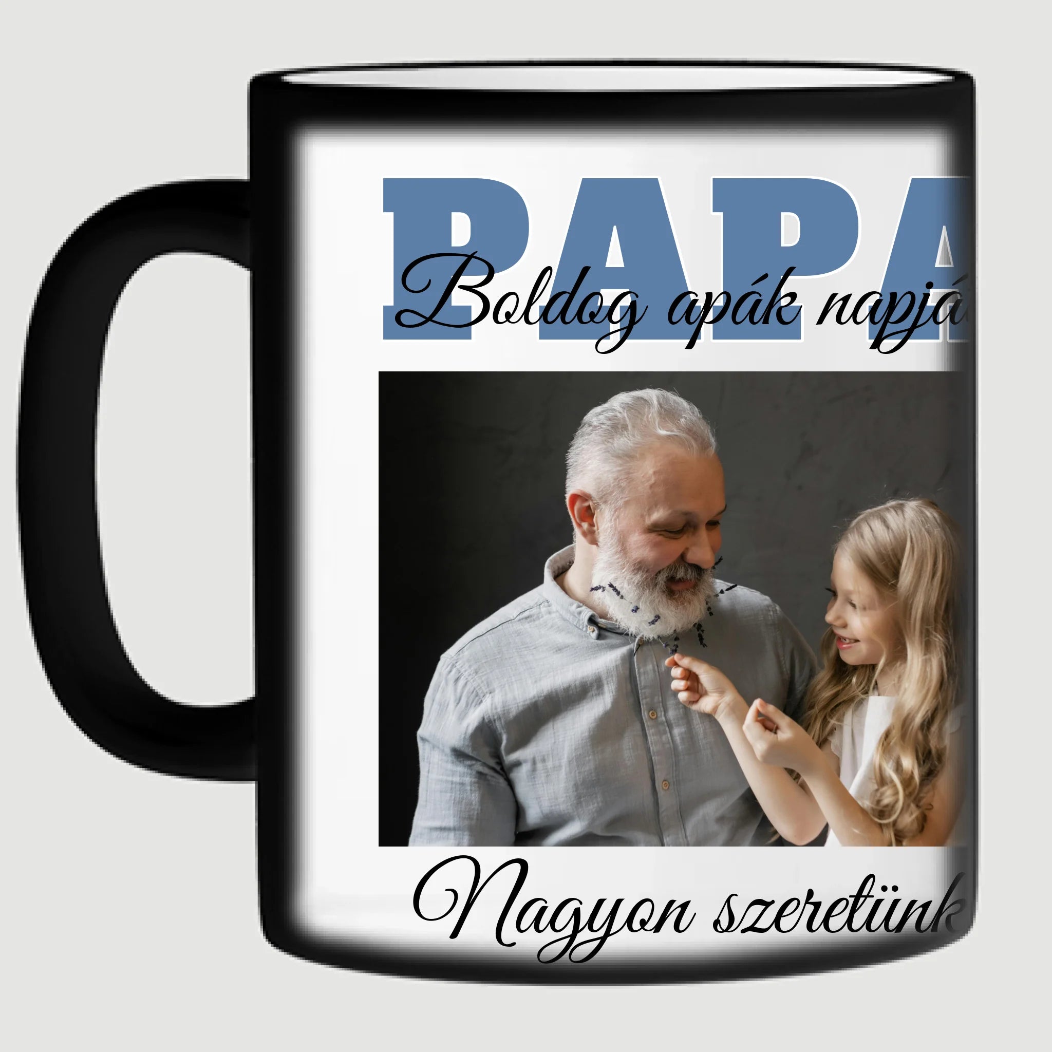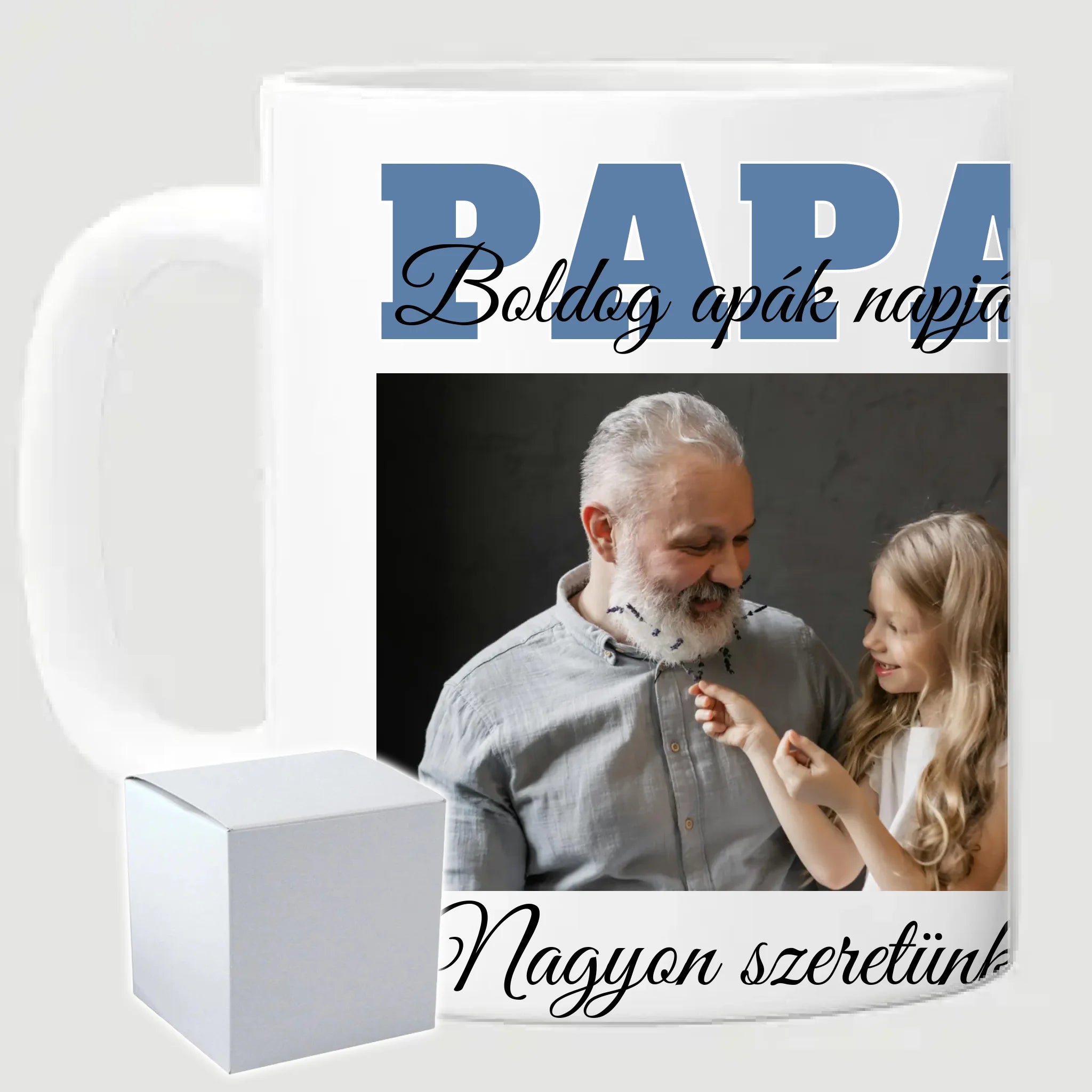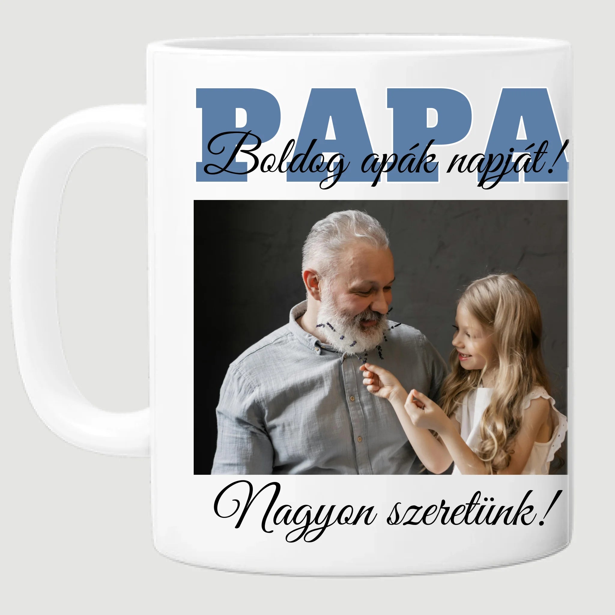 Egyedi apák napi fényképes bögre a saját fotóddal. Az egyedi fényképes bögre remek ajándék Apák napjára és születésnapra is. Az egyedi bögre nyomtatása nagyon magas hőfokon történik, ezáltal az anyag szerkezetébe sütjük bele, így a nyomat rendkívül tartós lesz és nem kopik, nem fakul ki. A fényképes bögréhez bármilyen fotót választhatsz, illetve feliratot is adhatsz hozzá.
