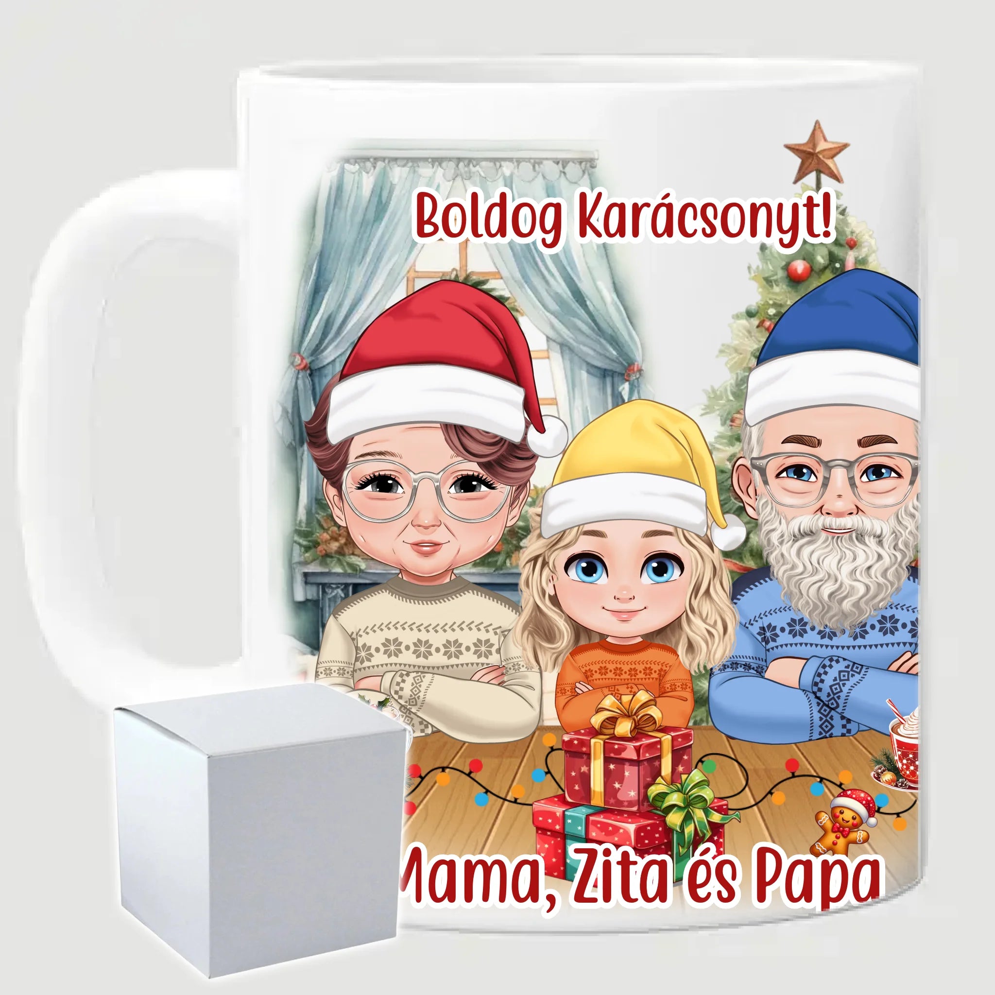 Egyedi karakteres karácsonyi bögre nagyszülők és gyerekek minta