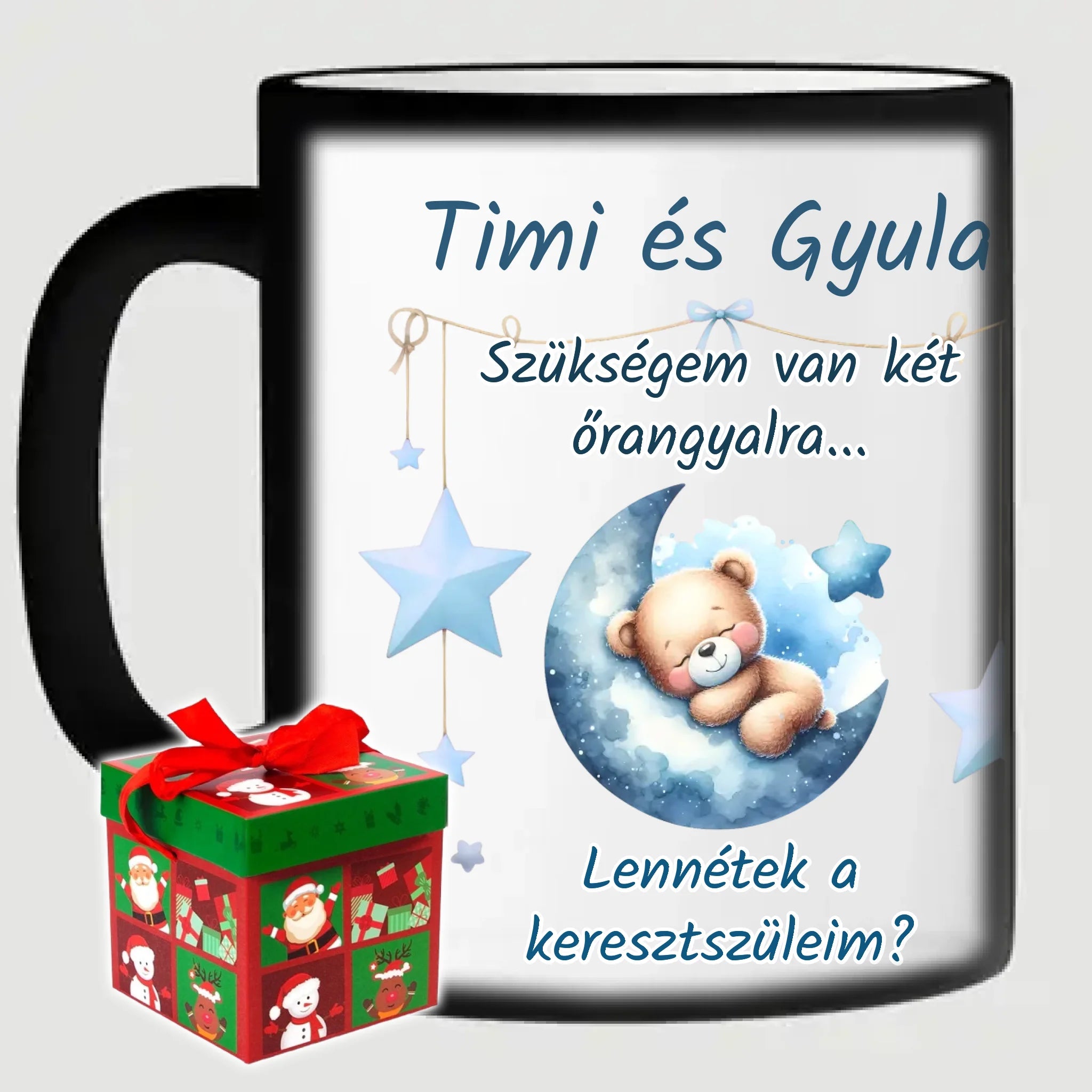Egyedi fényképes bögre a keresztszülők felkérésére, a saját fotóddal. Az egyedi fényképes bögre remek ajándék a leendő keresztszülők számára. Az egyedi bögre nyomtatása nagyon magas hőfokon történik, ezáltal az anyag szerkezetébe sütjük bele, így a nyomat rendkívül tartós lesz és nem kopik, nem fakul ki. A fényképes bögréhez bármilyen fotót választhatsz, illetve feliratot is adhatsz hozzá.