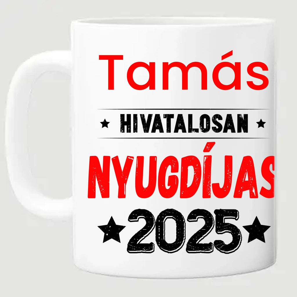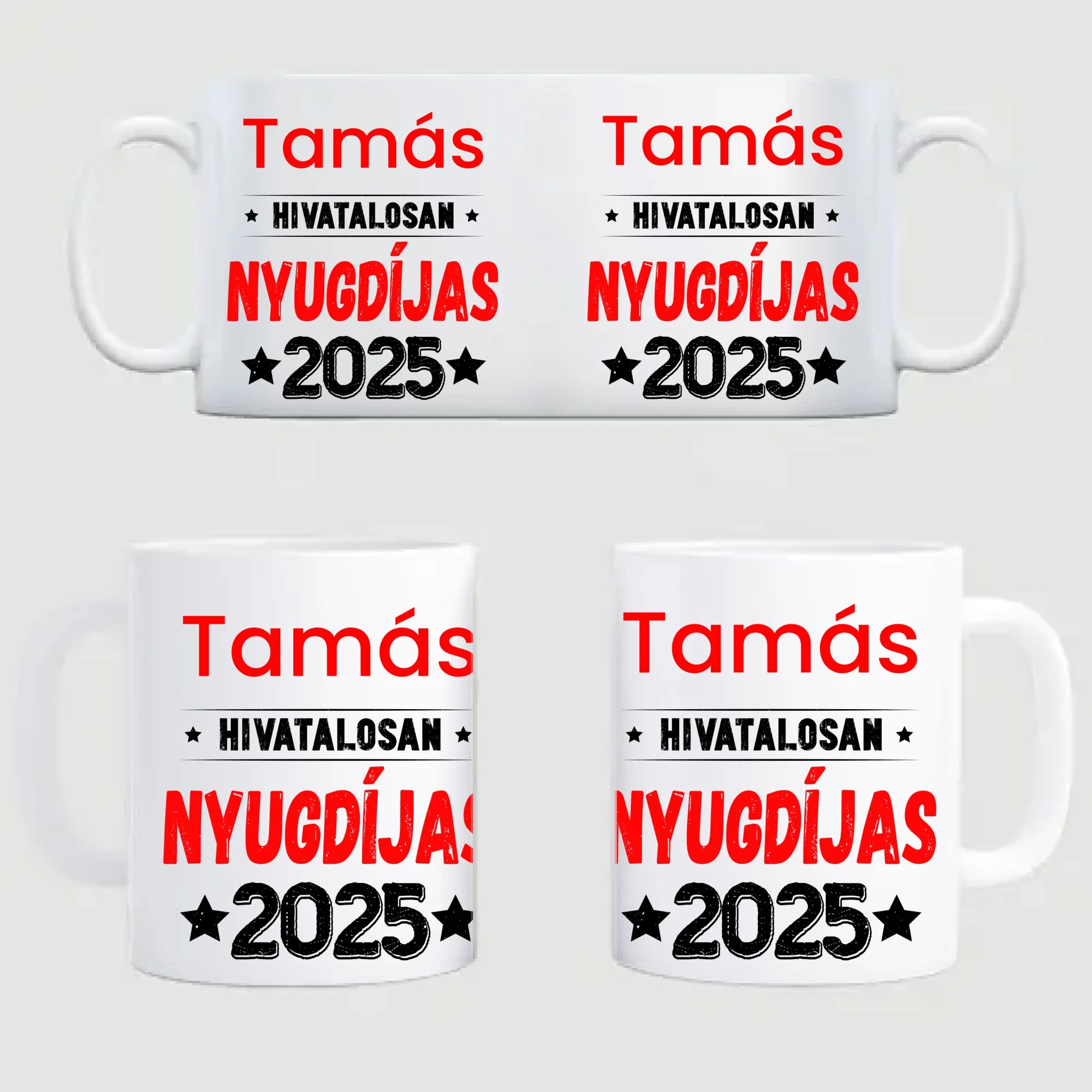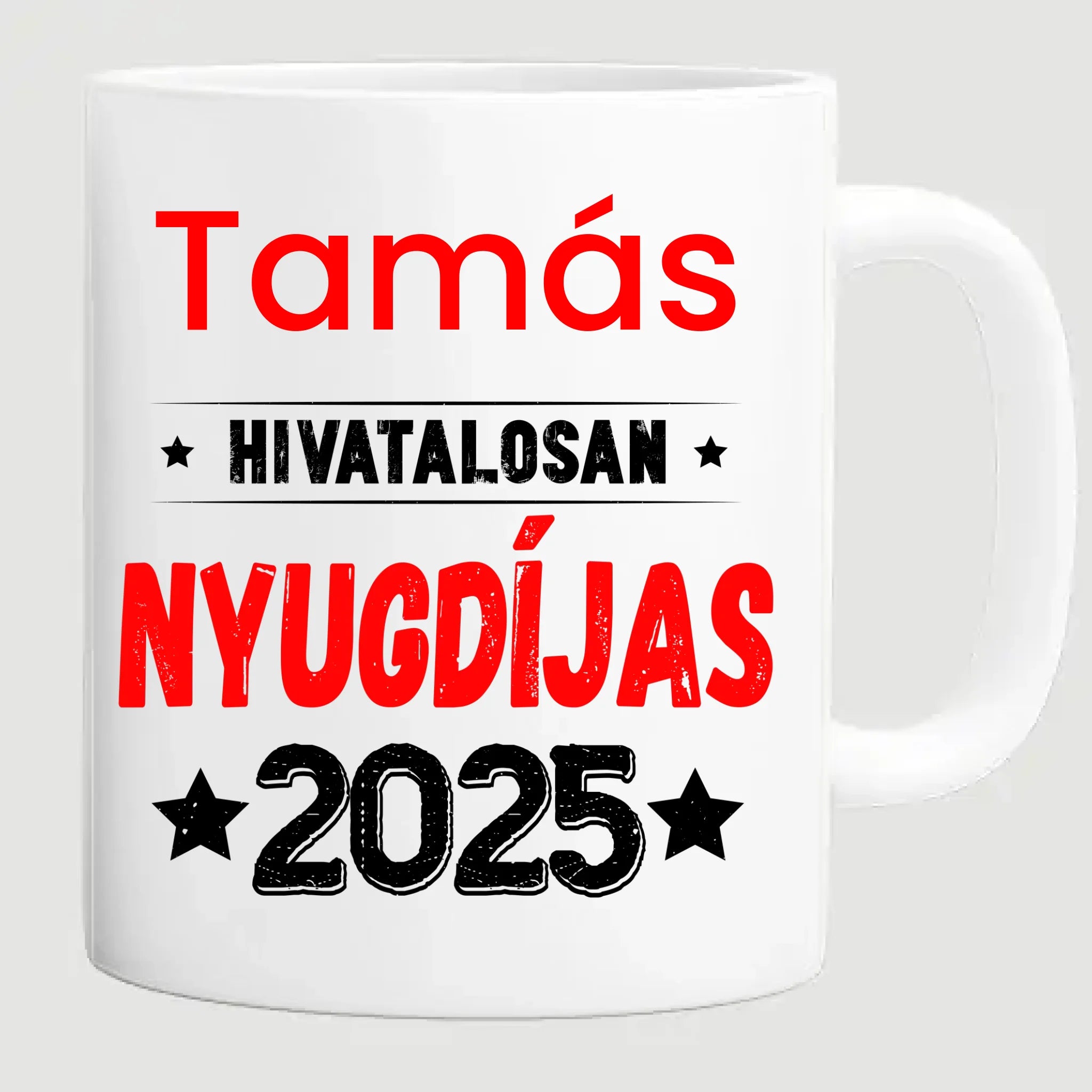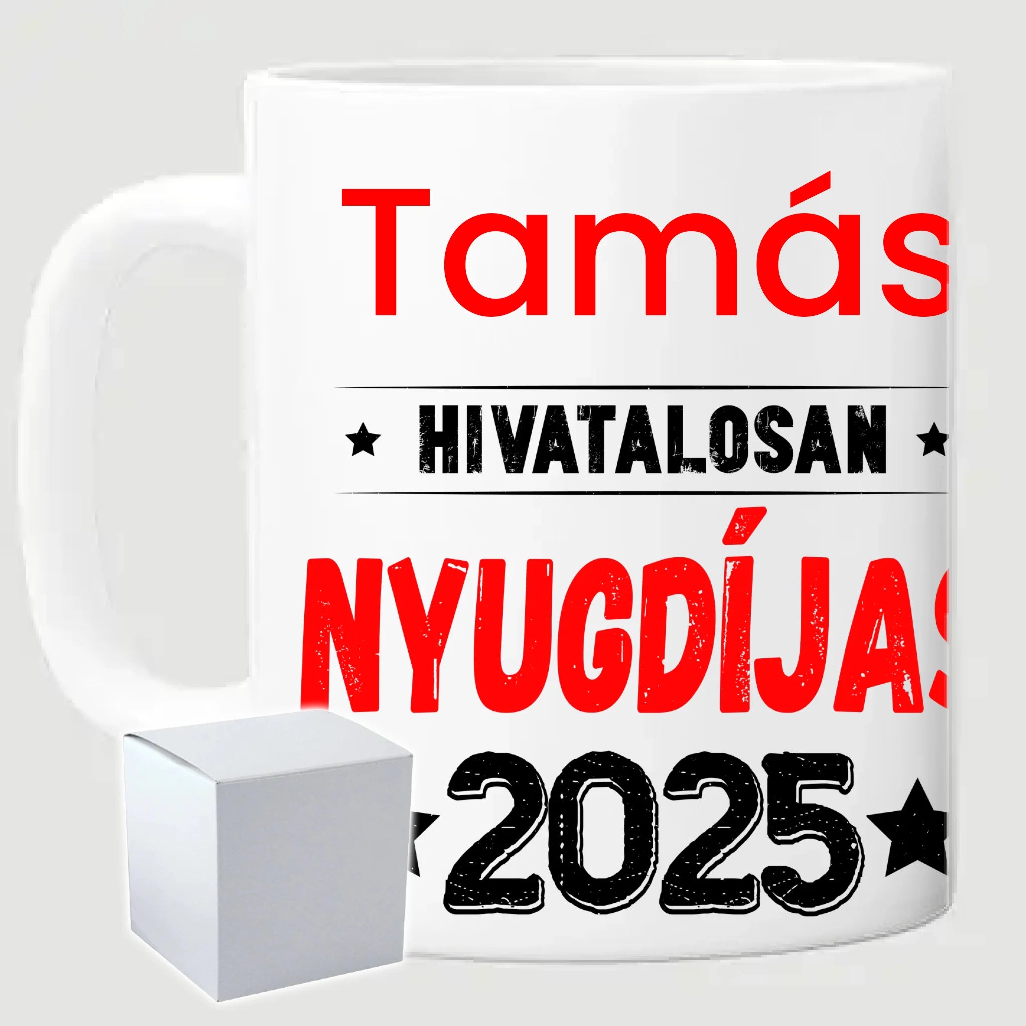 Hivatalosan nyugdíjas bögre névvel - nyugdíjas búcsúztató ajándék