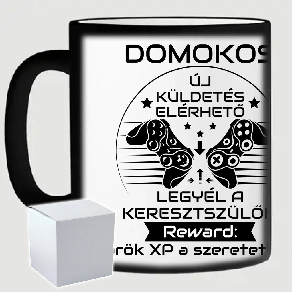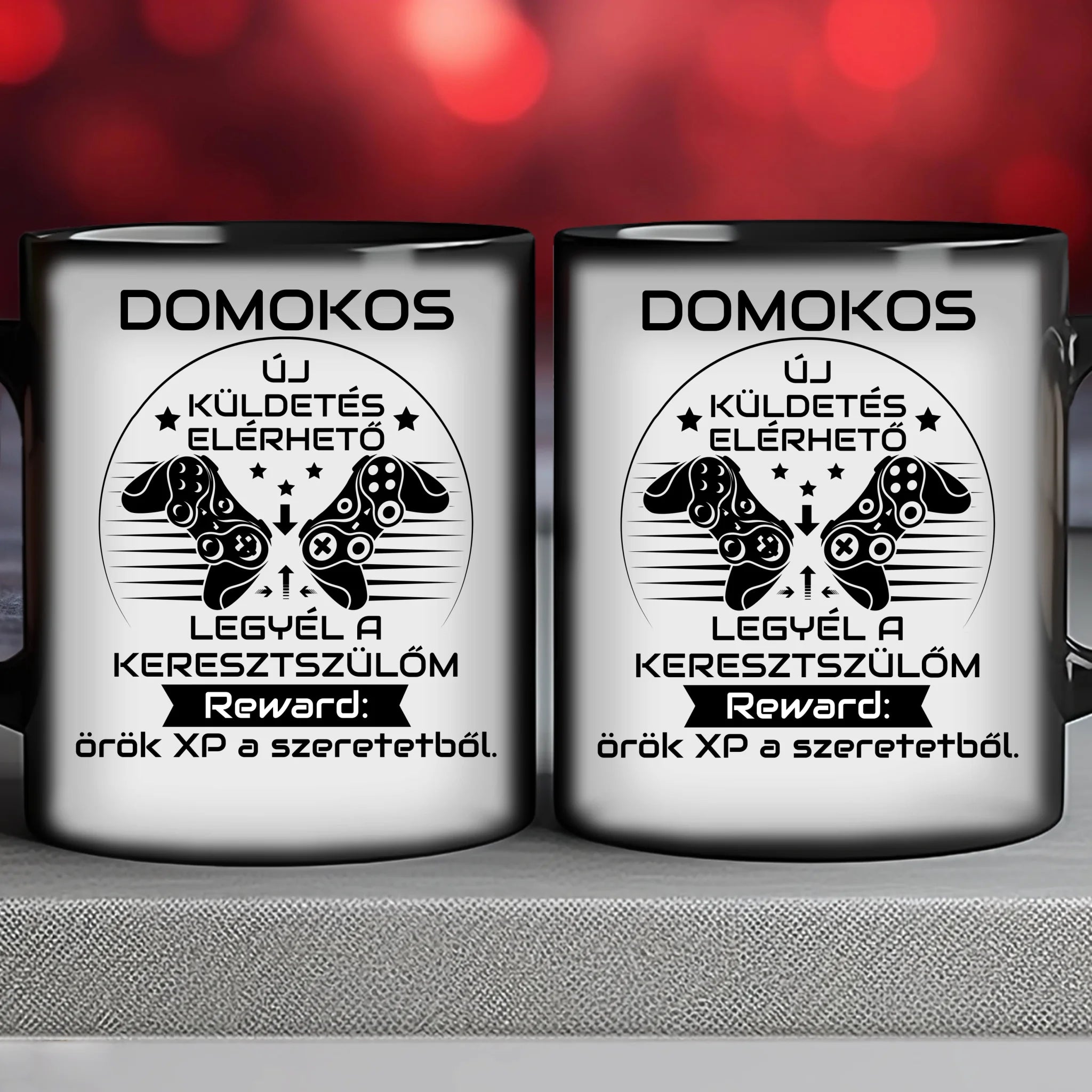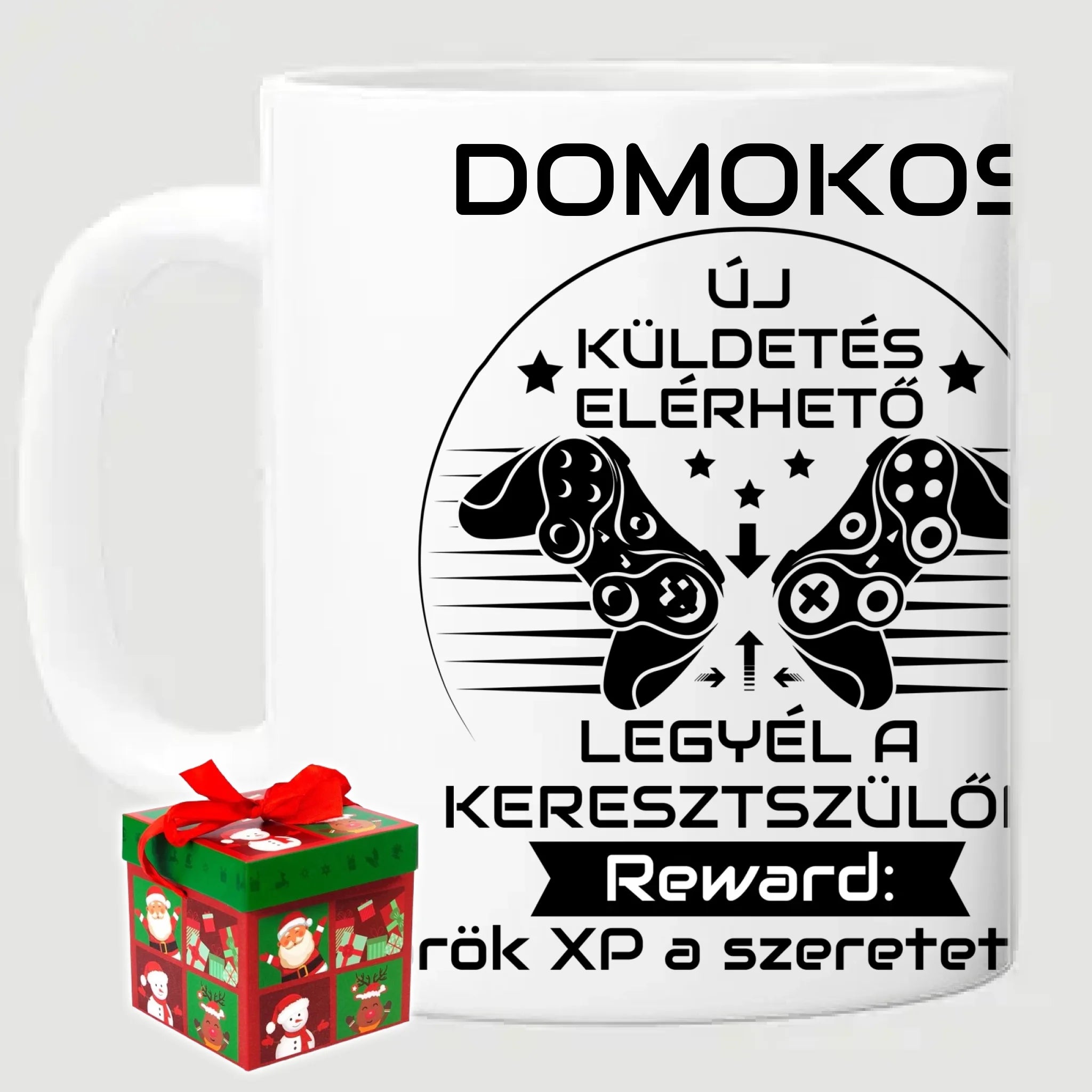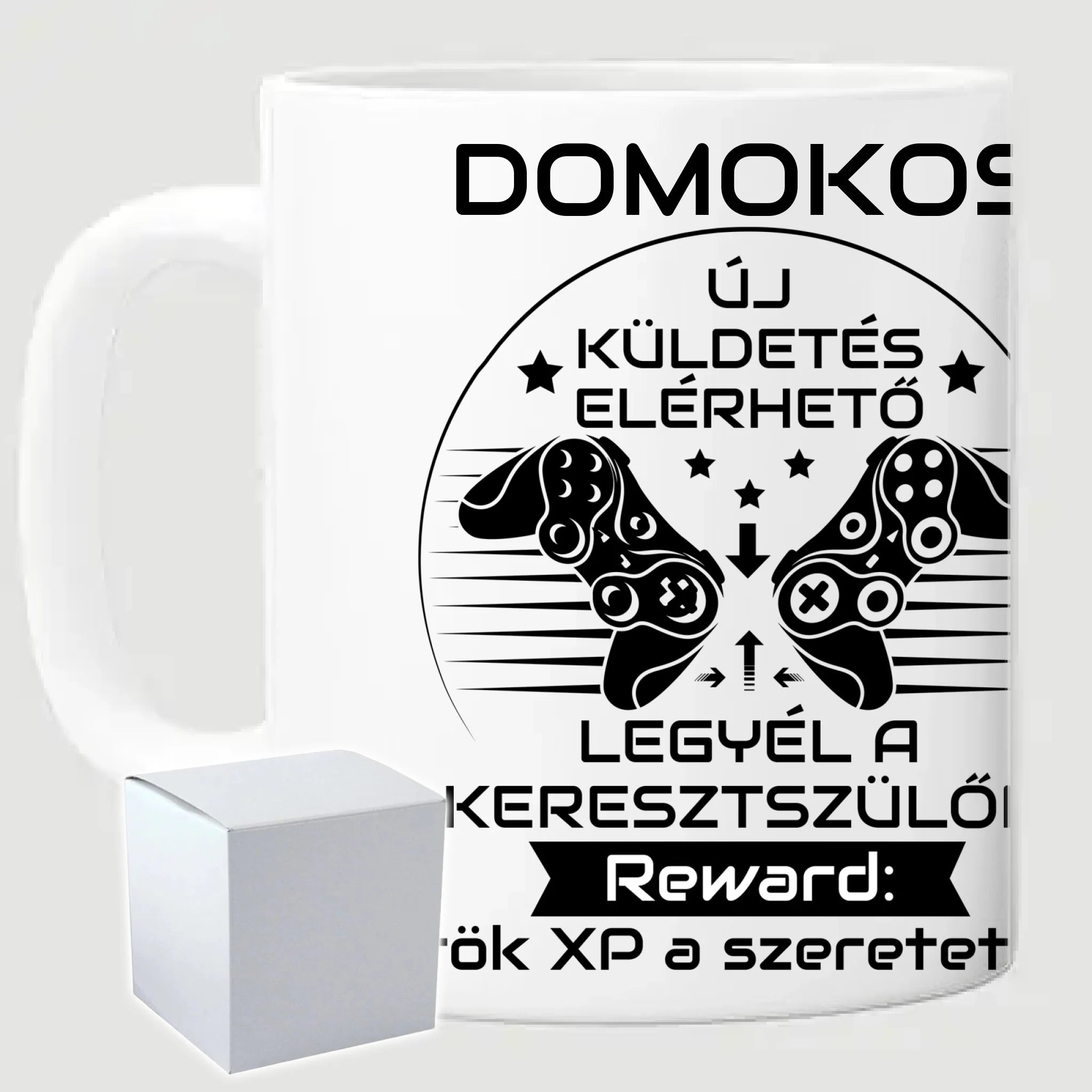 Keresztszülő felkérő bögre – gamer stílus, egyedi névvel