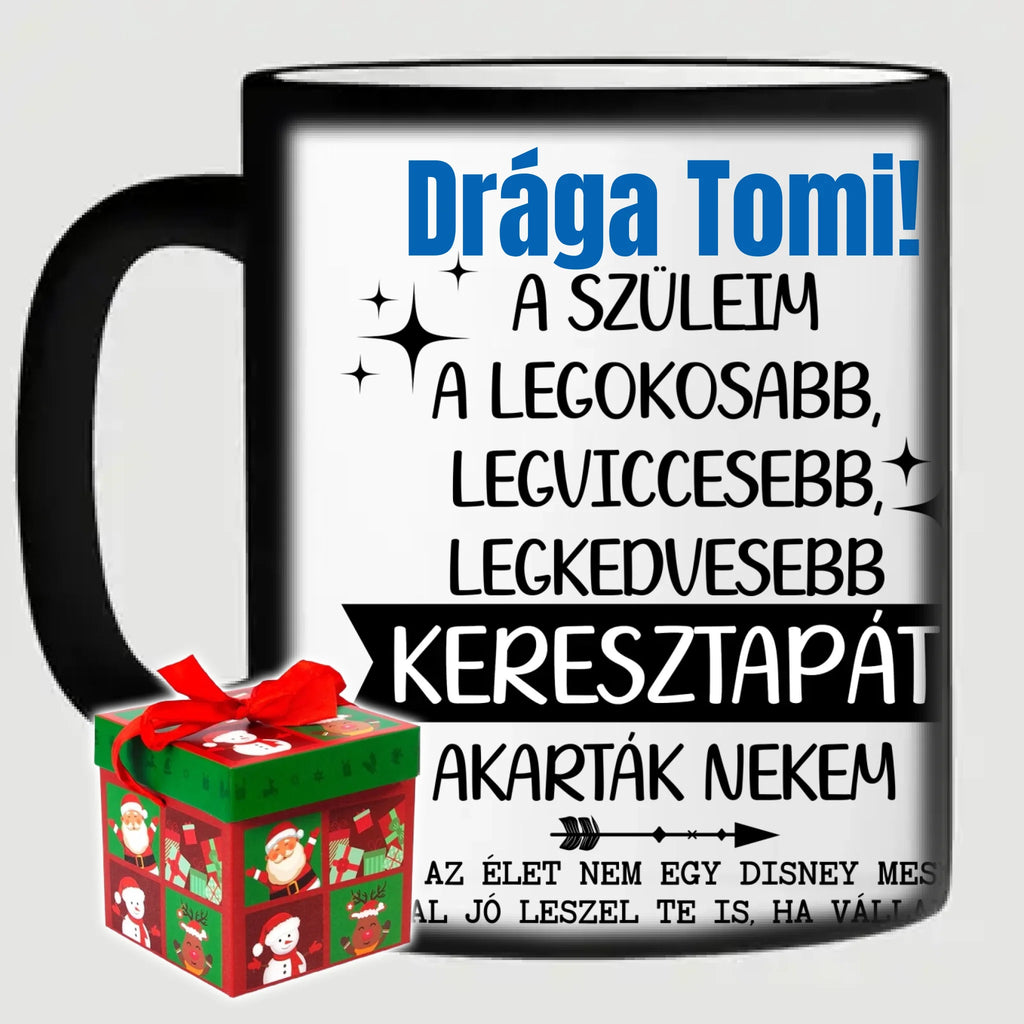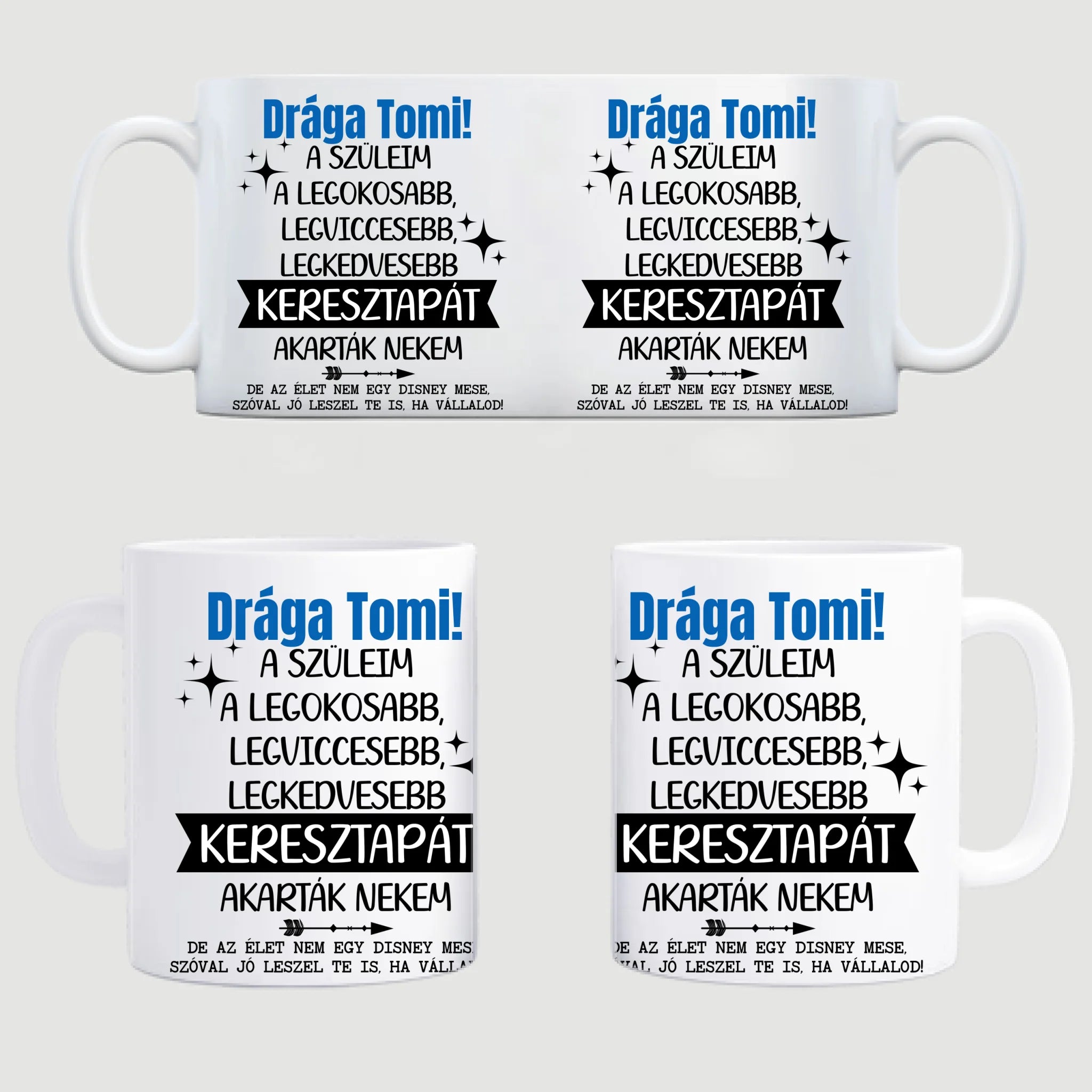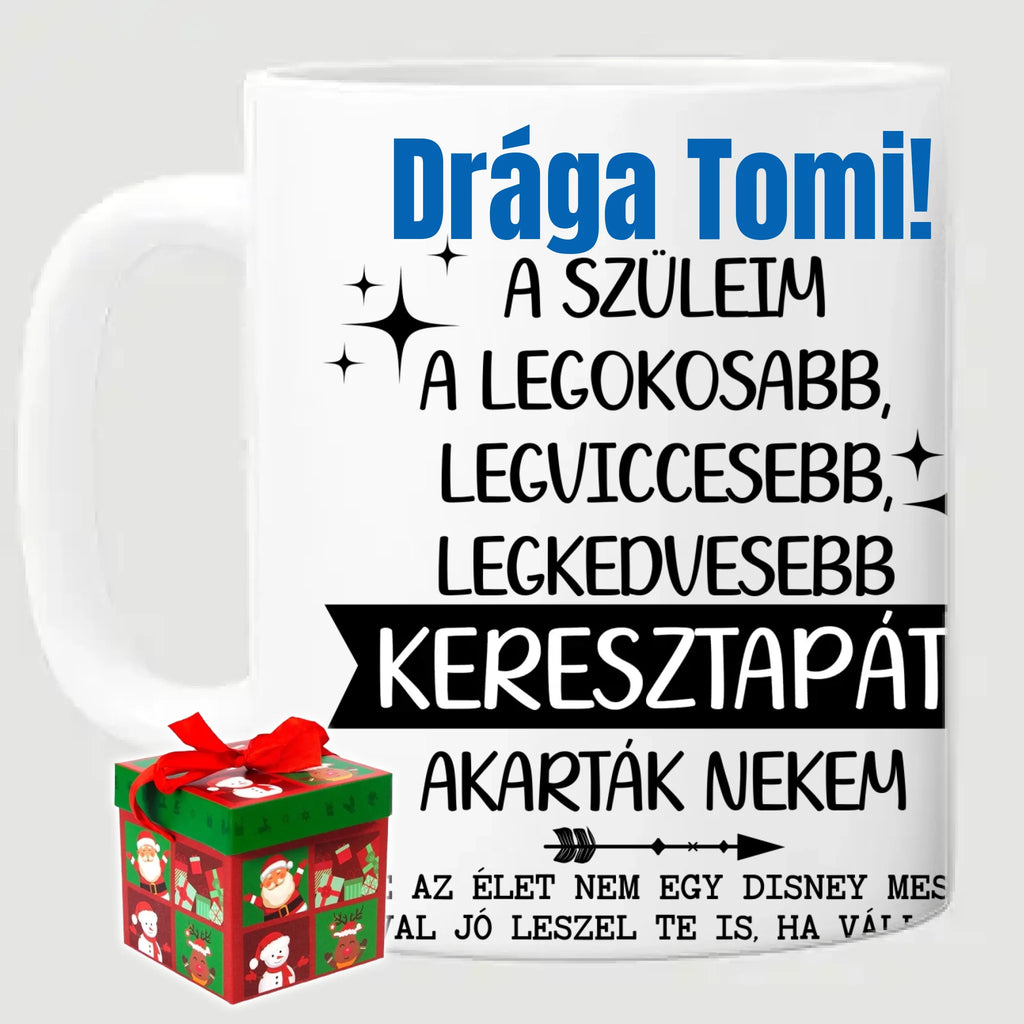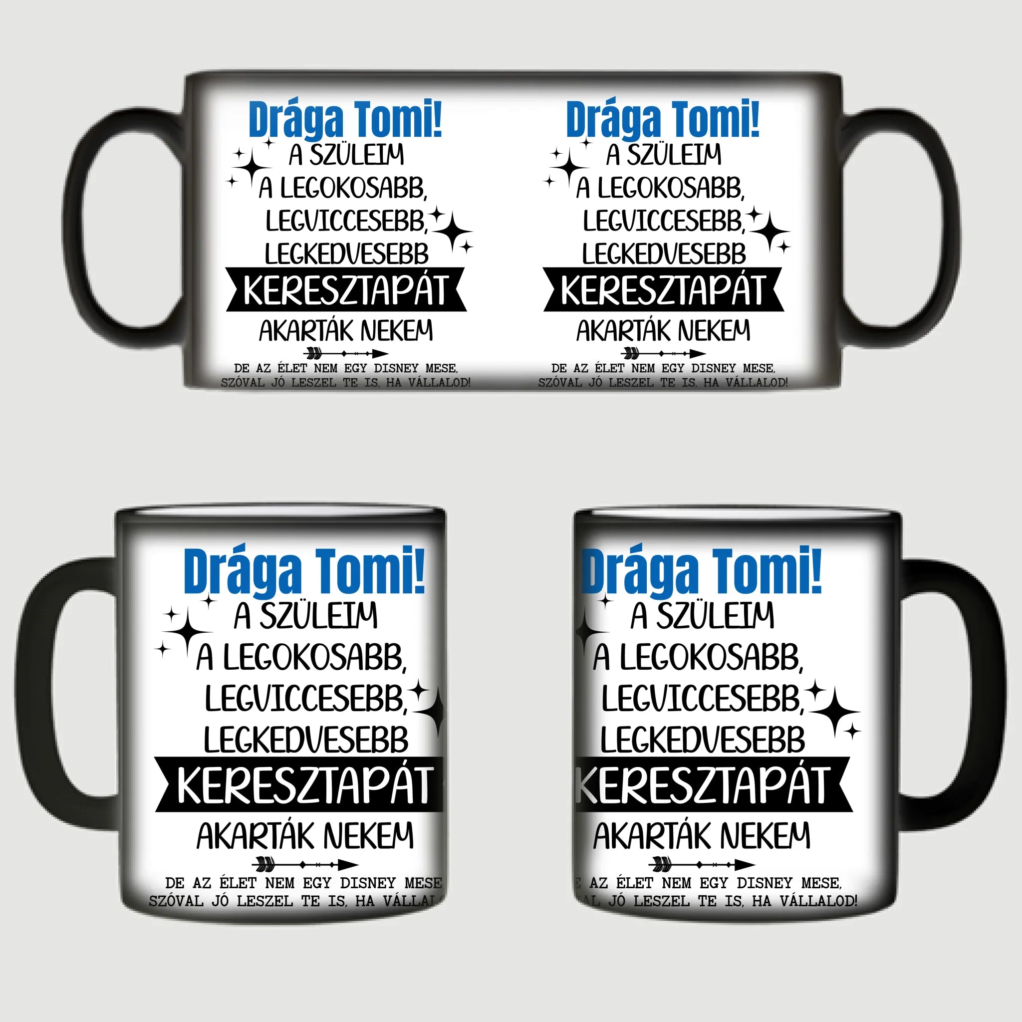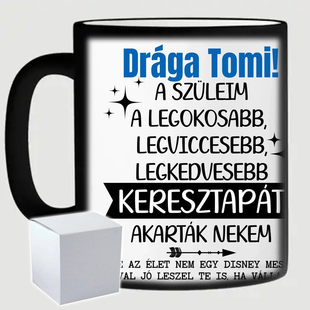 Szeretnéd különleges módon felkérni a leendő keresztanyát vagy keresztapát? Egy egyedi bögre nemcsak praktikus ajándék, hanem felejthetetlen meglepetés is! A személyre szabható feliratnak és akár fotónak köszönhetően a bögre garantáltan mosolyt csal az ajándékozott arcára – és minden reggeli kávé emlékeztetni fogja a nagy pillanatra.