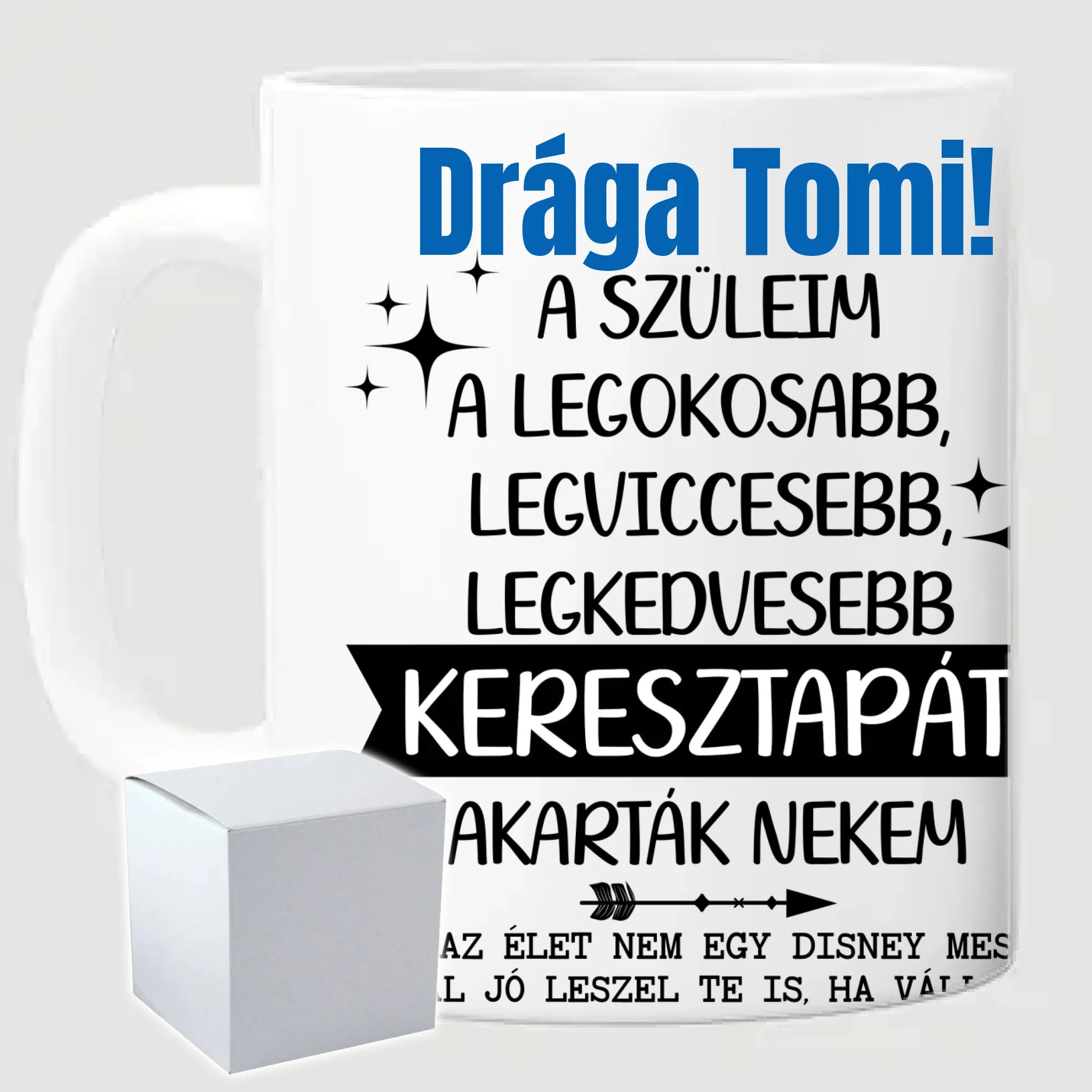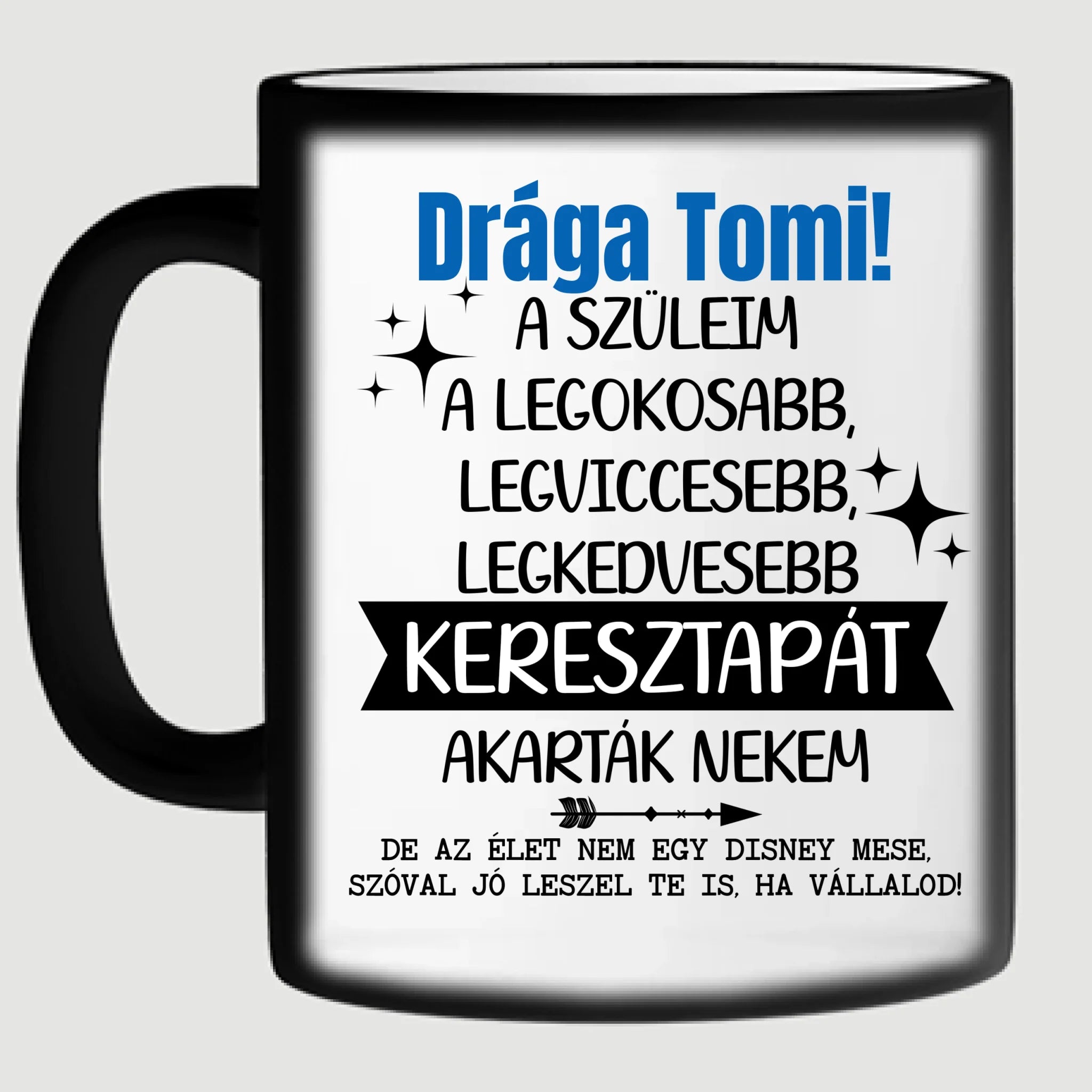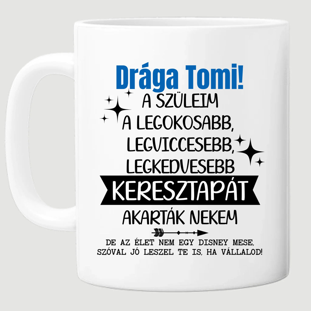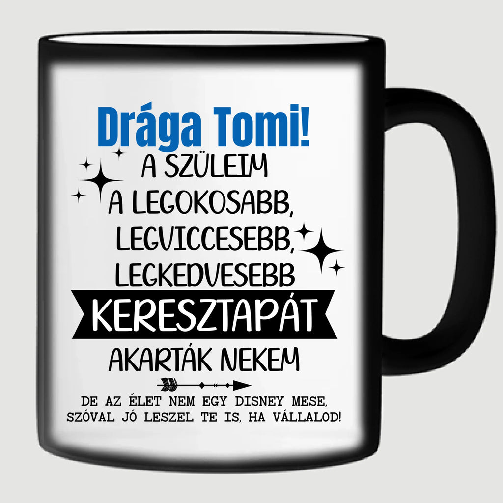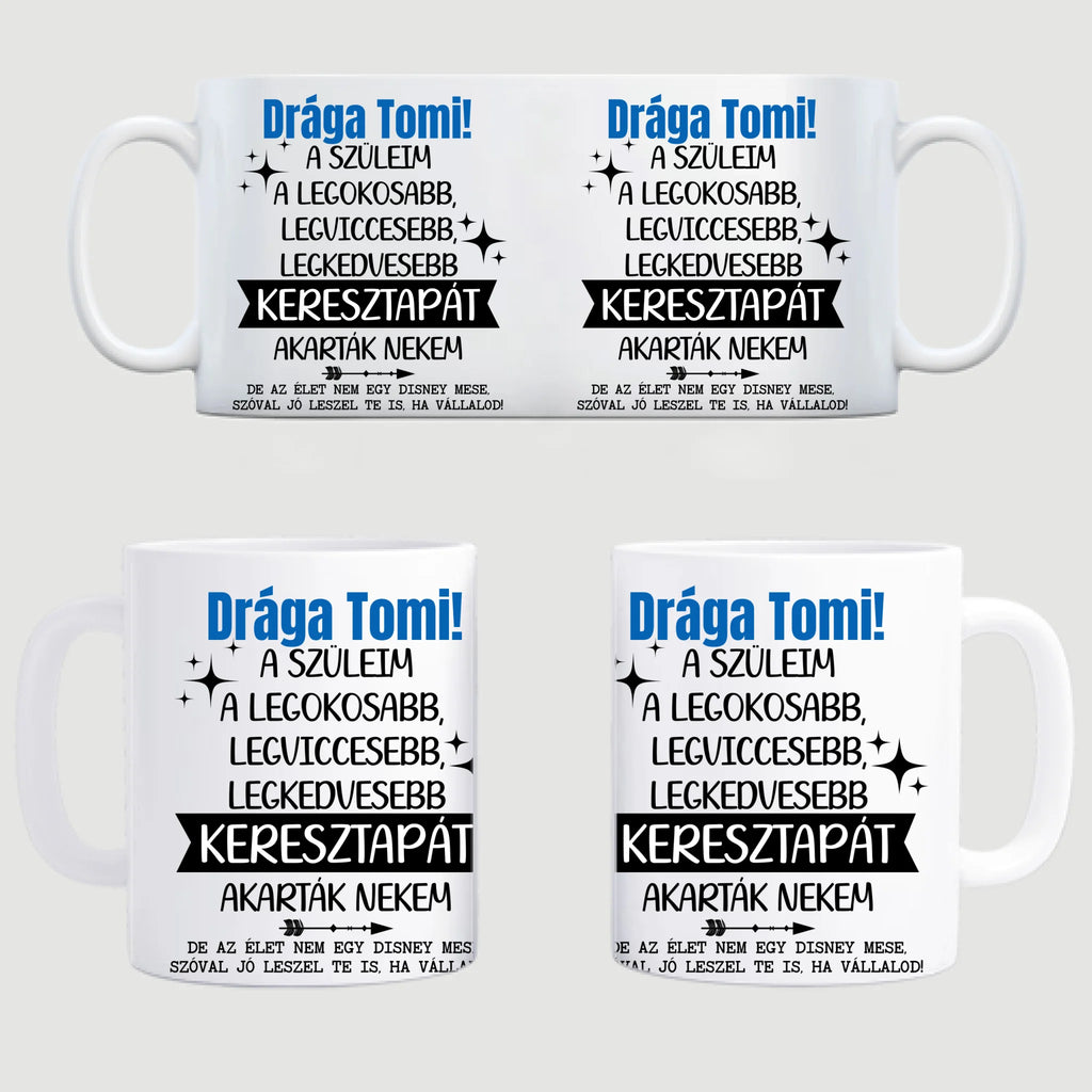 Szeretnéd különleges módon felkérni a leendő keresztanyát vagy keresztapát? Egy egyedi bögre nemcsak praktikus ajándék, hanem felejthetetlen meglepetés is! A személyre szabható feliratnak és akár fotónak köszönhetően a bögre garantáltan mosolyt csal az ajándékozott arcára – és minden reggeli kávé emlékeztetni fogja a nagy pillanatra.