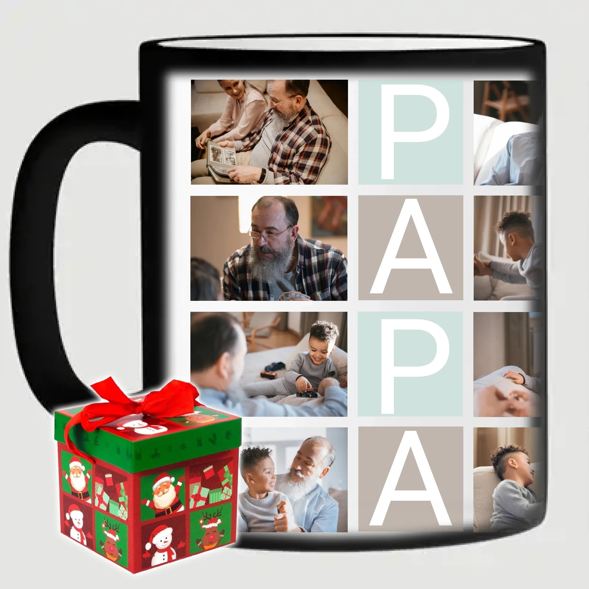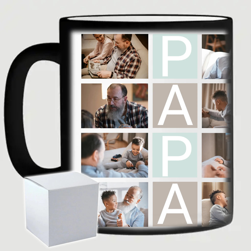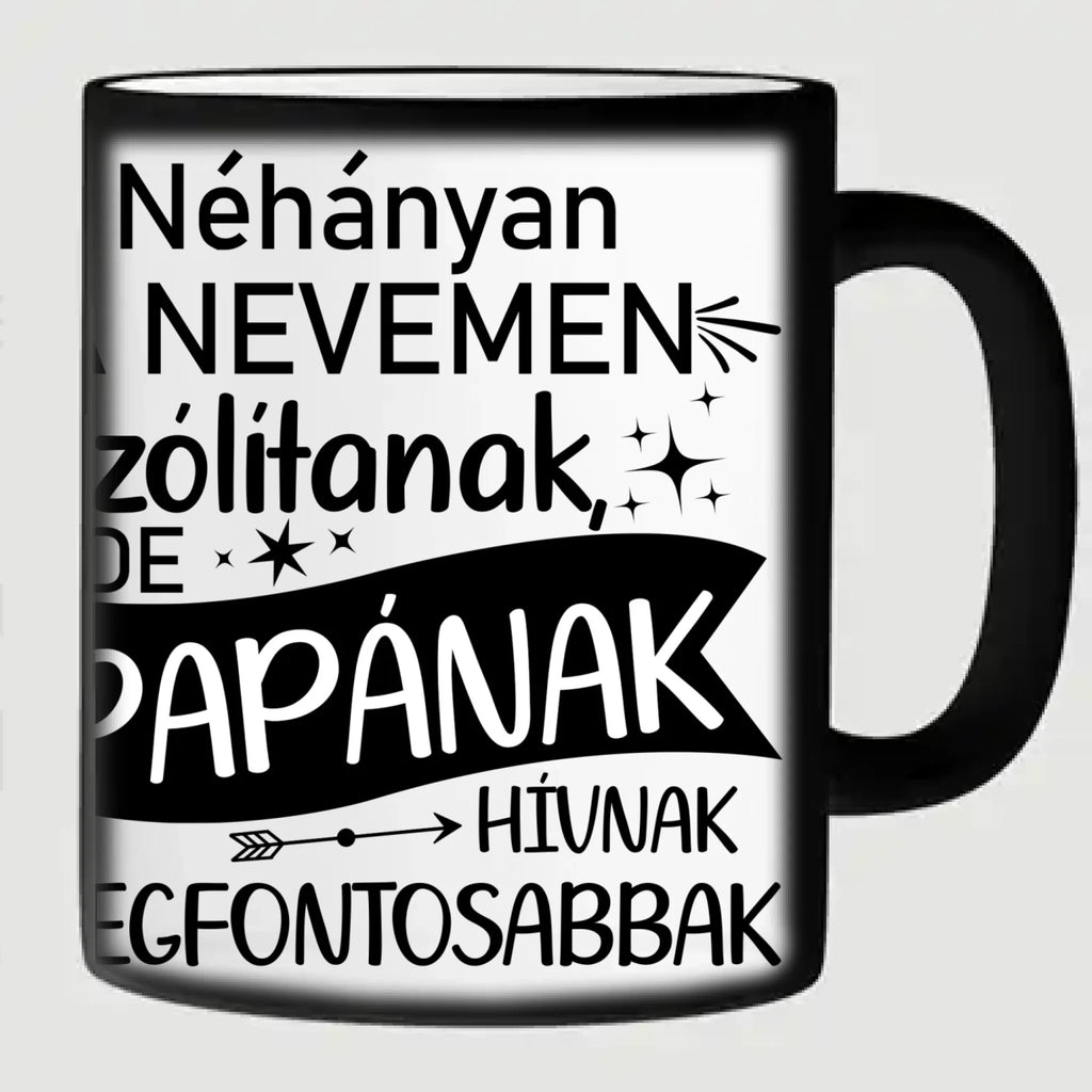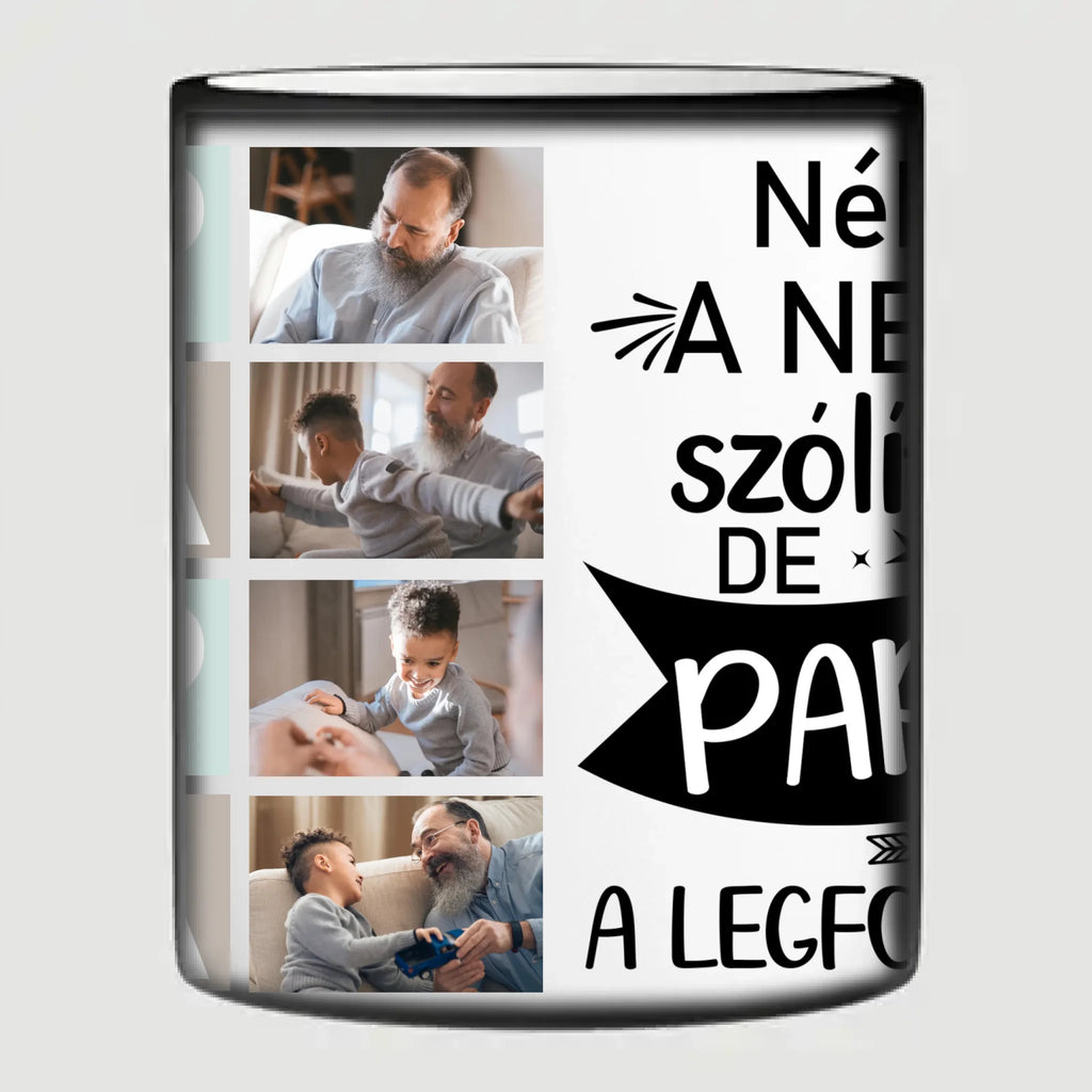 Egyedi fényképes bögre papának választható felirattal. Az egyedi fényképes bögre remek ajándék Apák napjára és születésnapra is. Az egyedi bögre nyomtatása nagyon magas hőfokon történik, ezáltal az anyag szerkezetébe sütjük bele, így a nyomat rendkívül tartós lesz és nem kopik, nem fakul ki. A fényképes bögréhez bármilyen fotót választhatsz, illetve feliratot is adhatsz hozzá.