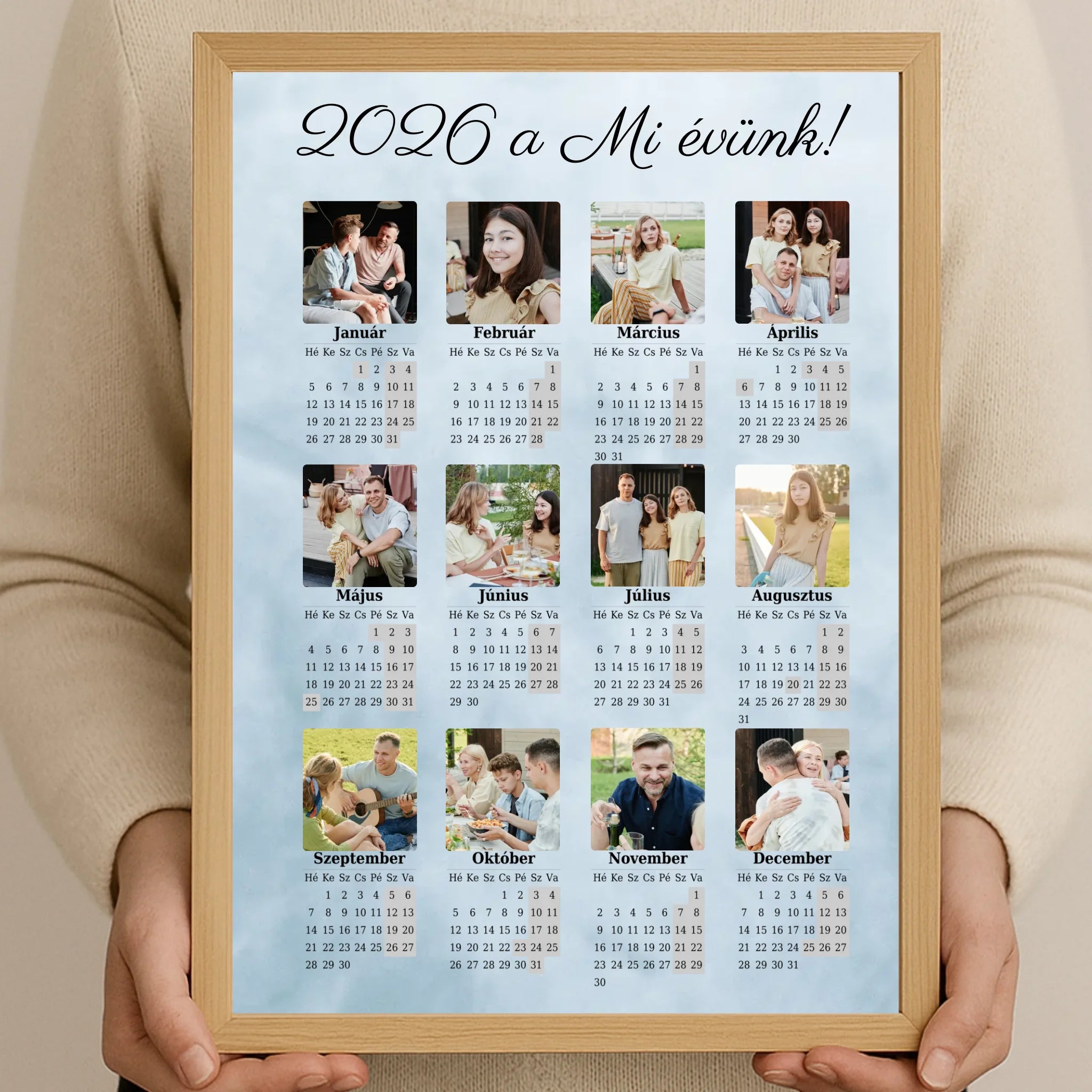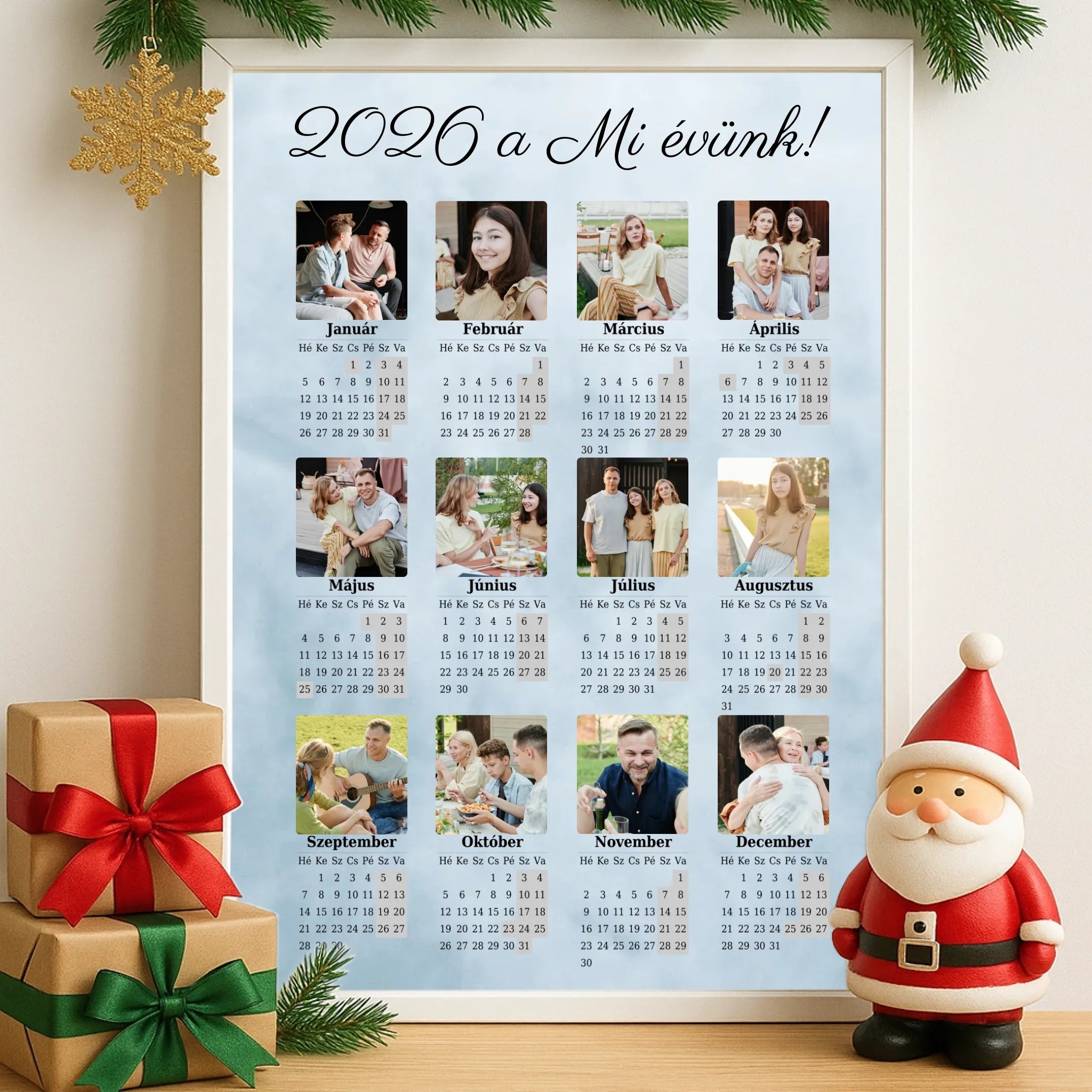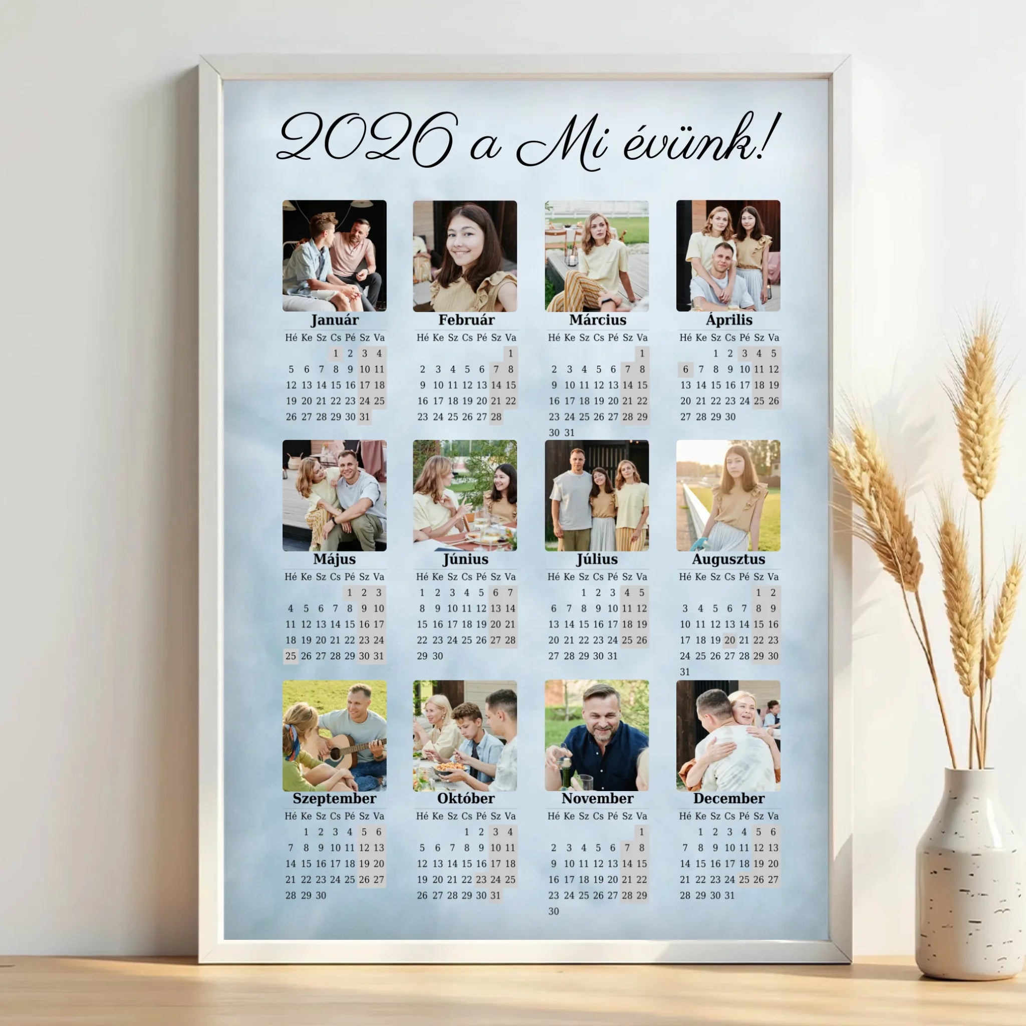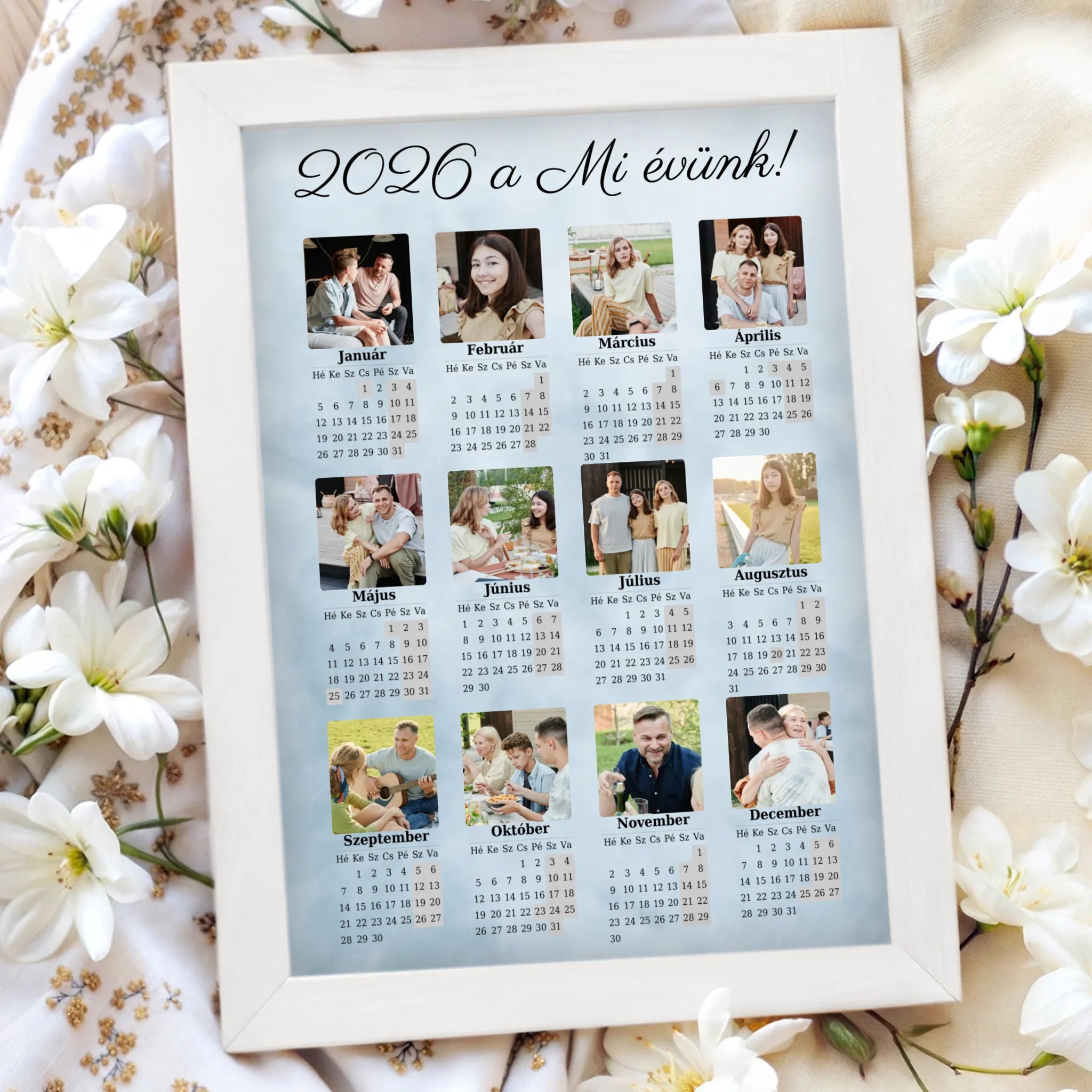 Tedd különlegessé otthonodat vagy ajándékozz személyre szabott meglepetést a 12 képes egyoldalas falinaptárunkkal! A 2026-os év teljes naptára áttekinthető formában jelenik meg, miközben a kiválasztott fényképeid harmonikusan díszítik a kompozíciót.