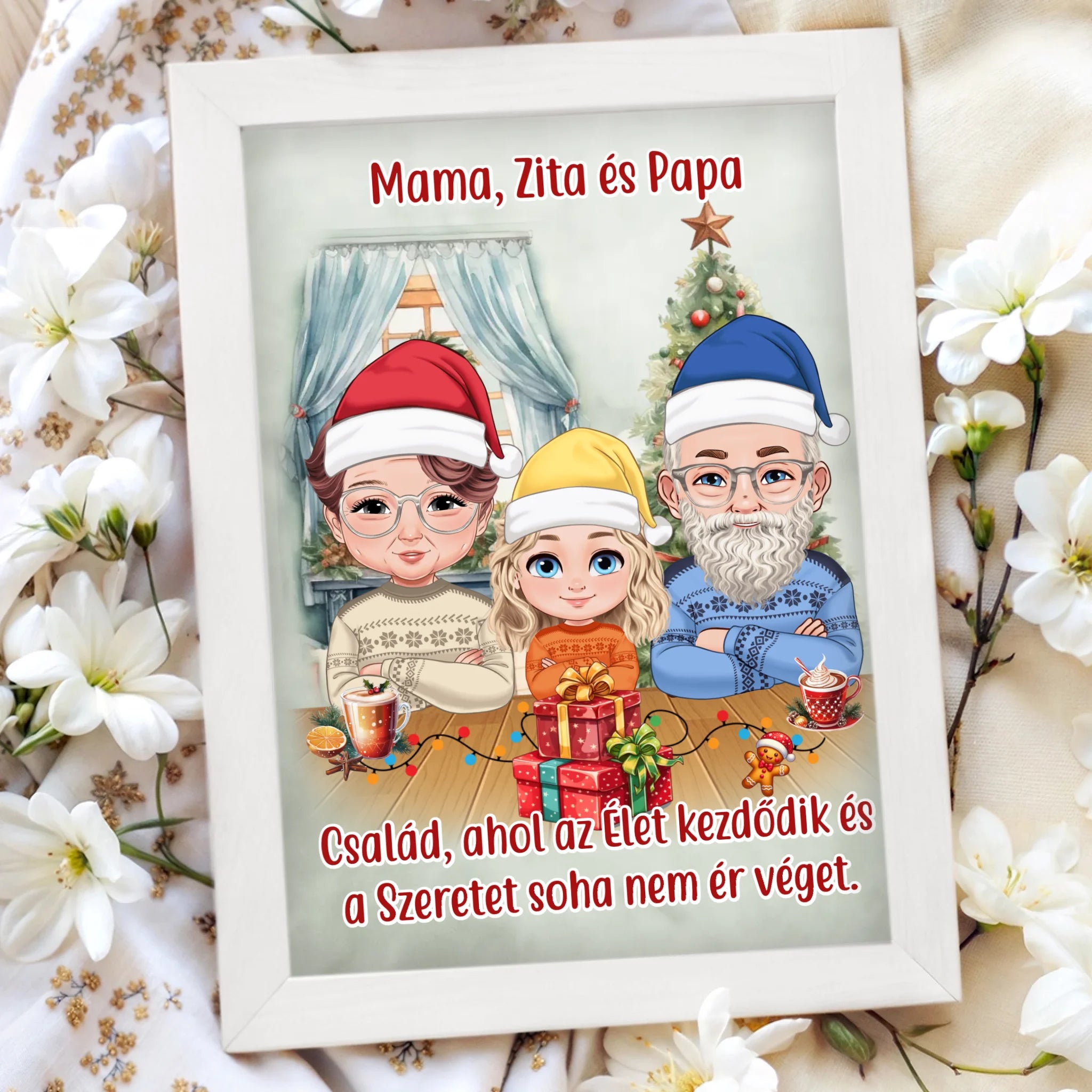 Tedd varázslatossá az ünnepeket egy egyedi karácsonyi faliképpel, amelyen a nagyszülők és az unokák együtt szerepelhetnek személyre szabható karakterekkel. Ez a kedves illusztráció a szeretet és az összetartozás tökéletes megtestesítője – családi ajándéknak is tökéletes.