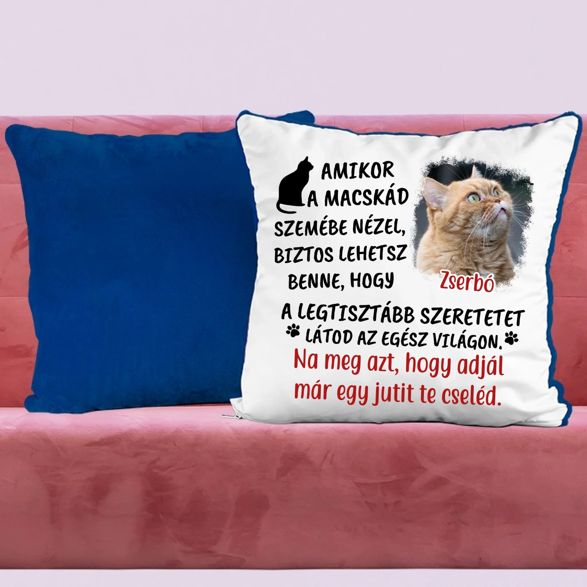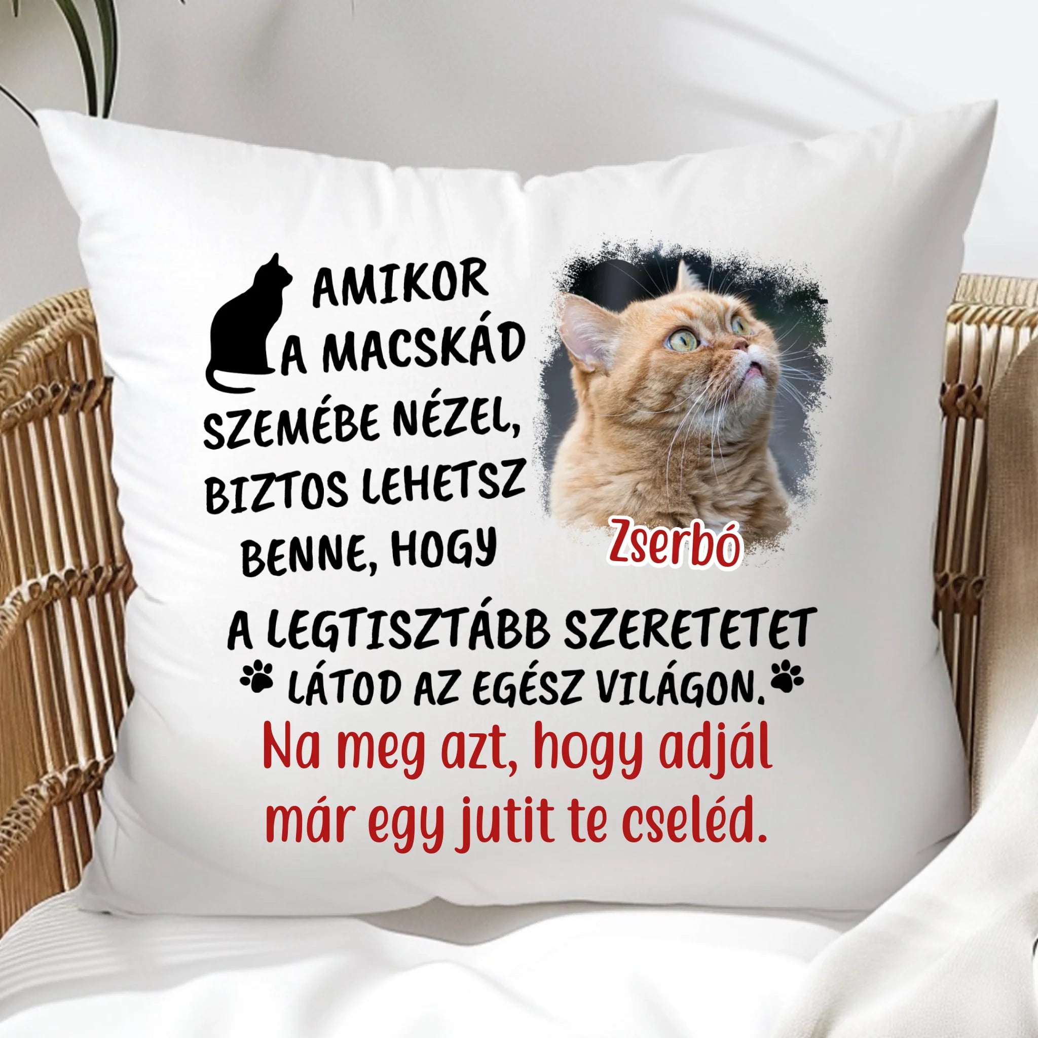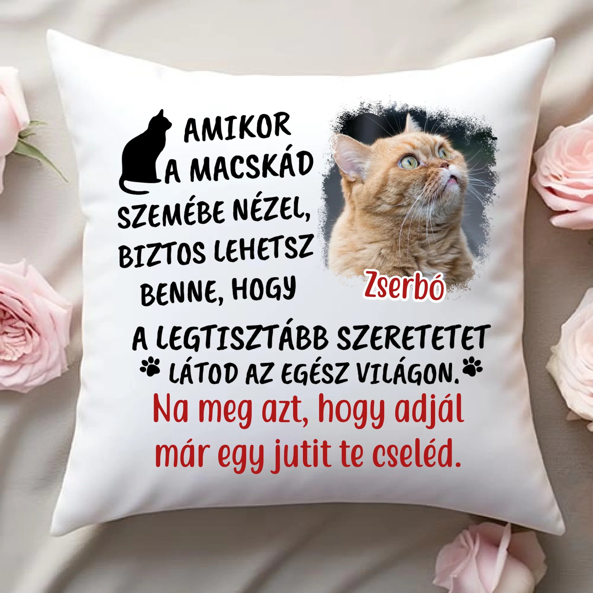 Egyedi fényképes párna macska gazdiknak személyre szabható felirattal