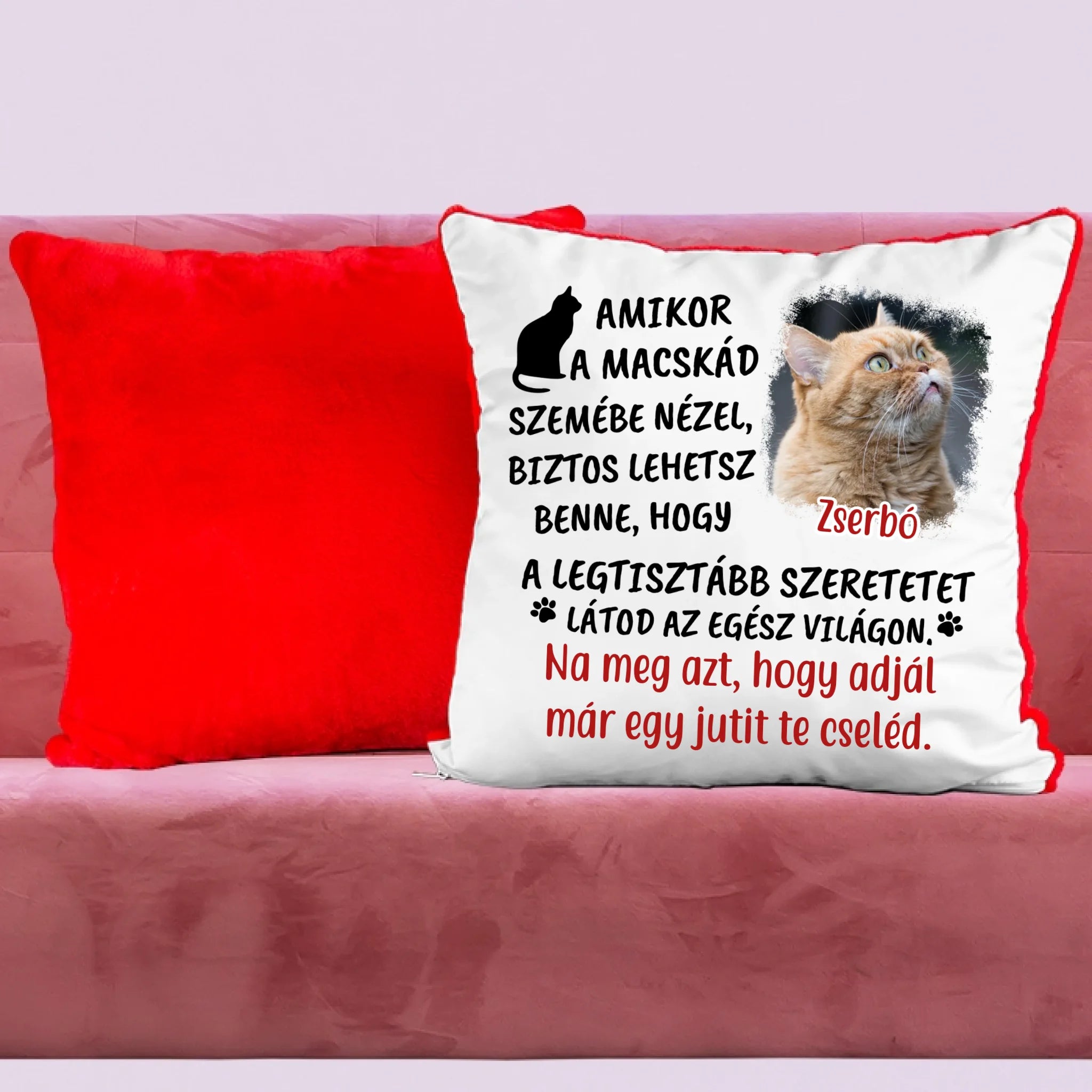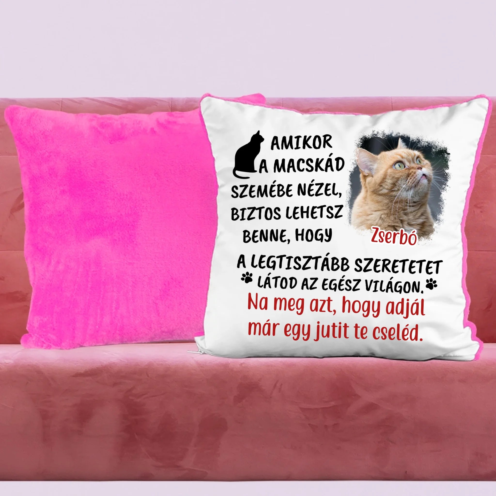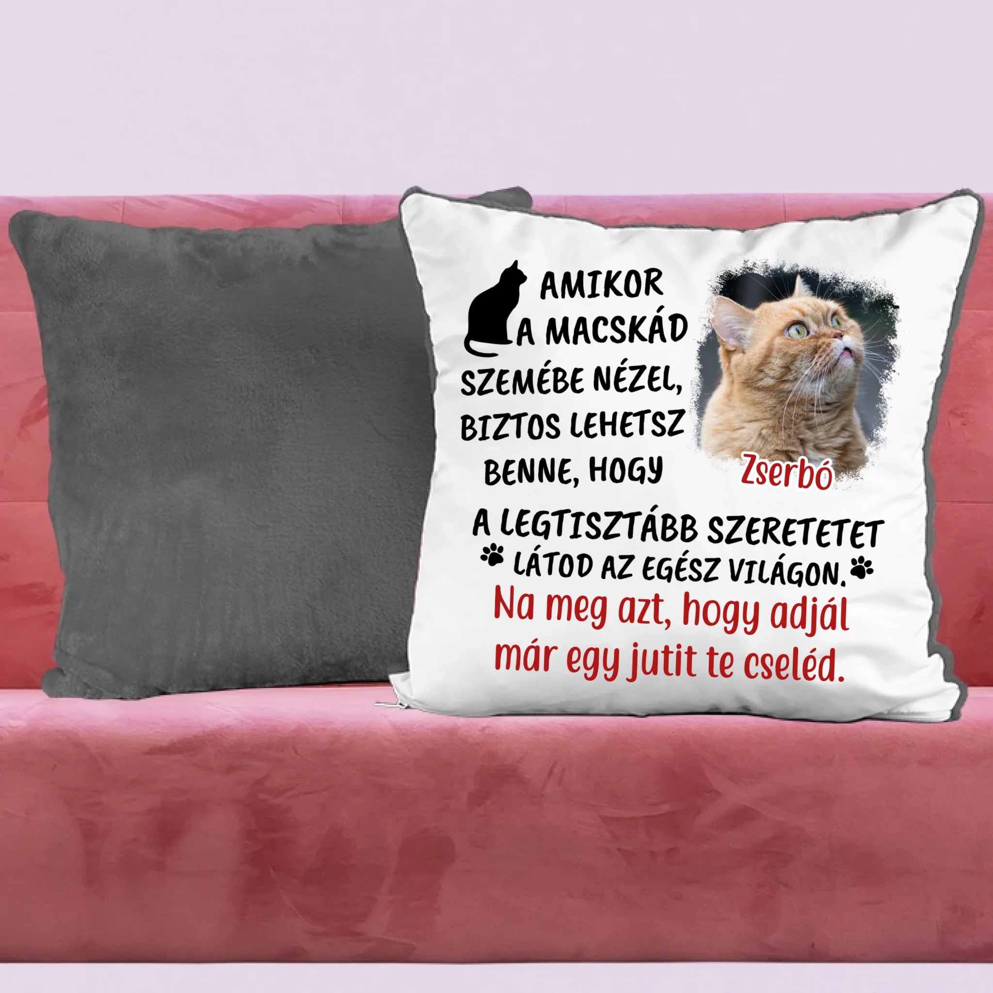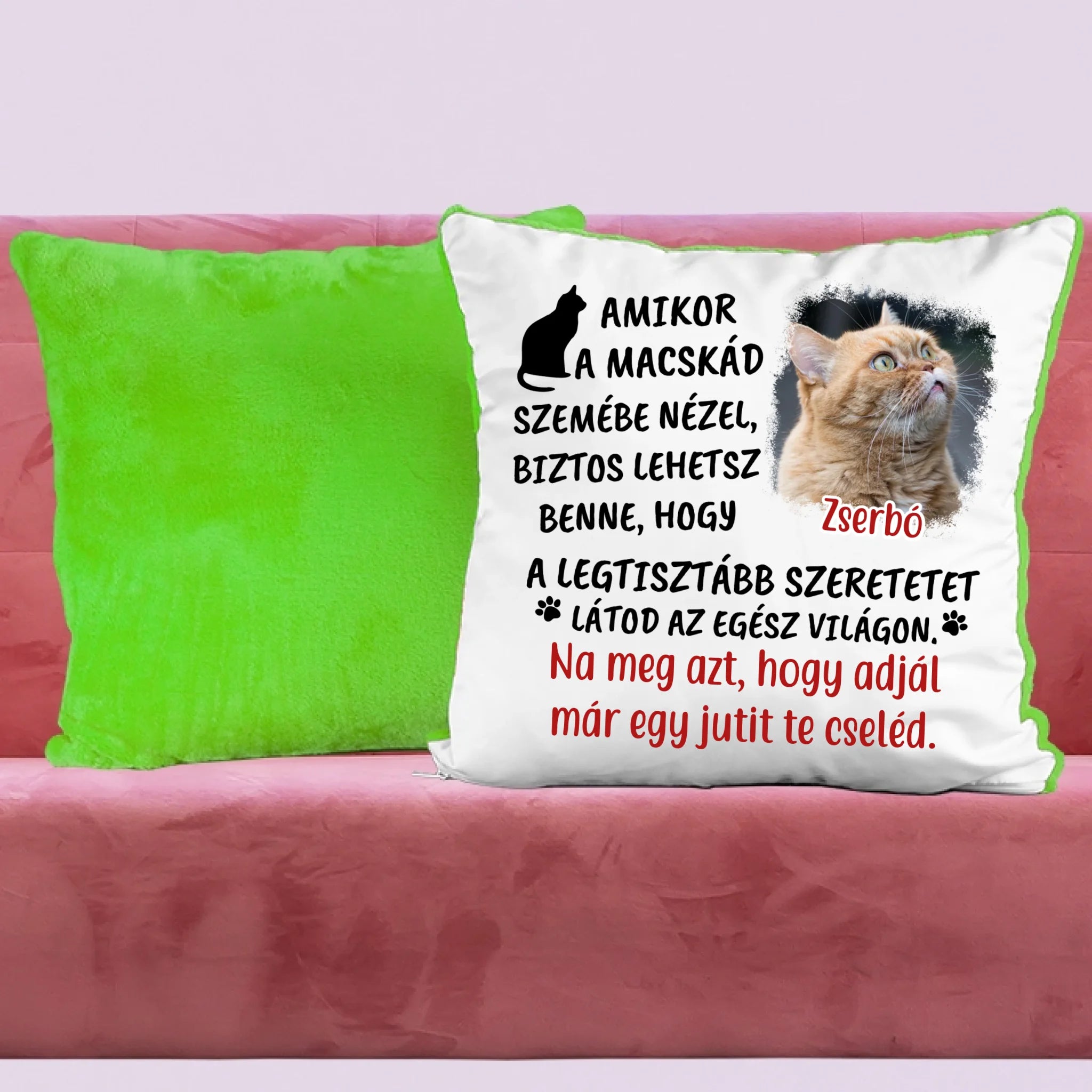 Egyedi fényképes párna macska gazdiknak személyre szabható felirattal