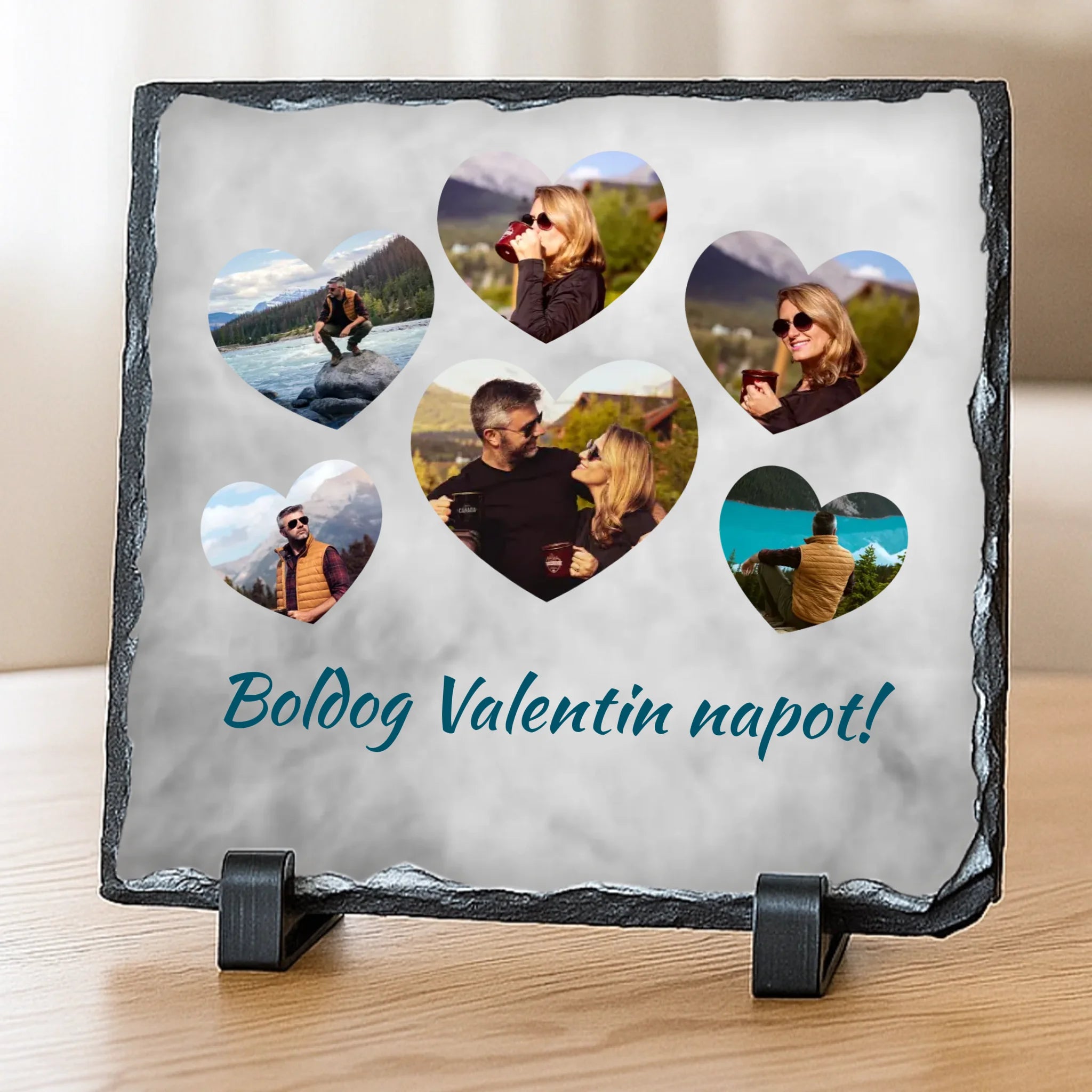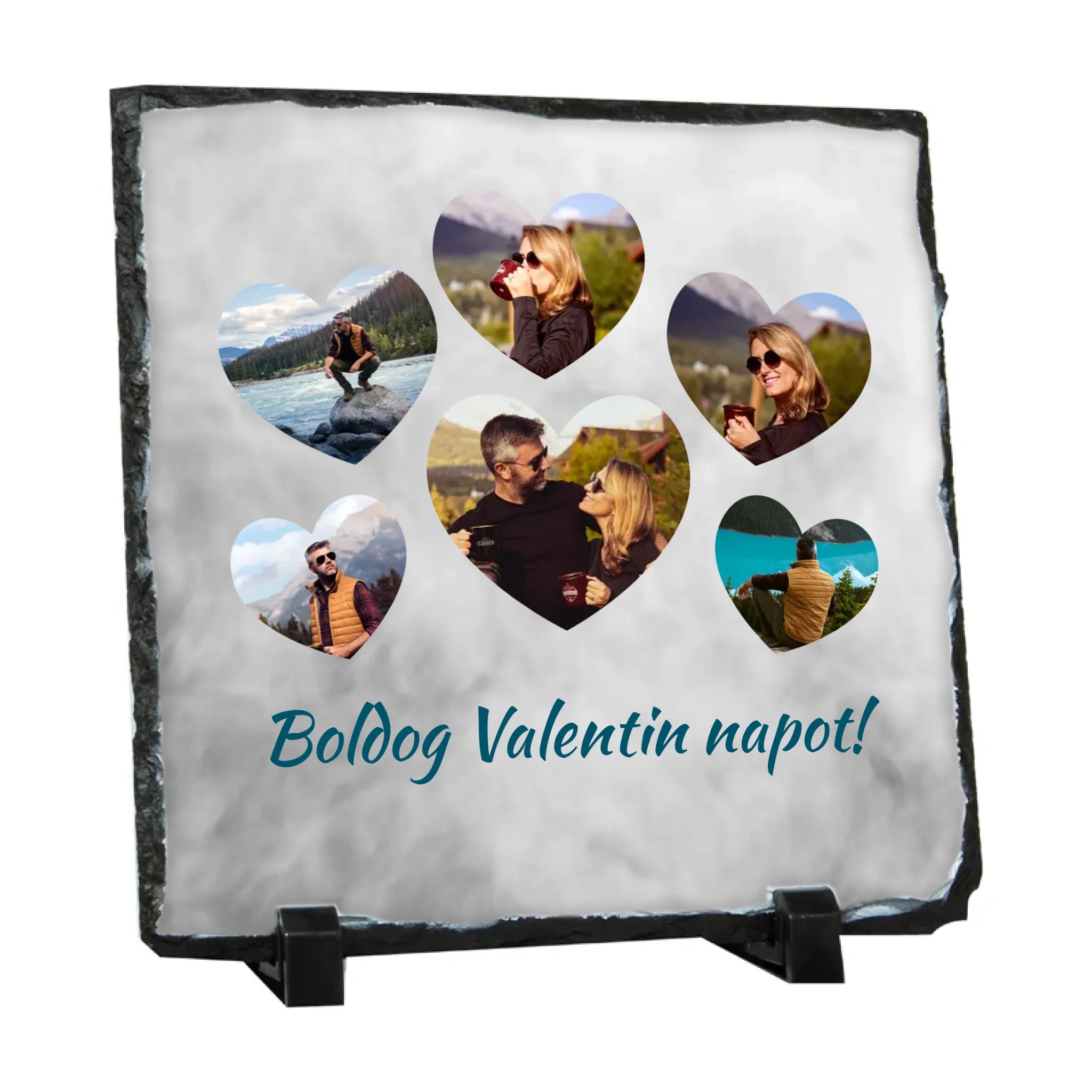 Egyedi fotókő pároknak 6 szív alakú képpel és felirattal