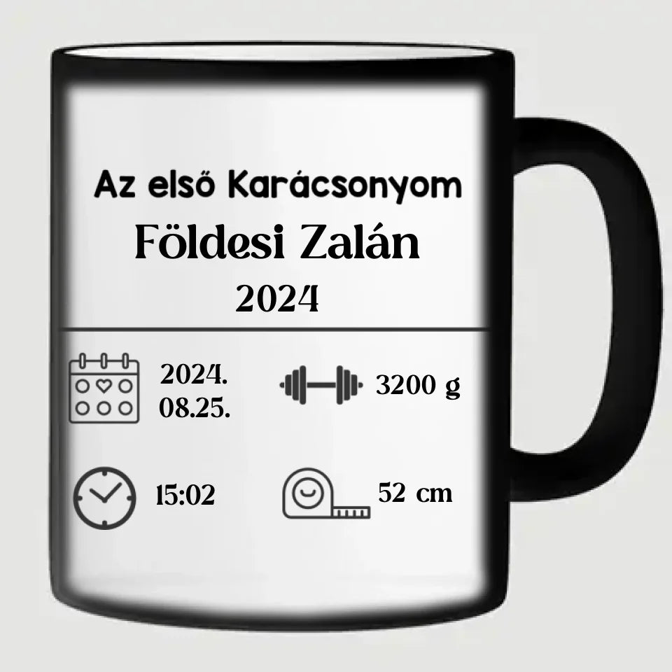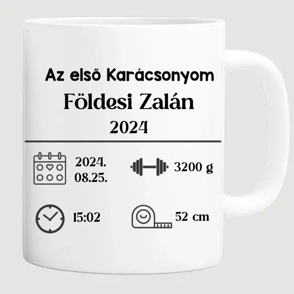 Az első Karácsonyom - bögre a baba adataival és választható állatkával