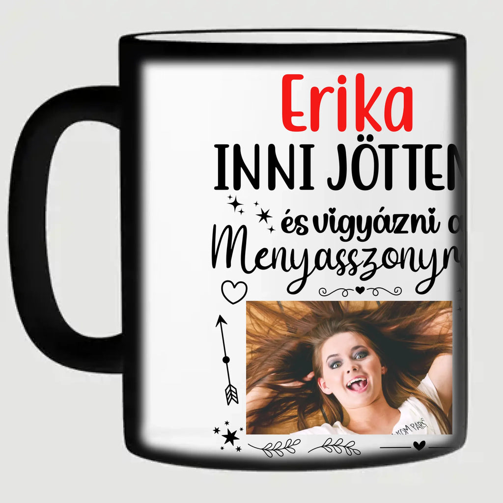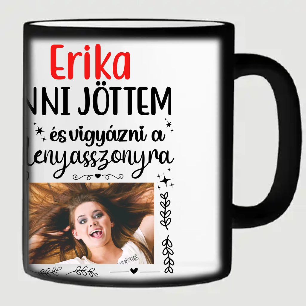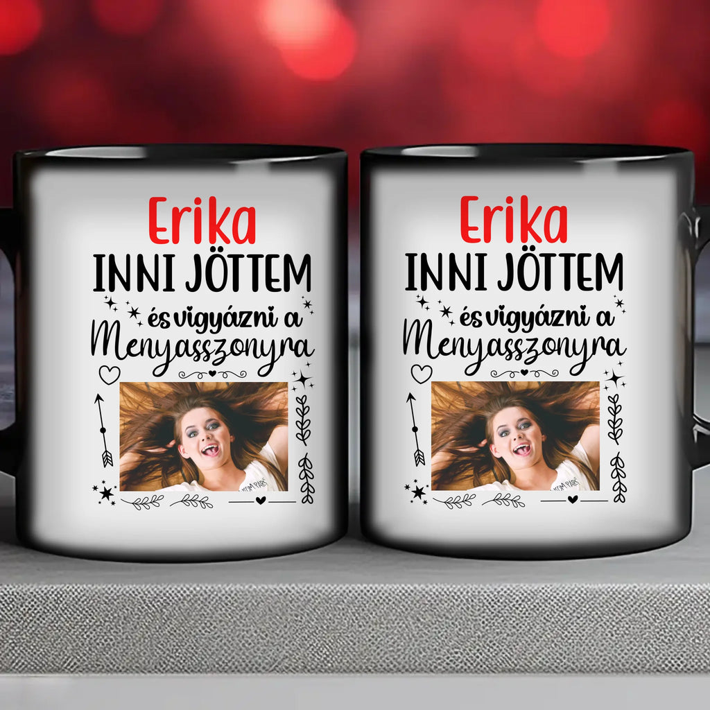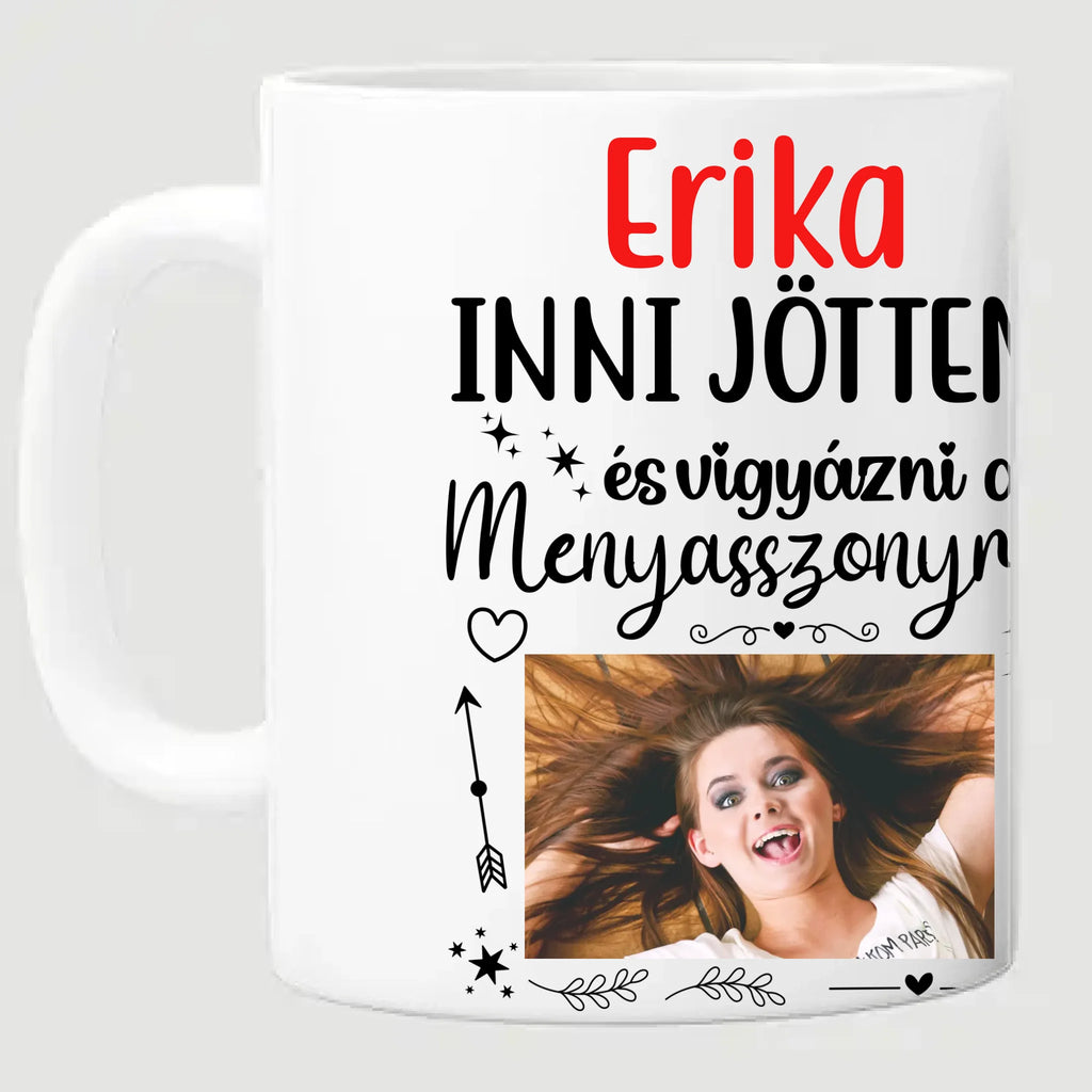 Inni jöttem és vigyázni a menyasszonyra -bögre lánybúcsúra névvel és képpel