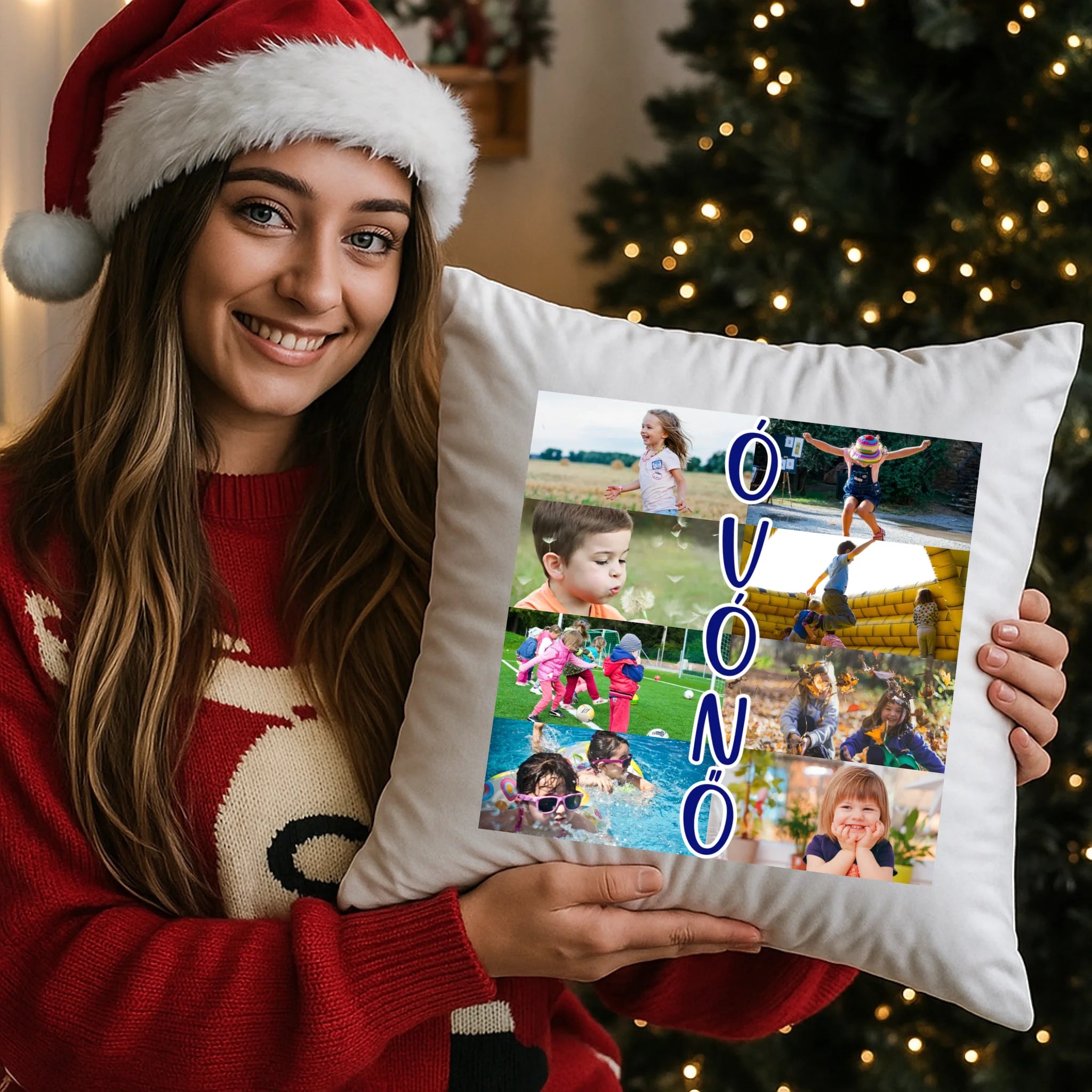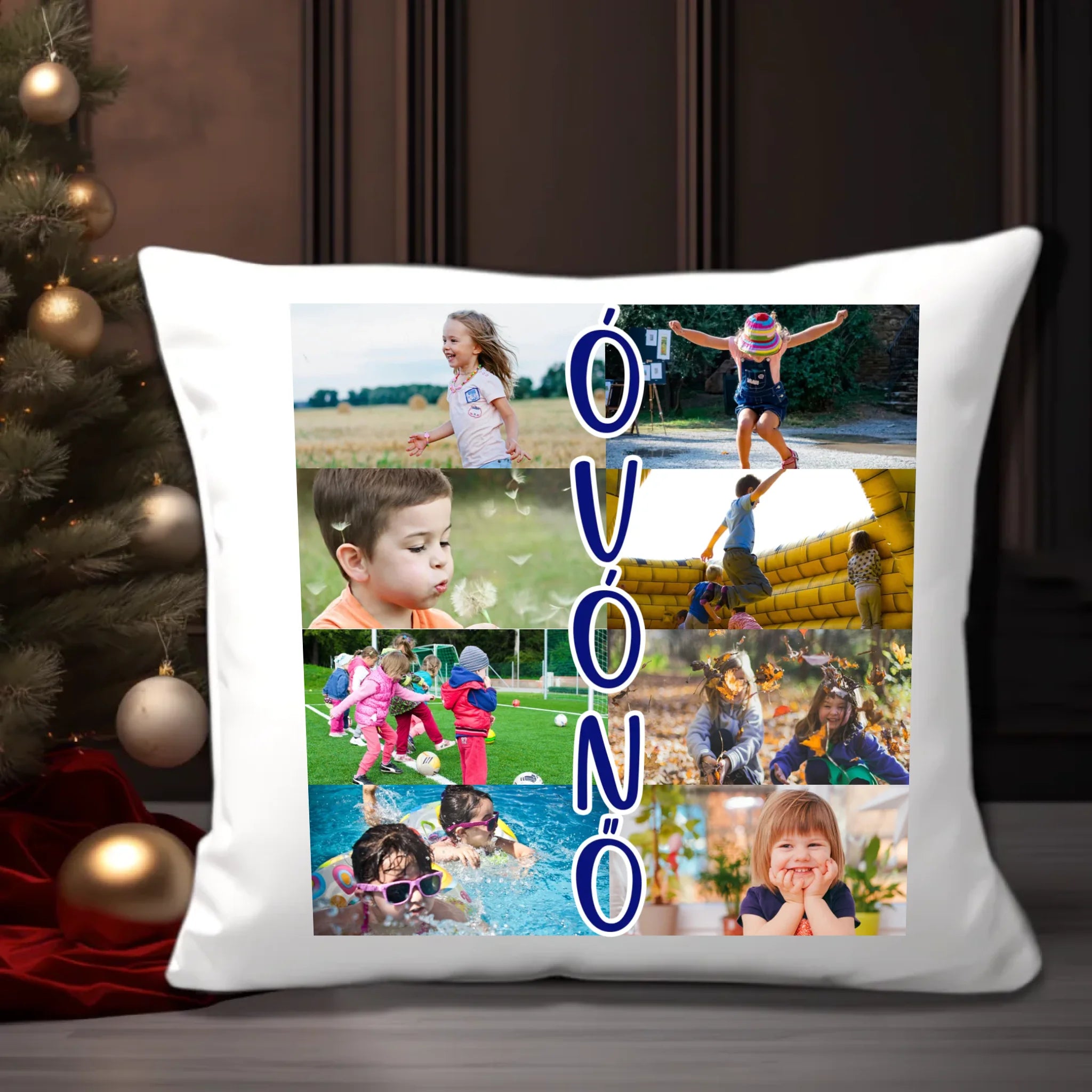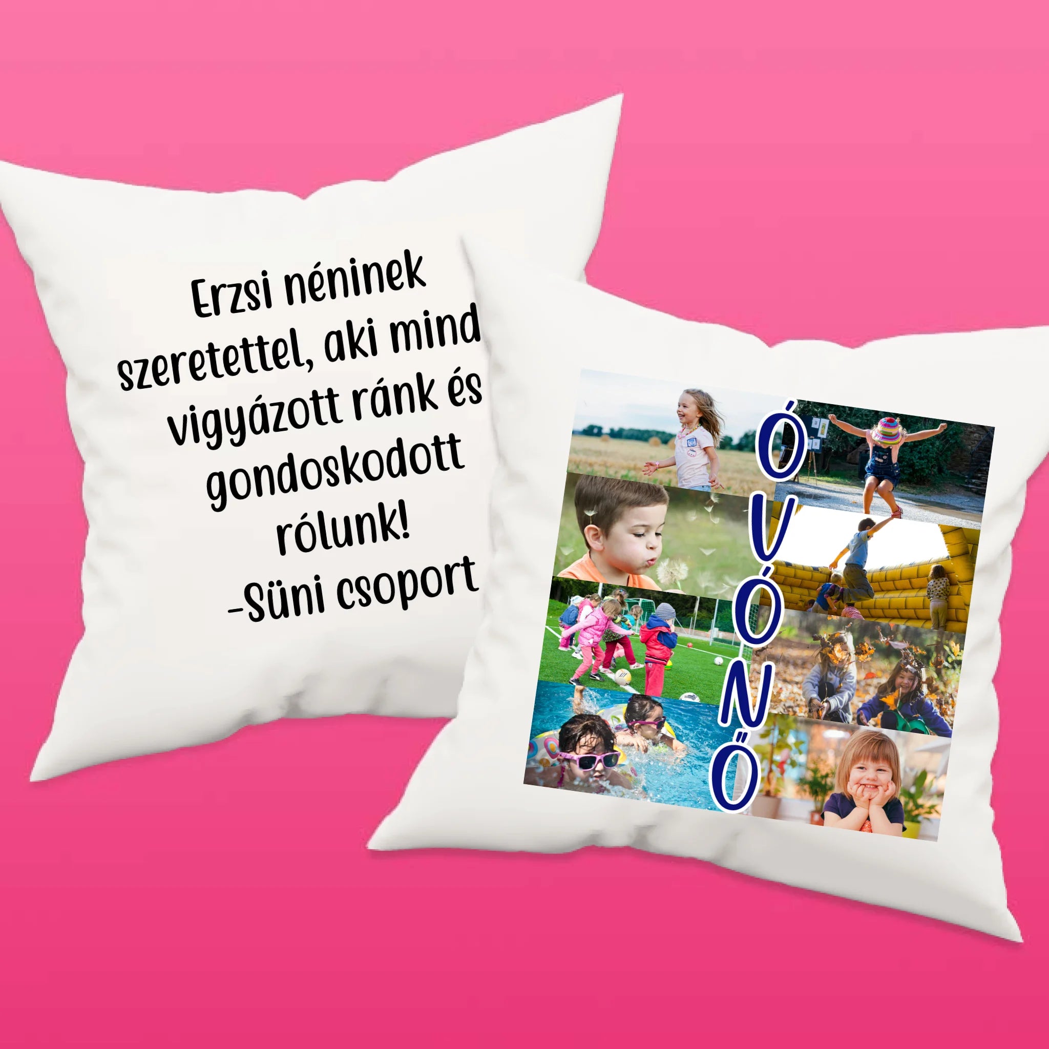 Egyedi fényképes párna 8 képpel óvónőnek, amire a kedvenc közös képeitek töltheted fel, így egy igazán szívhez szóló ajándékot készíthetsz a kedvenc óvónéninek.