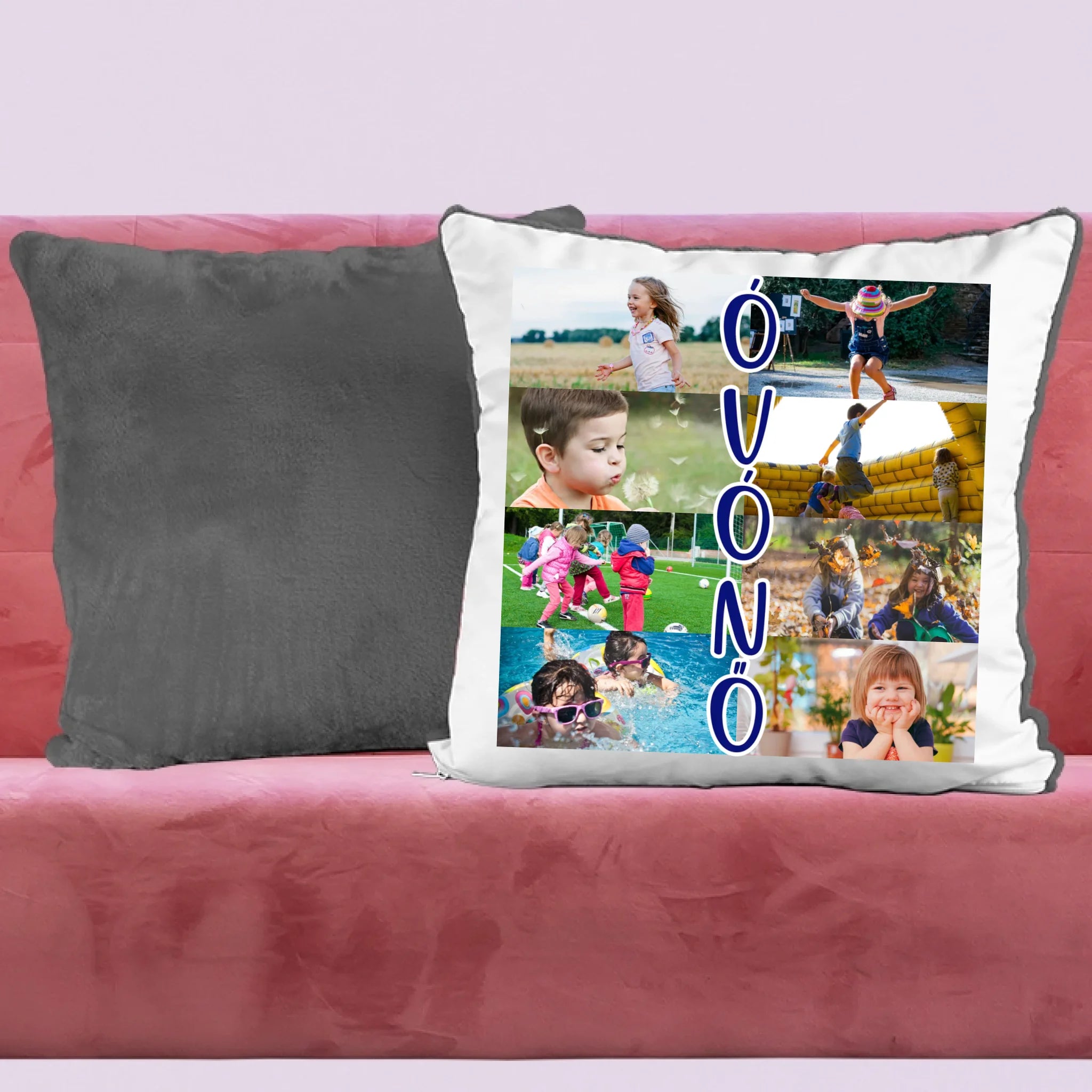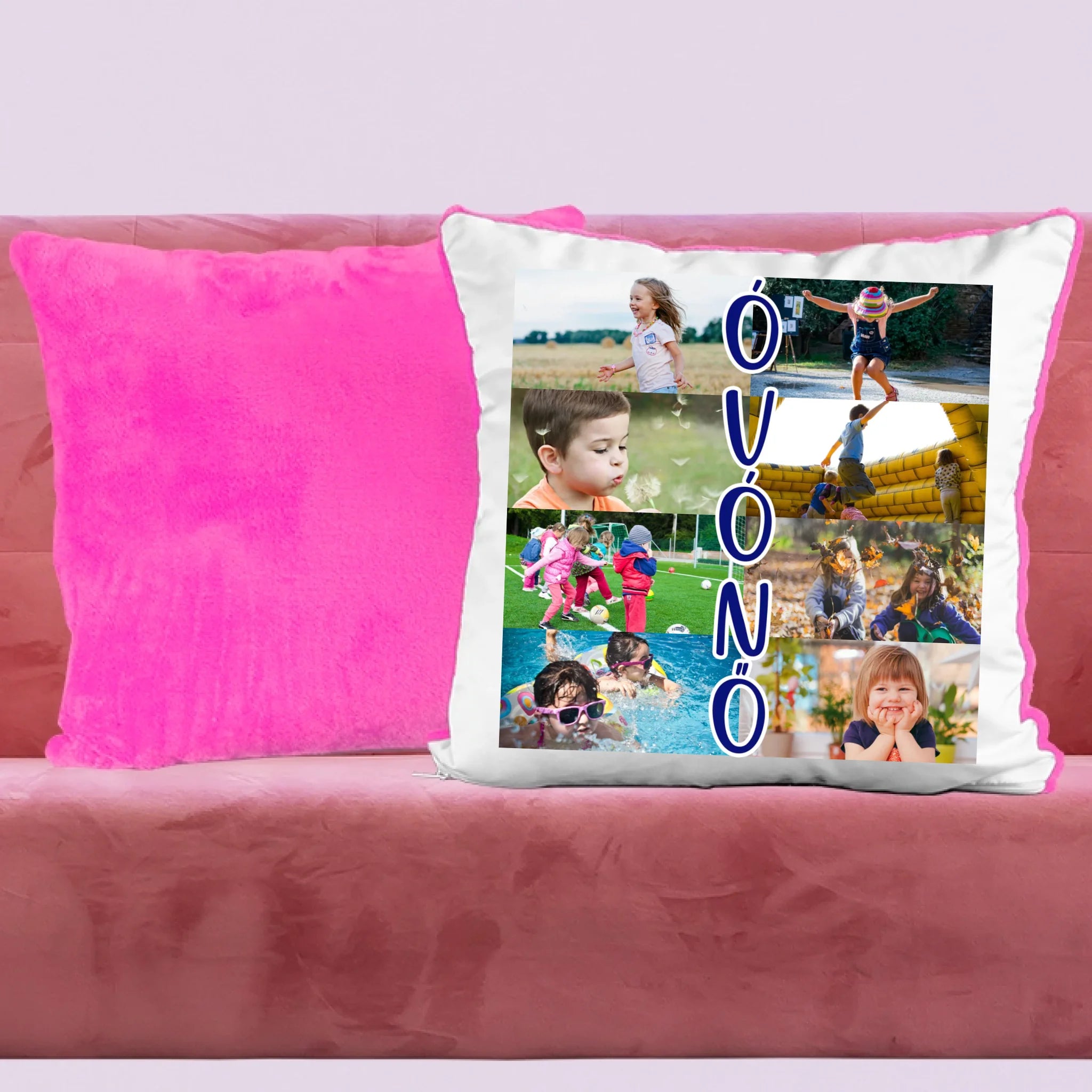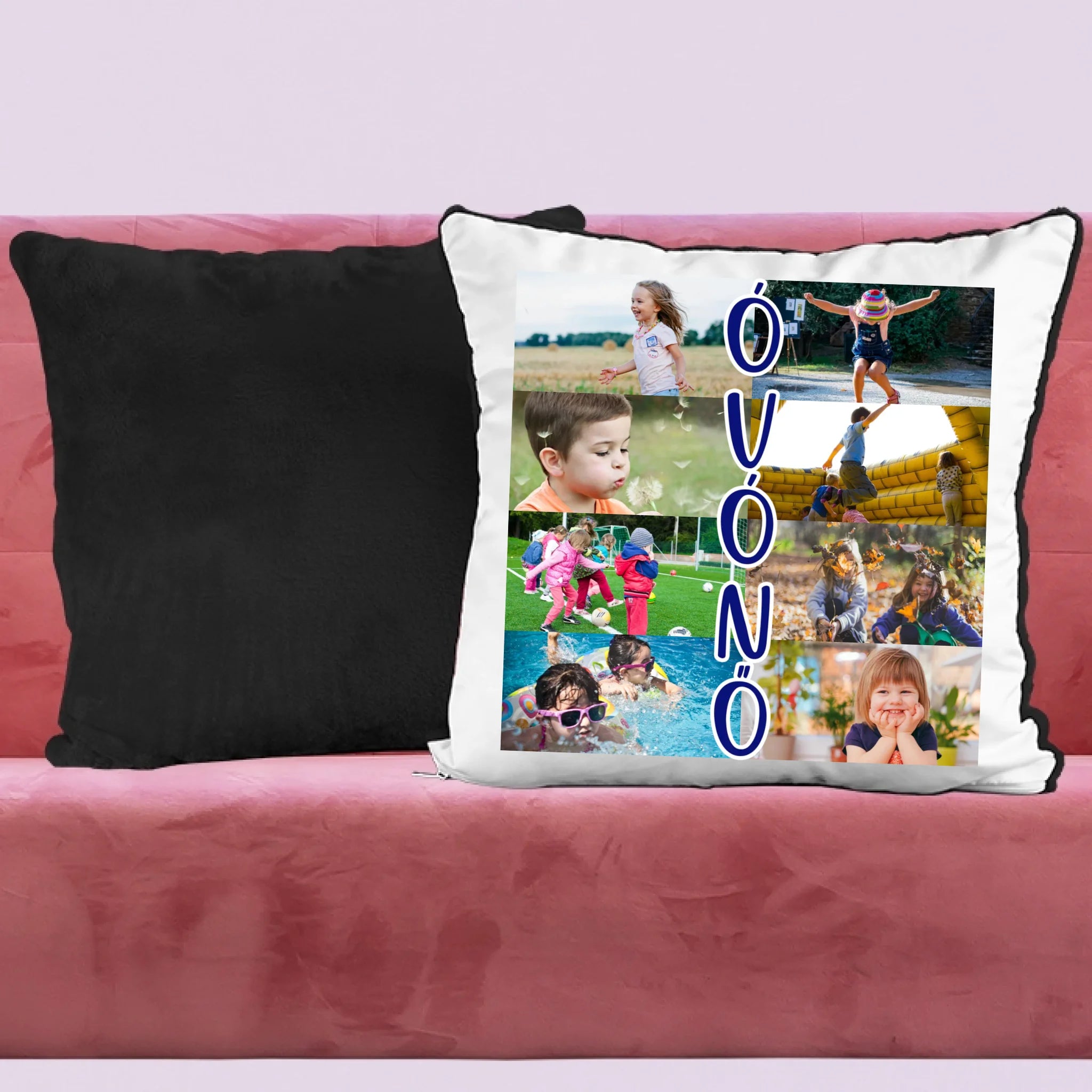 Egyedi fényképes párna 8 képpel óvónőnek, amire a kedvenc közös képeitek töltheted fel, így egy igazán szívhez szóló ajándékot készíthetsz a kedvenc óvónéninek.
