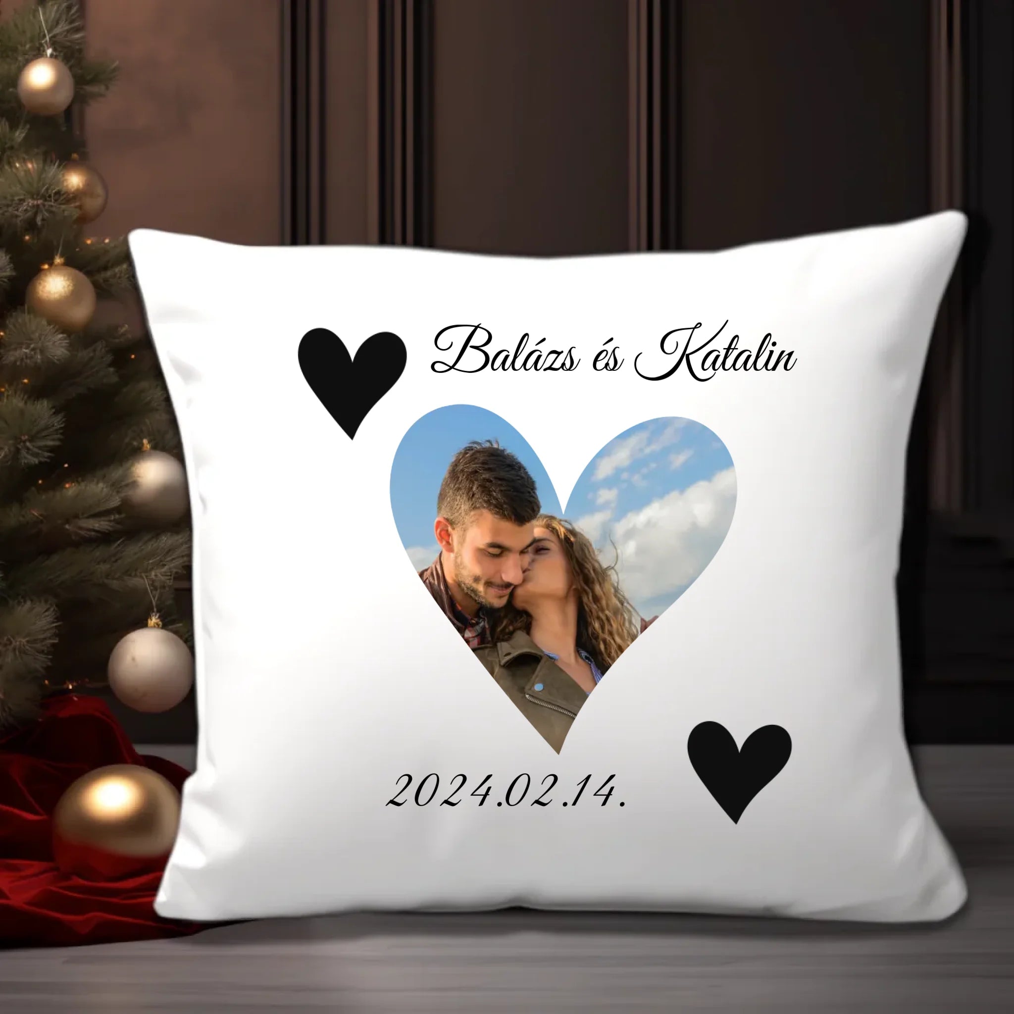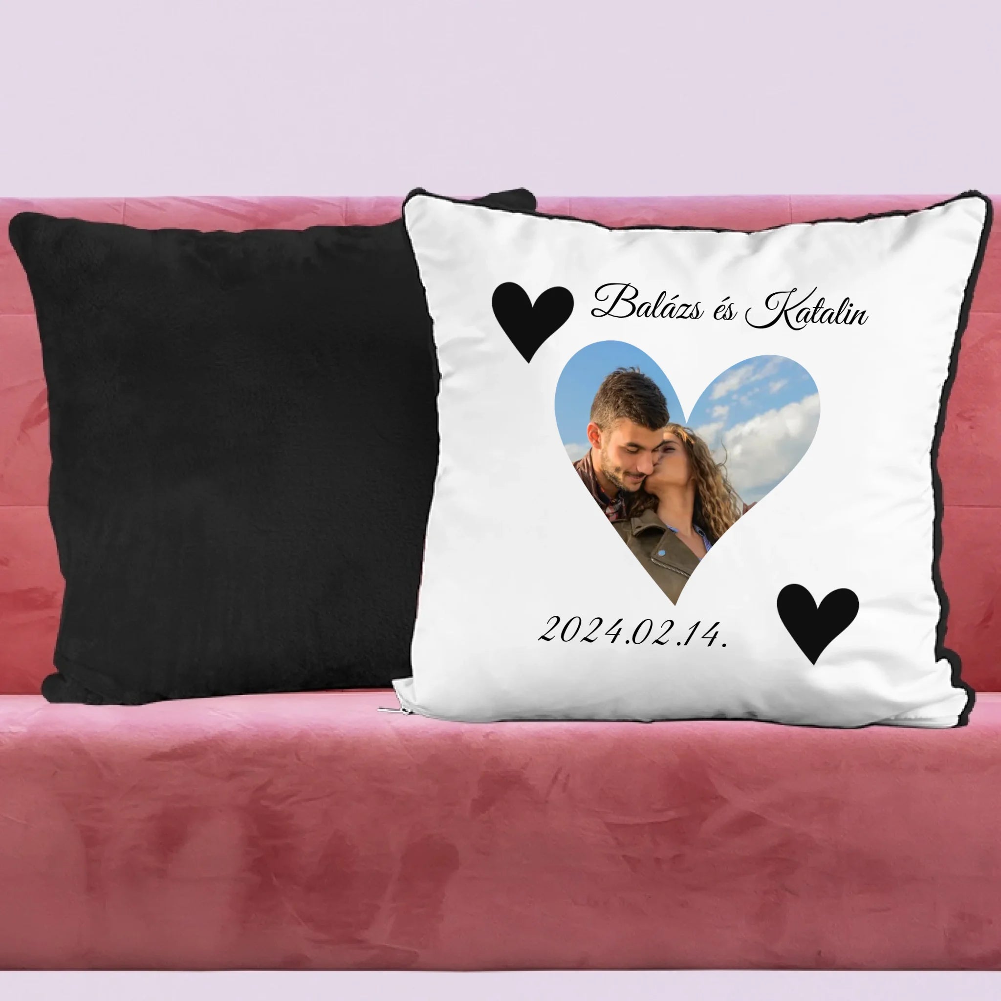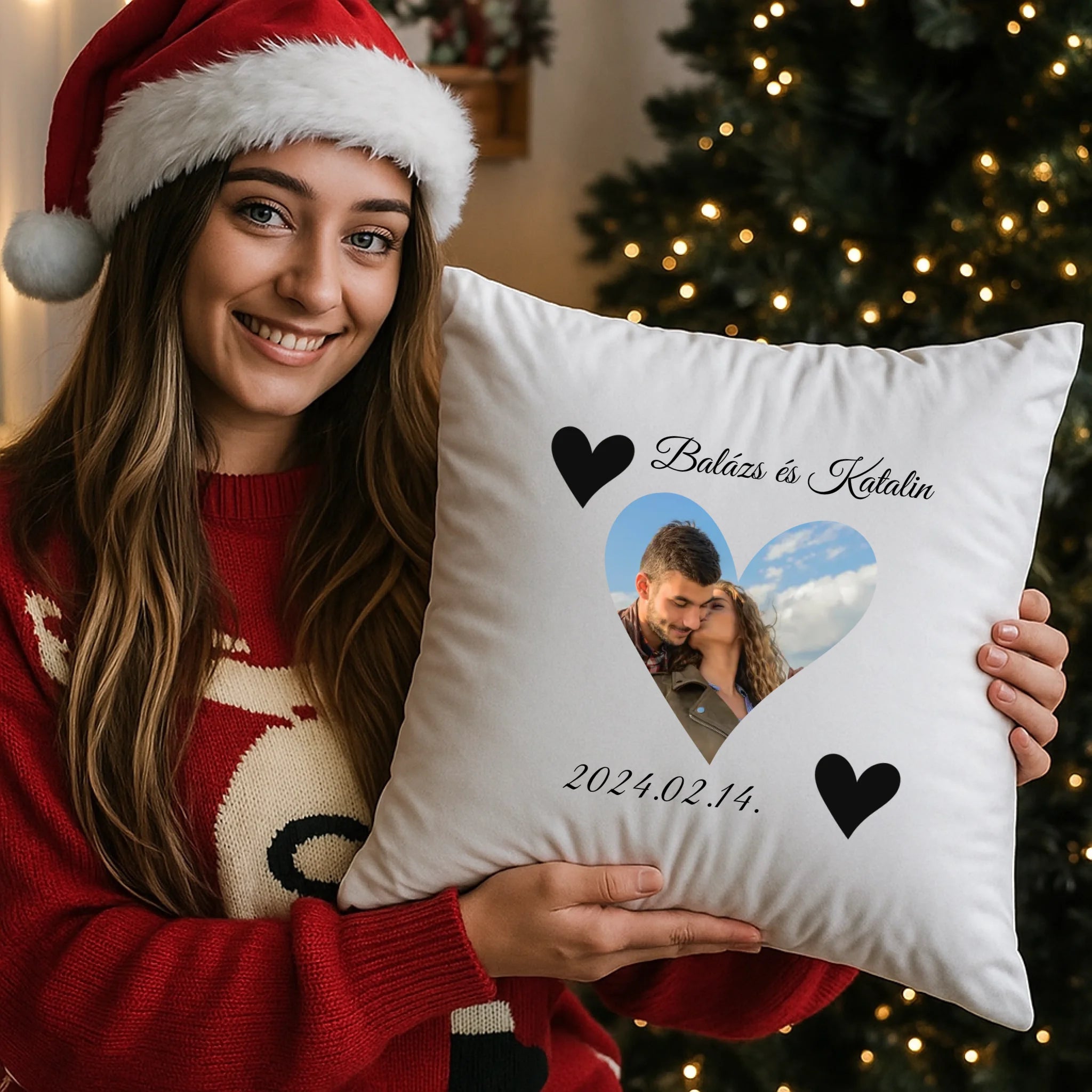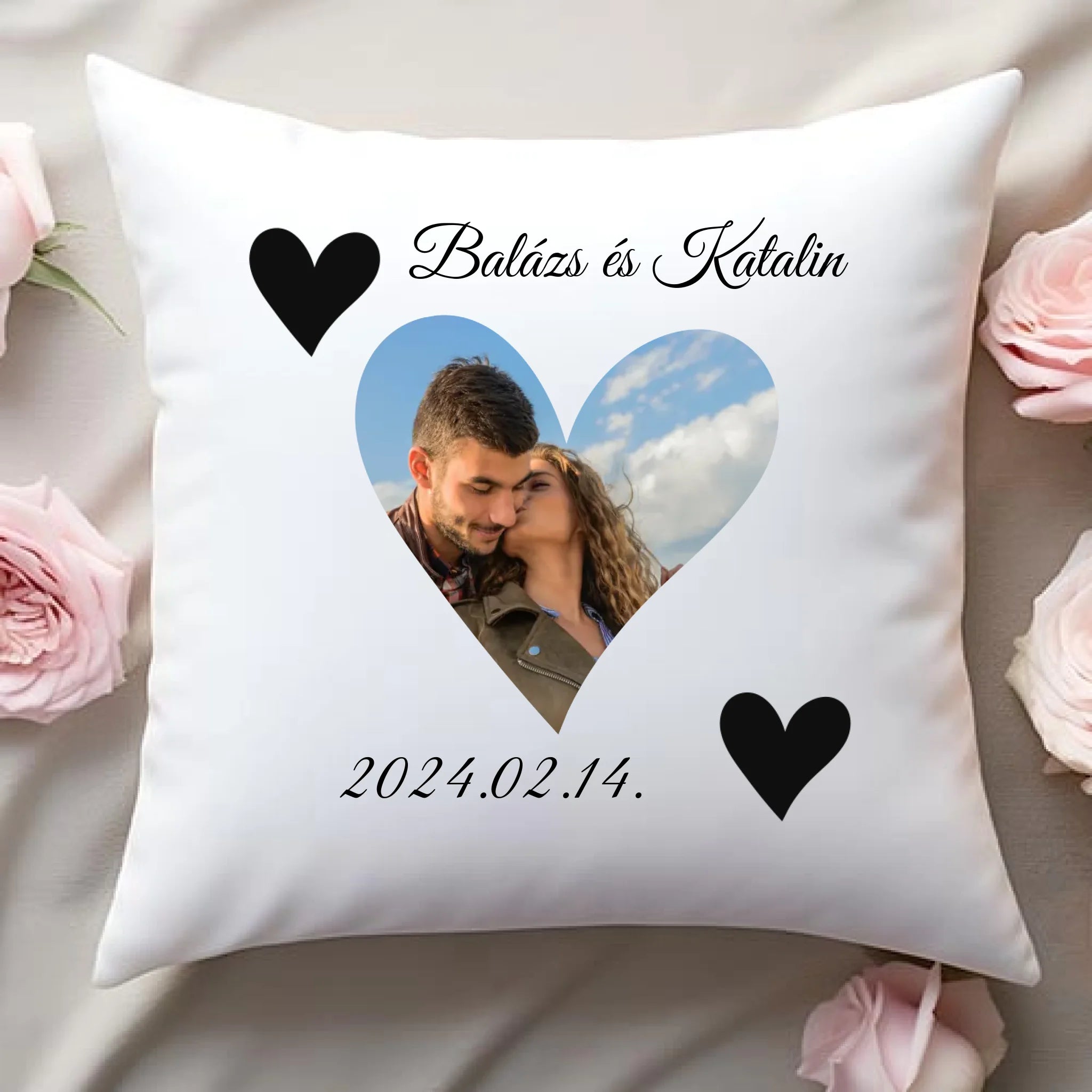 Egyedi párna saját fotóval, ami szív alakúra van vágva.