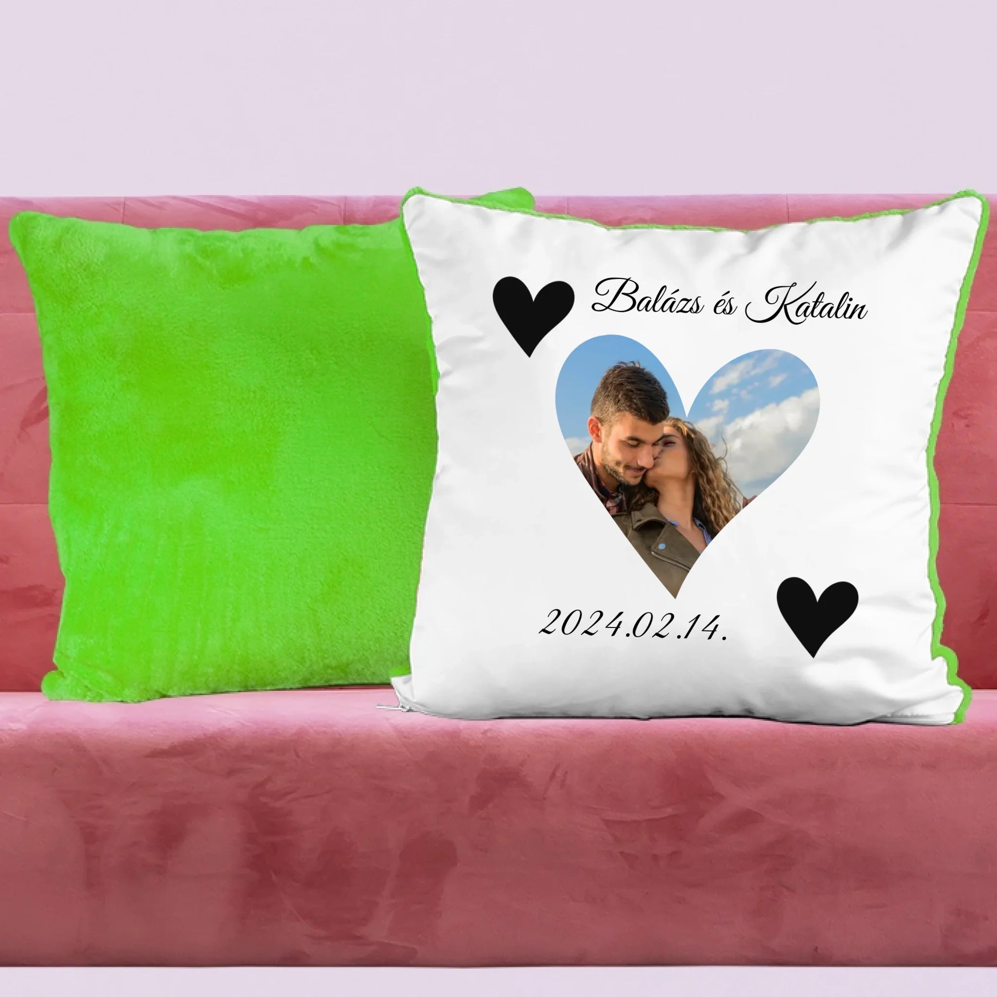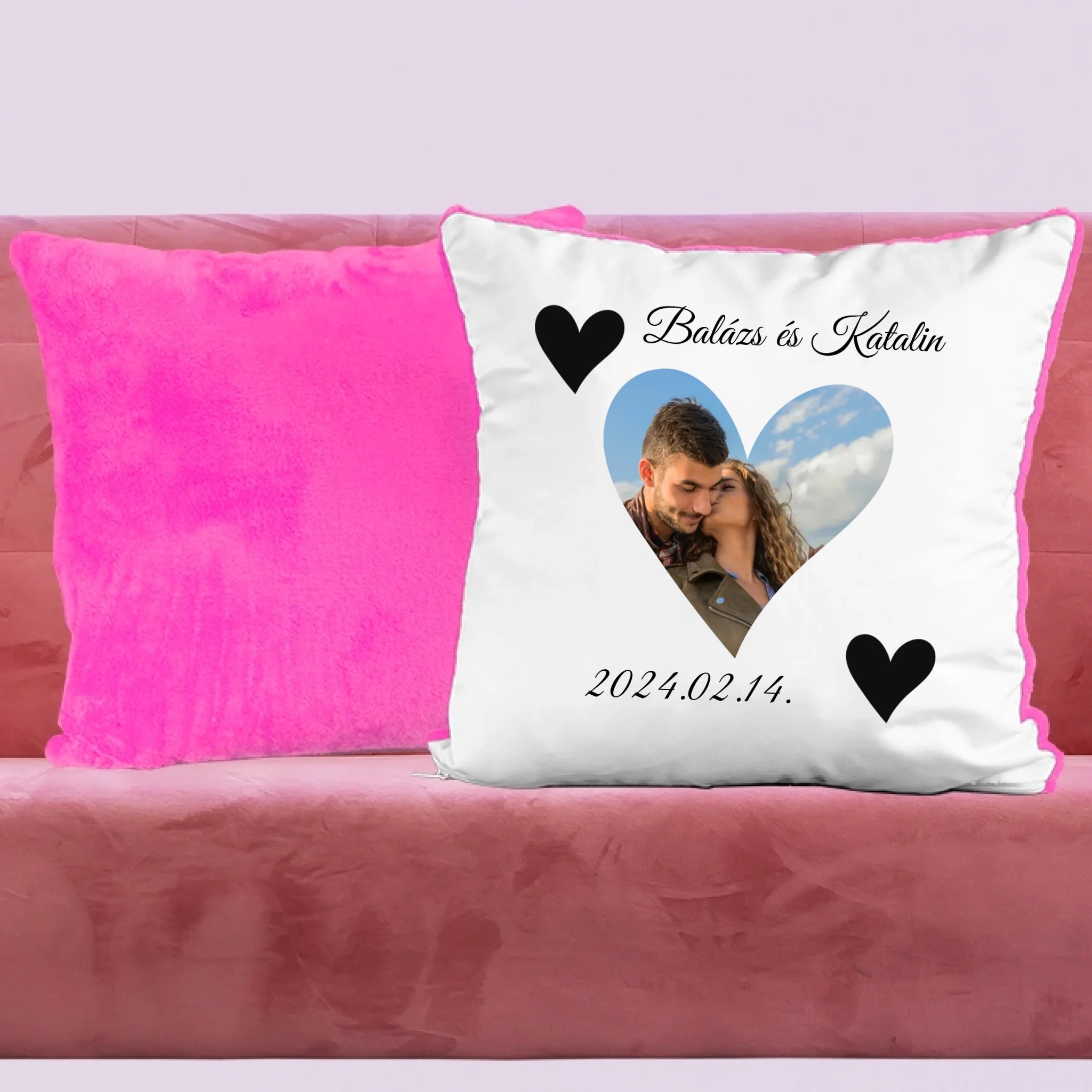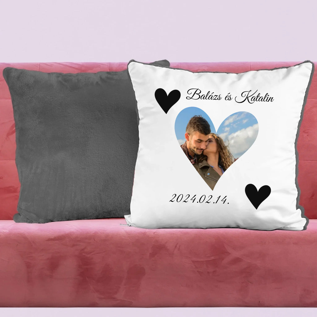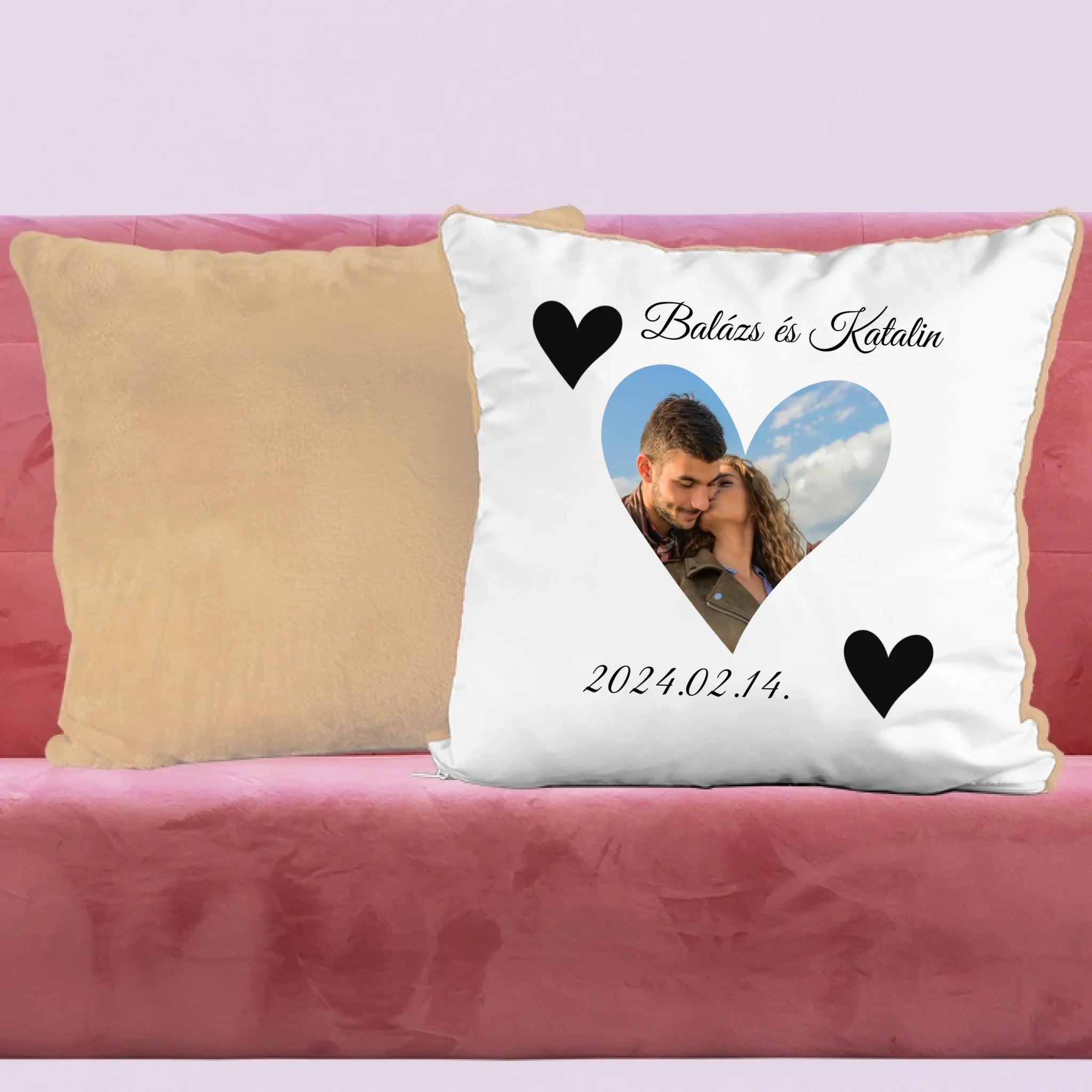 Egyedi párna saját fotóval, ami szív alakúra van vágva.