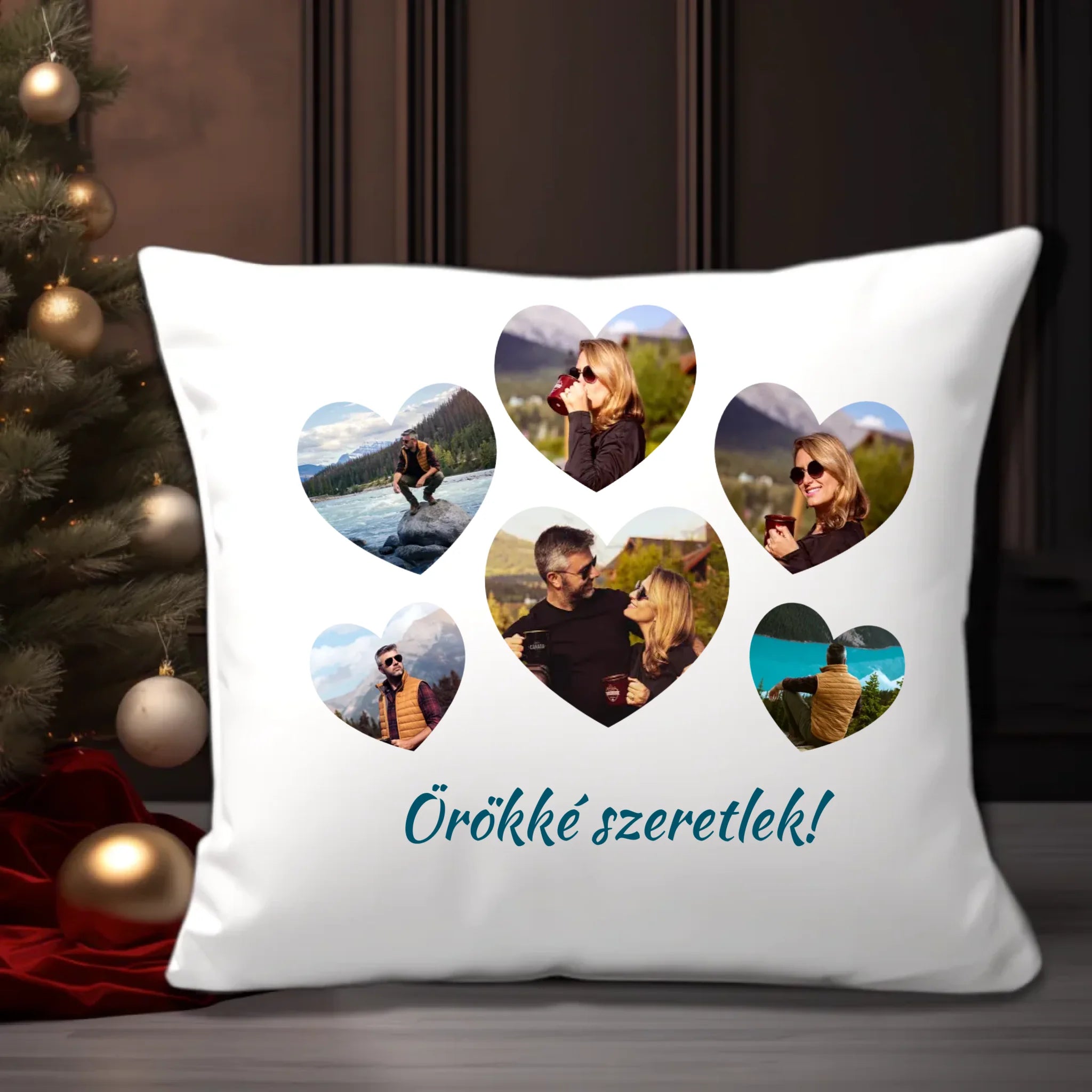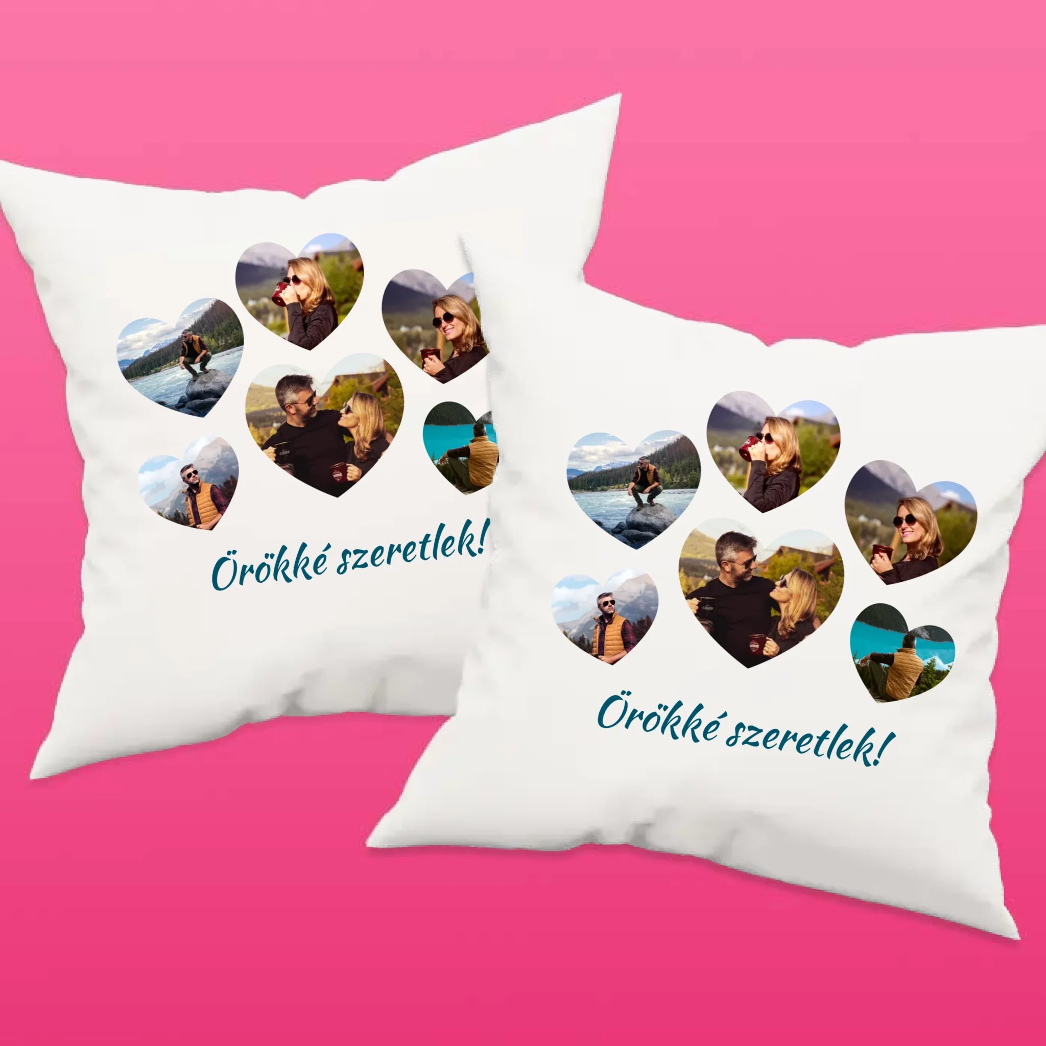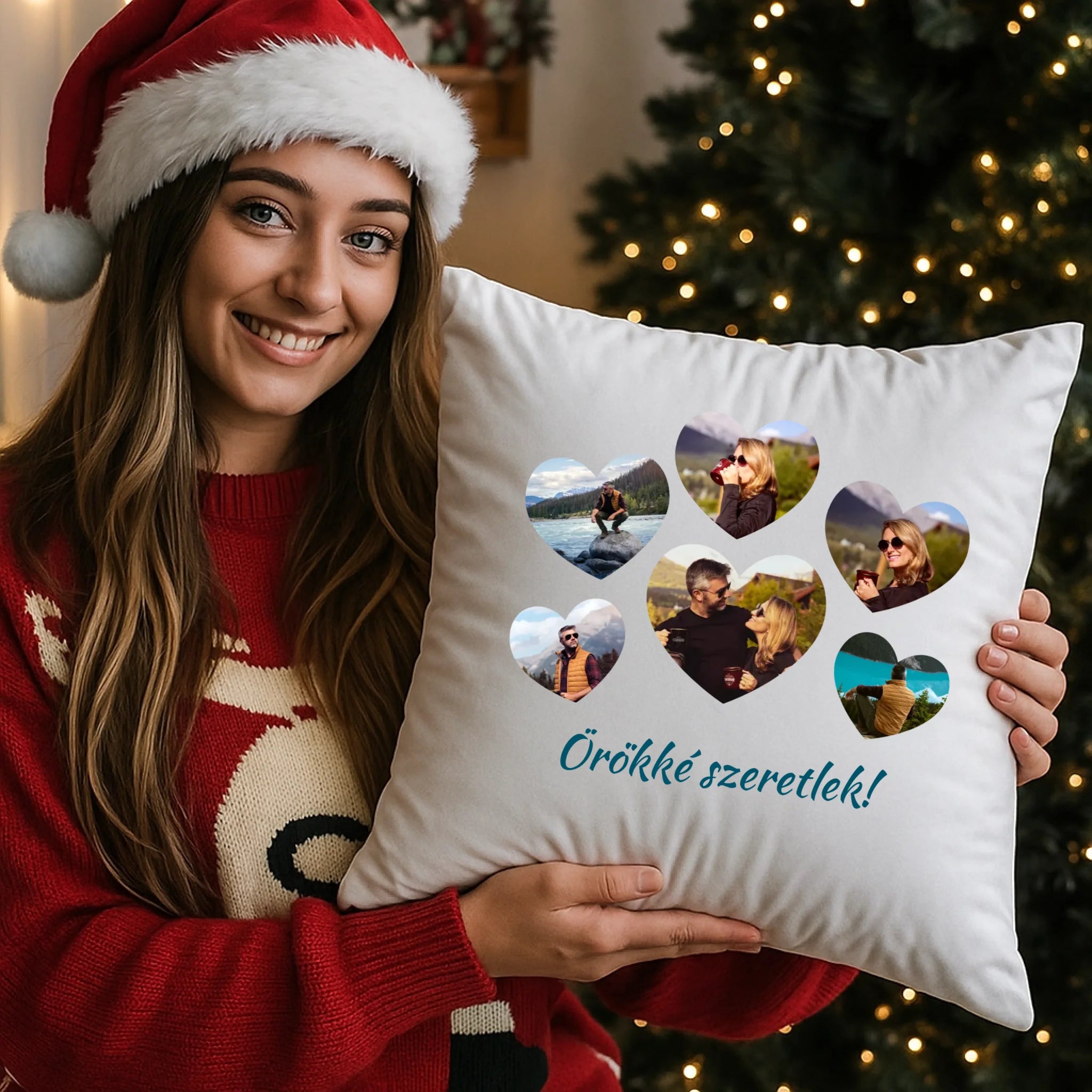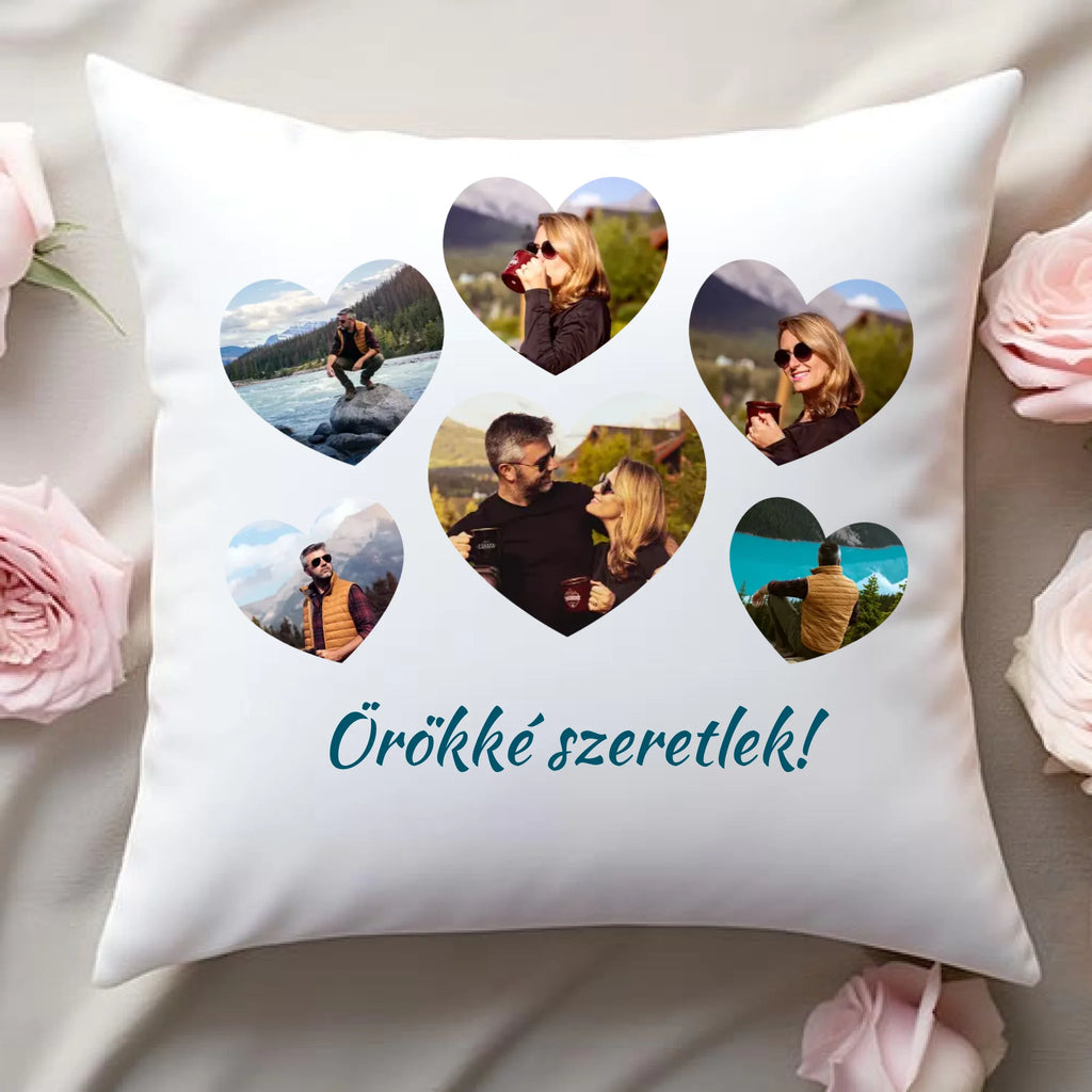 Egyedi fényképes párna 7 saját képpel, amit szív alakúra vágunk