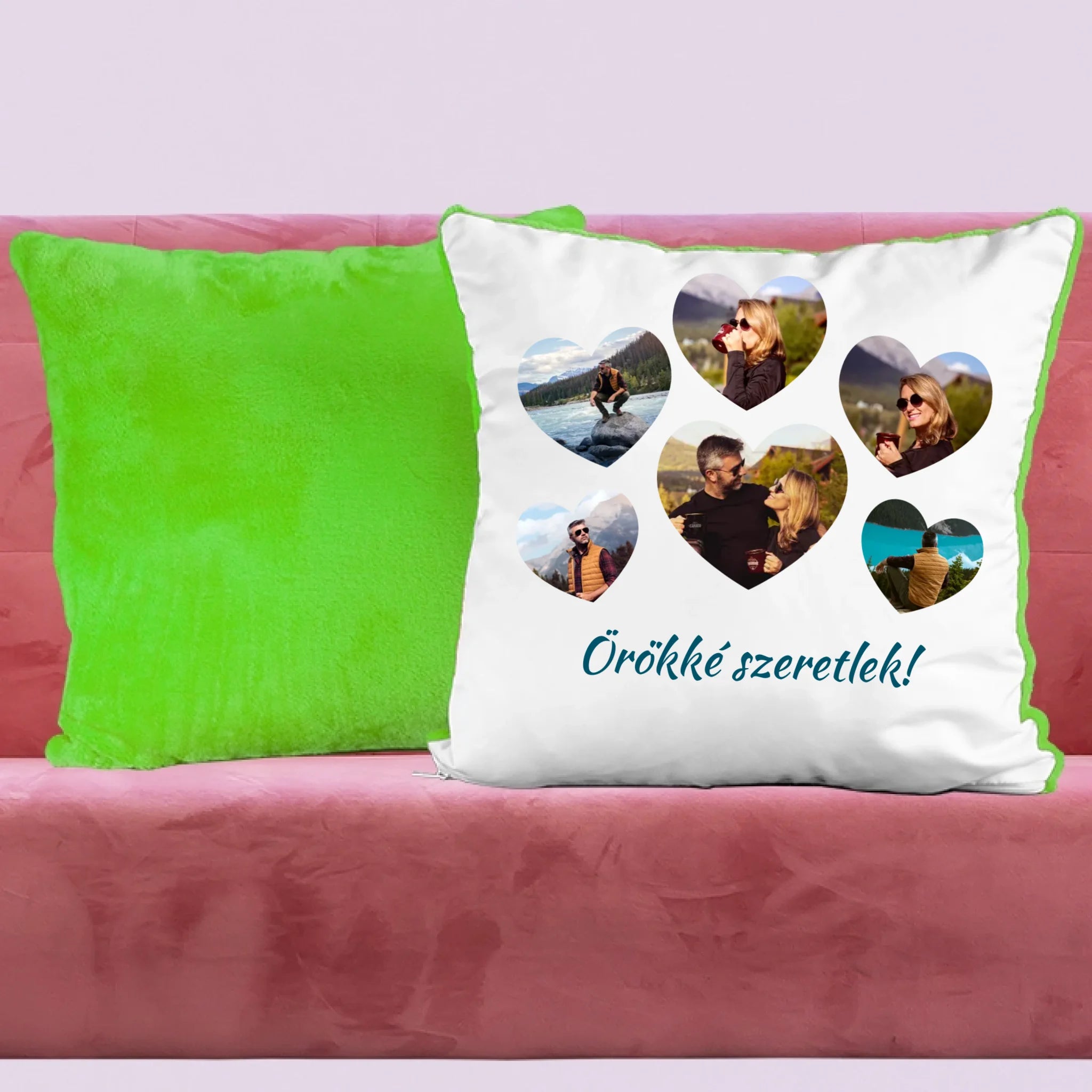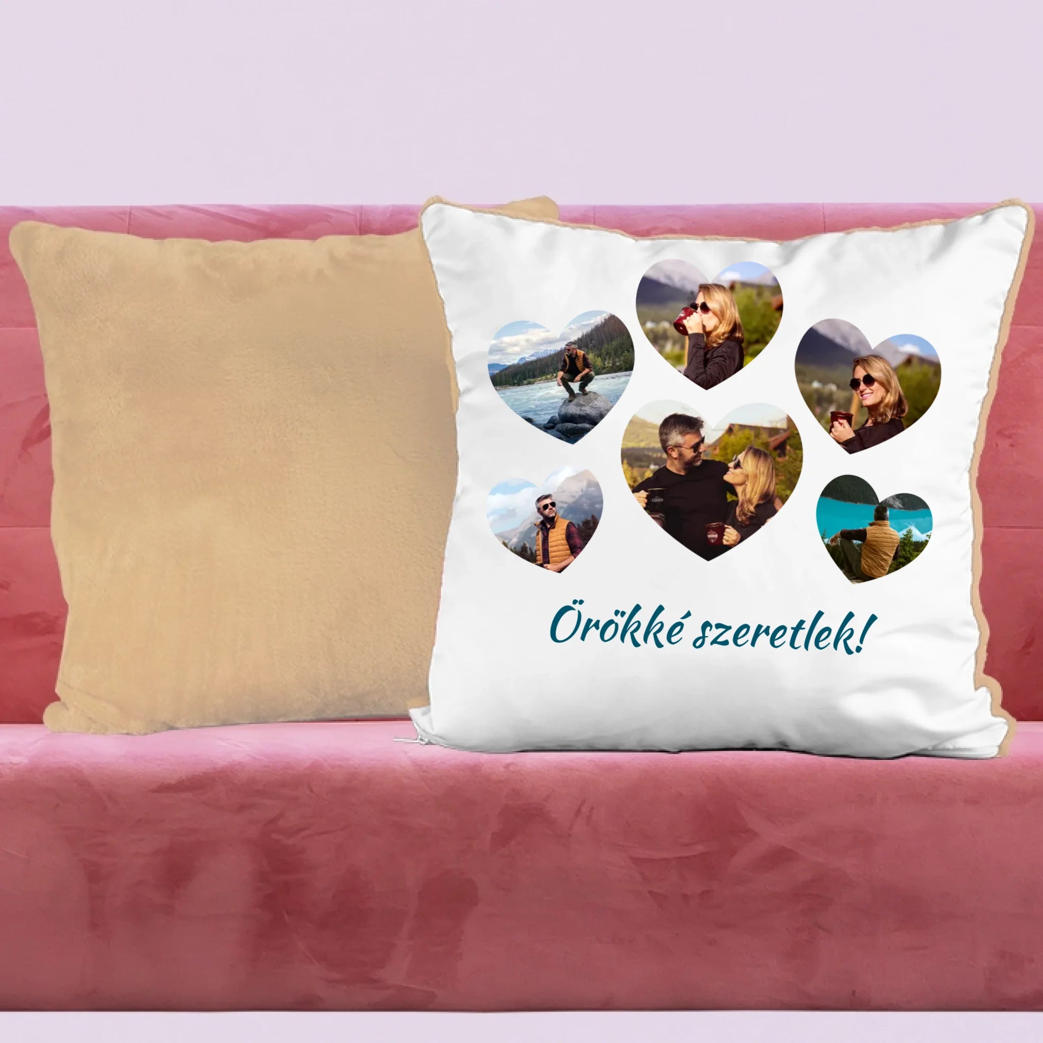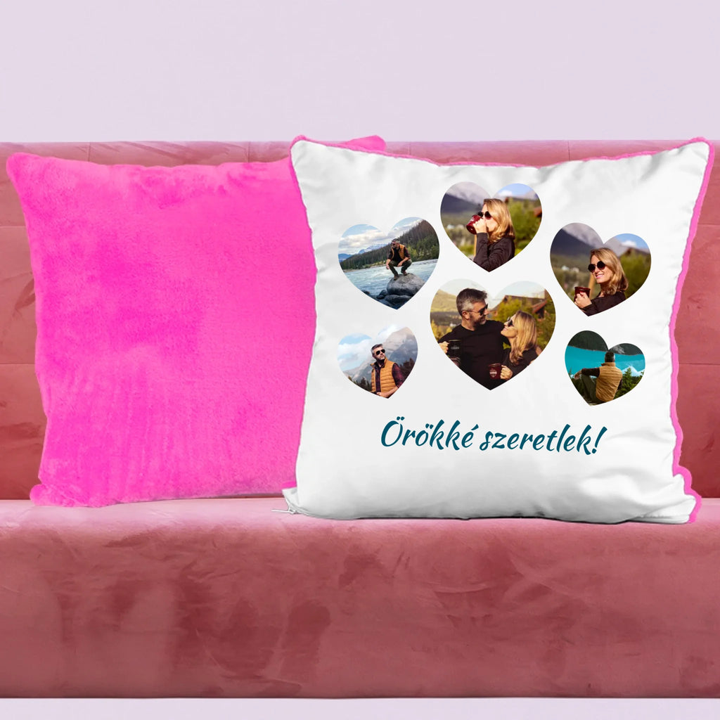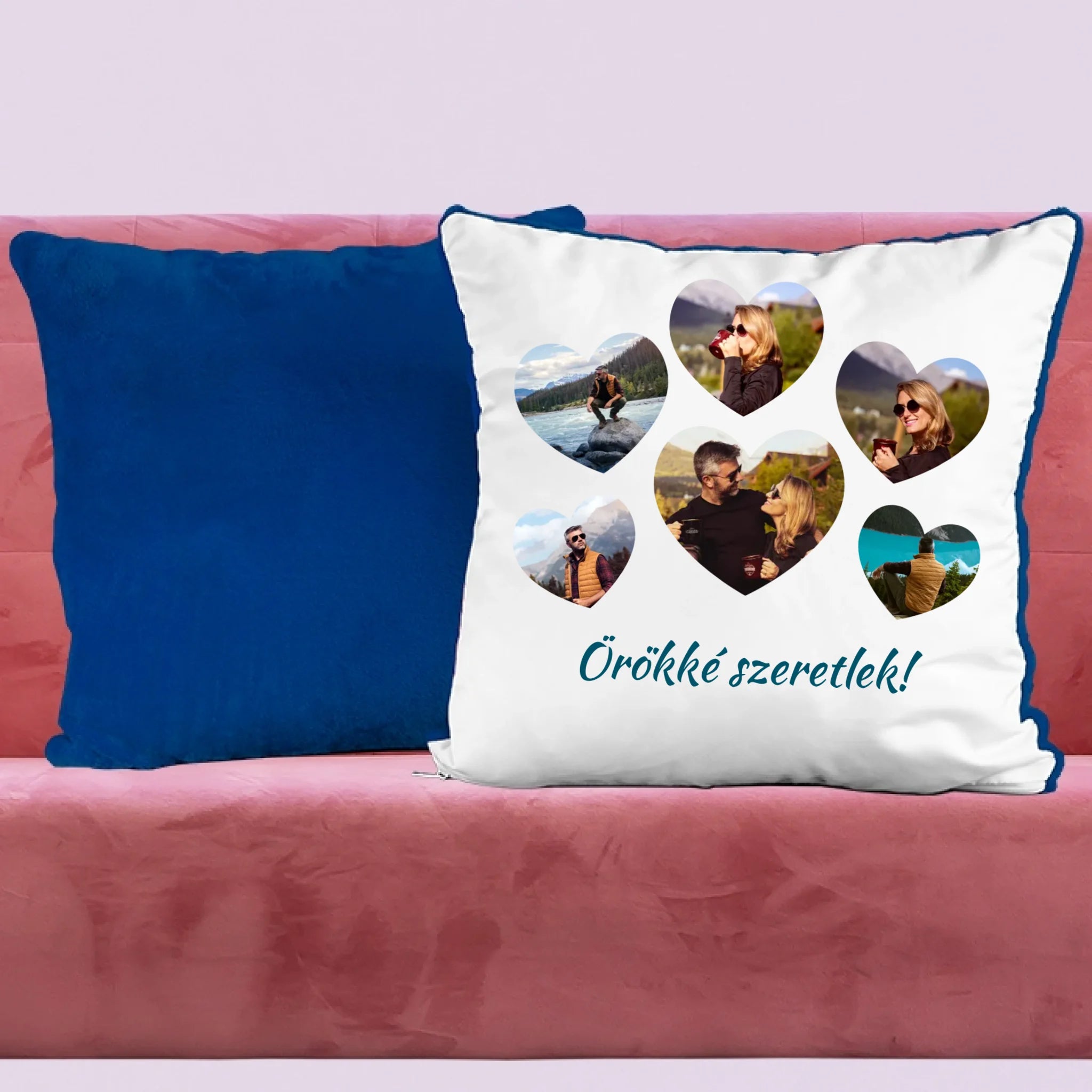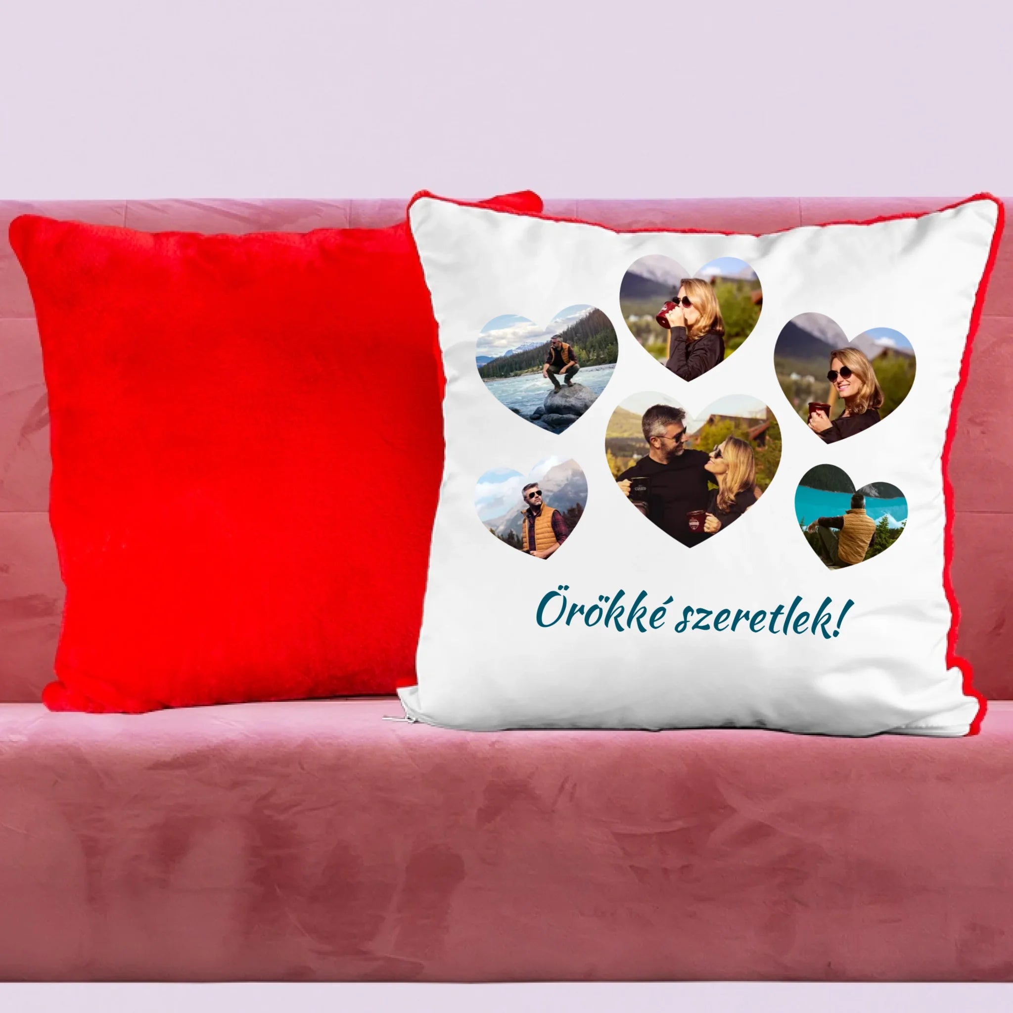 Egyedi fényképes párna 7 saját képpel, amit szív alakúra vágunk