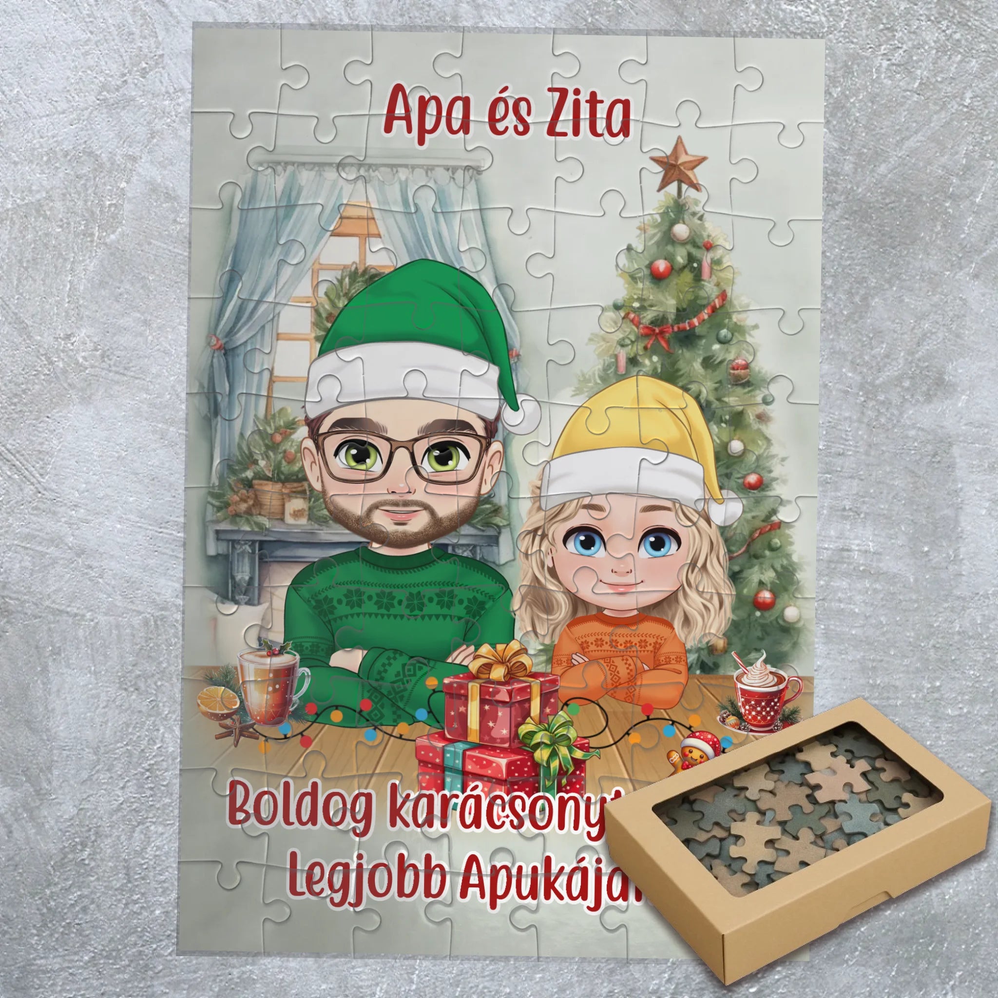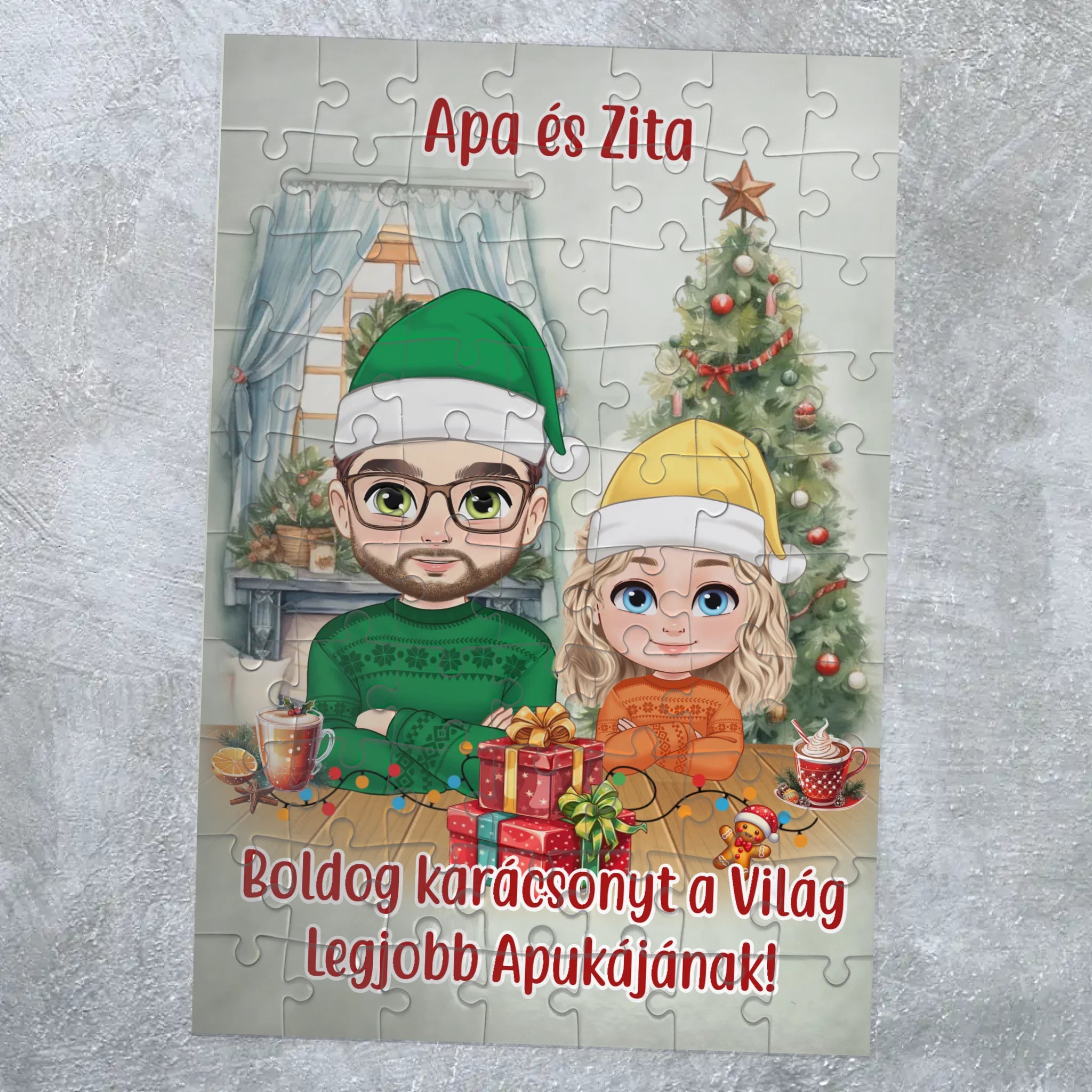 Lepd meg apukádat egyedi karácsonyi puzzle-val, amelyen a család személyre szabható karakterekkel jelenik meg.